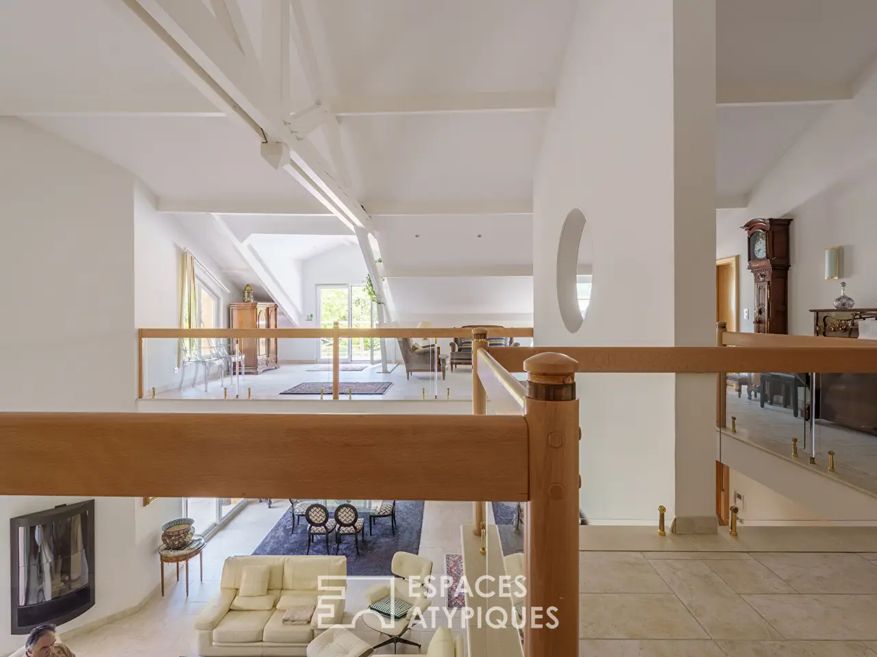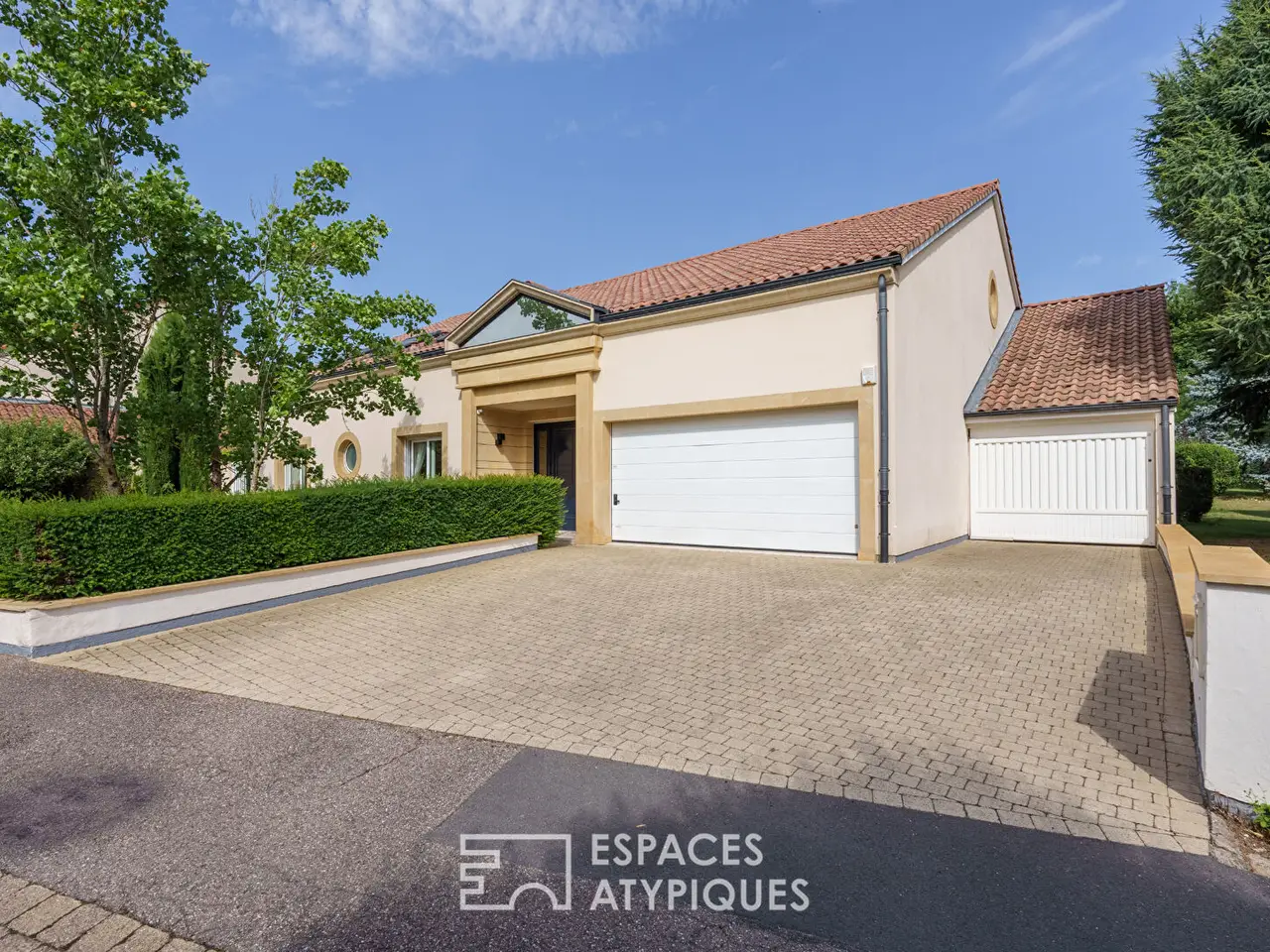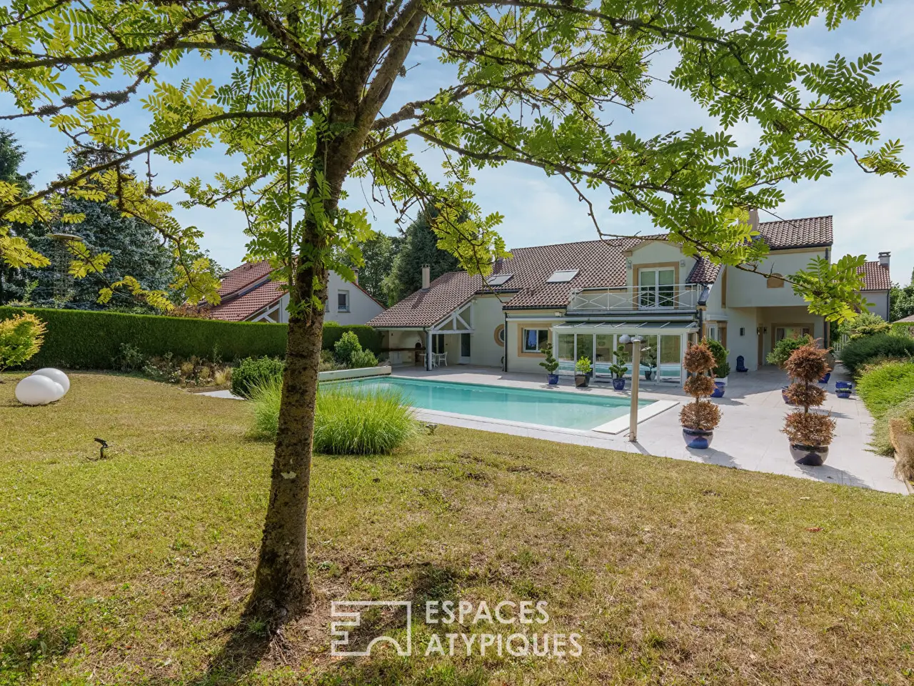 Located in the sought-after town of Sainte-Ruffine, just ten minutes from Metz city centre, this architect-designed house, built by Atelier 3 in the 2000s, offers 376 m2 of living space on a 15-acre wooded plot. Built in a quiet neighbourhood on the edge of a forest, it enjoys a privileged setting and a layout designed to combine comfort, generous volumes and harmonious outdoor living. Its landscaped garden, 12×5 swimming pool with roller shutter, veranda and high-end materials make it a truly unique property.The ground floor opens onto a spacious entrance hall leading to all the rooms.The night wing comprises a study, a bathroom with a spa bath and shower, and a bright bedroom with bay windows. A corridor with a custom-made dressing room connects these rooms seamlessly. The living area is centred around a living room with 7-metre-high ceilings, a dining room and a separate, fully fitted and equipped kitchen. These rooms open onto a light-filled veranda. The ground floor also includes a laundry room, direct access to a double garage and a single garage.The marble staircase leading to the first floor opens onto a mezzanine with a private terrace overlooking the garden and forest. This leads to a large multipurpose room and a second adjoining room, two bedrooms and a half-level room that can be used as a dressing room or office. The first floor is completed by a shower room.Outside, the house is set in lush green surroundings. The generously sized swimming pool opens onto a terrace, ideal for relaxing. A summer kitchen with a wood-burning oven extends the reception areas. The carefully maintained garden provides a beautiful continuity between the house and nature. A utility room completes the outdoor facilities. The house benefits from its close proximity to schools, shops and sports facilities in the Metz metropolitan area.With its distinctive architecture, high-end amenities, impressive volumes and sought-after location, this family home will appeal to property enthusiasts looking for space, tranquillity and uniqueness.Shops 4 minutes away by carNursery and primary schools 5 minutes away on footMotorway access 7 minutes away by carREF. 562Additional information* 8 rooms* 4 bedrooms* 2 bathrooms* 1 bathroom* Outdoor space : 1489 SQM* Parking : 5 parking spaces* Property tax : 3 500 €Energy Performance CertificatePrimary energy consumptionc : 122 kWh/m2.yearHigh performance housing*A*B*122kWh/m2.year25*kg CO2/m2.yearC*D*E*F*GExtremely poor housing performance* Of which greenhouse gas emissionsc : 25 kg CO2/m2.yearLow CO2 emissions*A*B*25kg CO2/m2.yearC*D*E*F*GVery high CO2 emissionsEstimated average annual energy costs for standard use, indexed to specific years 2021, 2022, 2023 : between 3940 € and 5380 € Subscription IncludedAgency feesThe fees include VAT and are payable by the vendorMediatorMediation Franchise-Consommateurswww.mediation-franchise.com29 Boulevard de Courcelles 75008 ParisInformation on the risks to which this property is exposed is available on the Geohazards website : www.georisques.gouv.fr