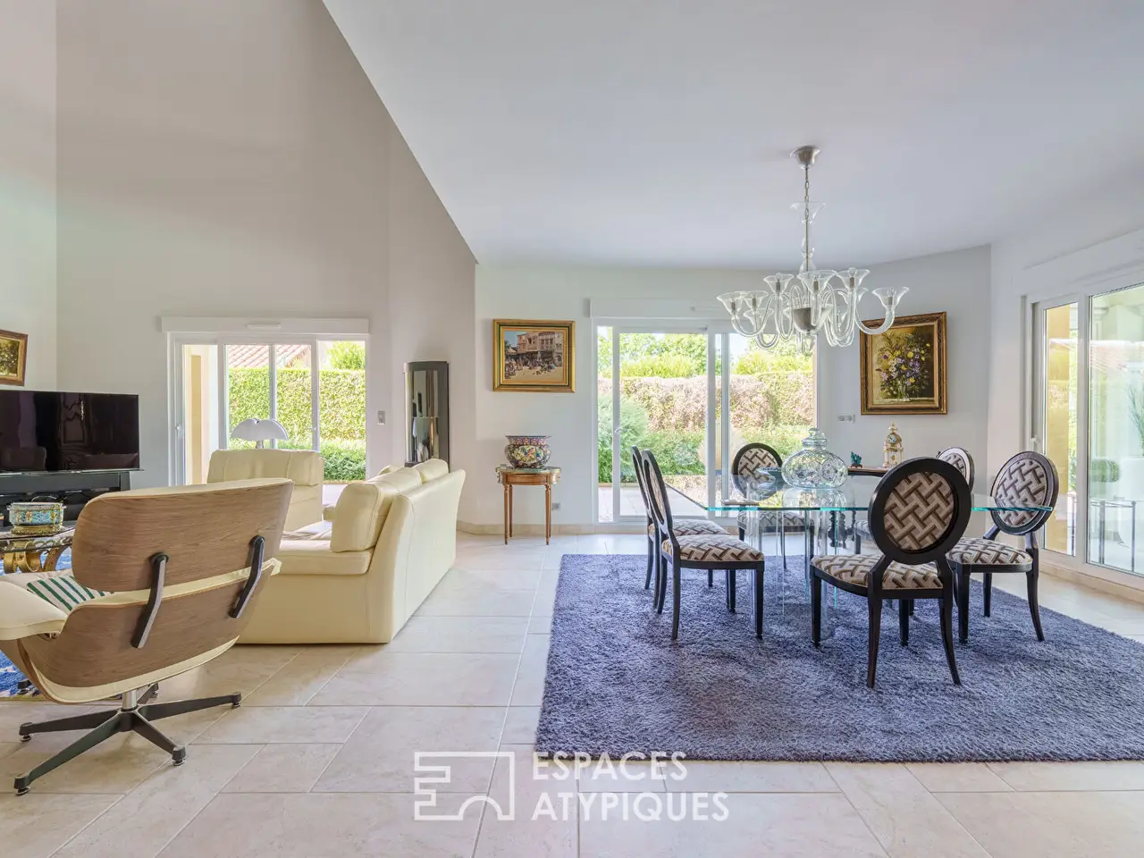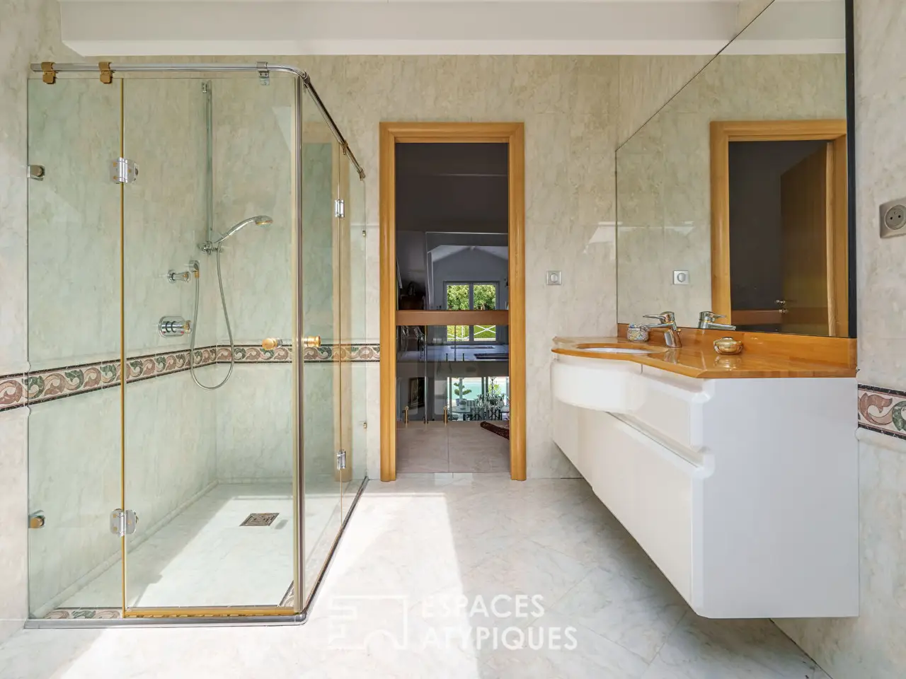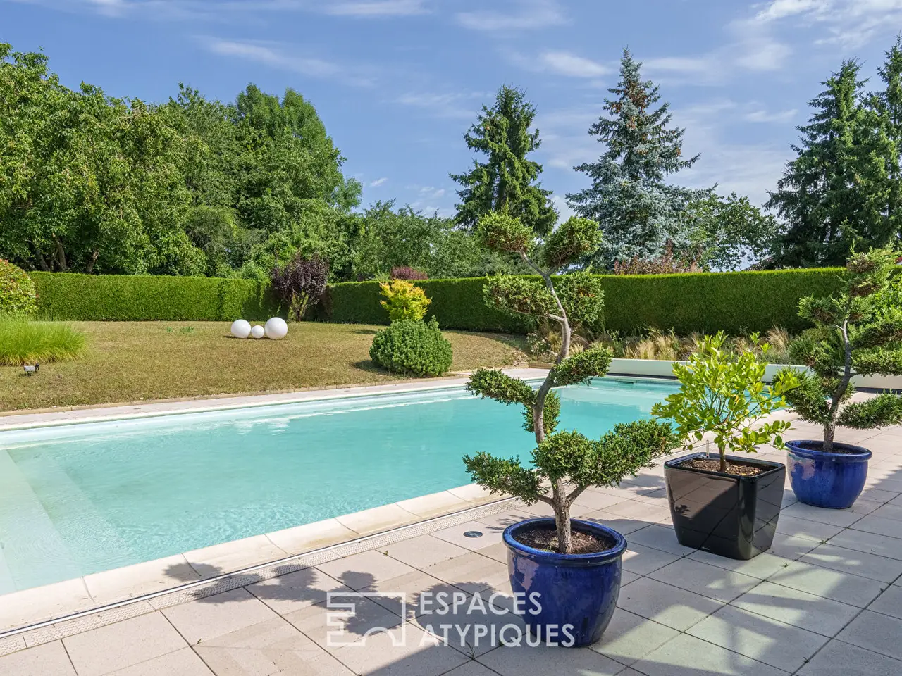 Located in the sought-after town of Sainte-Ruffine, just ten minutes from Metz city centre, this architect-designed house, built by Atelier 3 in the 2000s, offers 376 m2 of living space on a 15-acre wooded plot. Built in a quiet neighbourhood on the edge of a forest, it enjoys a privileged setting and a layout designed to combine comfort, generous volumes and harmonious outdoor living. Its landscaped garden, 12×5 swimming pool with roller shutter, veranda and high-end materials make it a truly unique property.The ground floor opens onto a spacious entrance hall leading to all the rooms.The night wing comprises a study, a bathroom with a spa bath and shower, and a bright bedroom with bay windows. A corridor with a custom-made dressing room connects these rooms seamlessly. The living area is centred around a living room with 7-metre-high ceilings, a dining room and a separate, fully fitted and equipped kitchen. These rooms open onto a light-filled veranda. The ground floor also includes a laundry room, direct access to a double garage and a single garage.The marble staircase leading to the first floor opens onto a mezzanine with a private terrace overlooking the garden and forest. This leads to a large multipurpose room and a second adjoining room, two bedrooms and a half-level room that can be used as a dressing room or office. The first floor is completed by a shower room.Outside, the house is set in lush green surroundings. The generously sized swimming pool opens onto a terrace, ideal for relaxing. A summer kitchen with a wood-burning oven extends the reception areas. The carefully maintained garden provides a beautiful continuity between the house and nature. A utility room completes the outdoor facilities. The house benefits from its close proximity to schools, shops and sports facilities in the Metz metropolitan area.With its distinctive architecture, high-end amenities, impressive volumes and sought-after location, this family home will appeal to property enthusiasts looking for space, tranquillity and uniqueness.Shops 4 minutes away by carNursery and primary schools 5 minutes away on footMotorway access 7 minutes away by carREF. 562Additional information* 8 rooms* 4 bedrooms* 2 bathrooms* 1 bathroom* Outdoor space : 1489 SQM* Parking : 5 parking spaces* Property tax : 3 500 €Energy Performance CertificatePrimary energy consumptionc : 122 kWh/m2.yearHigh performance housing*A*B*122kWh/m2.year25*kg CO2/m2.yearC*D*E*F*GExtremely poor housing performance* Of which greenhouse gas emissionsc : 25 kg CO2/m2.yearLow CO2 emissions*A*B*25kg CO2/m2.yearC*D*E*F*GVery high CO2 emissionsEstimated average annual energy costs for standard use, indexed to specific years 2021, 2022, 2023 : between 3940 € and 5380 € Subscription IncludedAgency feesThe fees include VAT and are payable by the vendorMediatorMediation Franchise-Consommateurswww.mediation-franchise.com29 Boulevard de Courcelles 75008 ParisInformation on the risks to which this property is exposed is available on the Geohazards website : www.georisques.gouv.fr