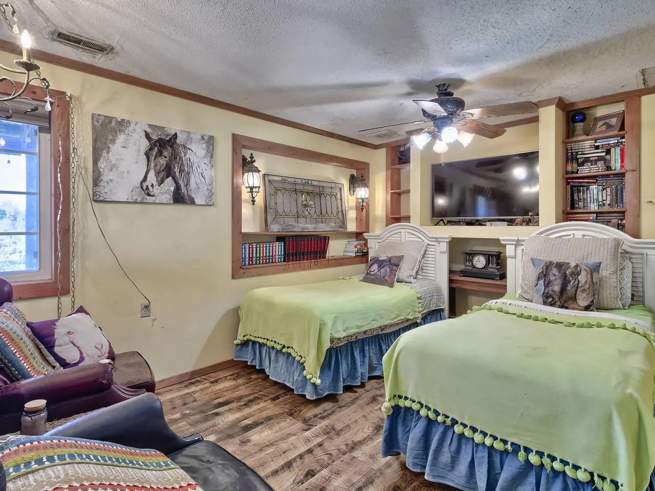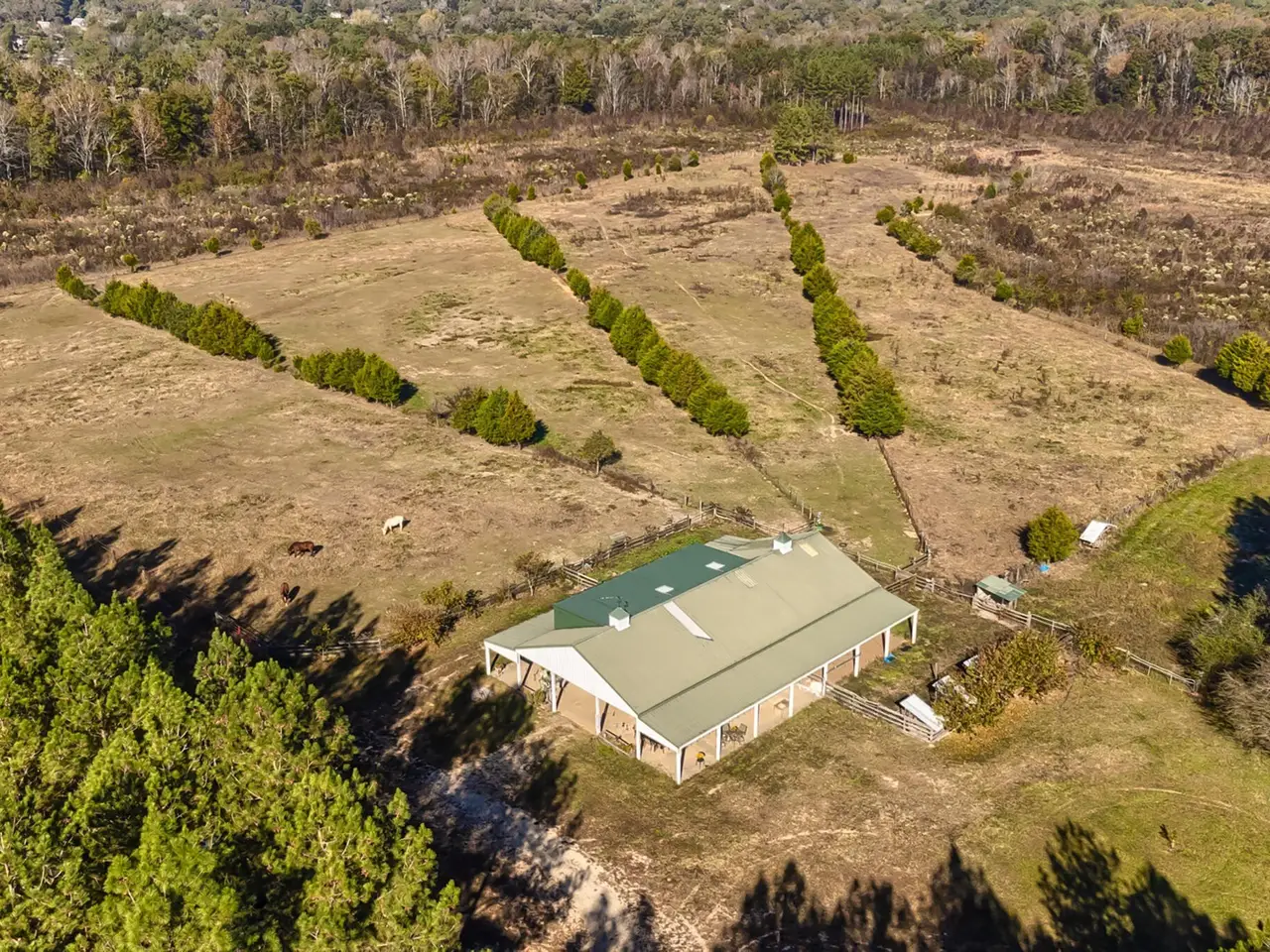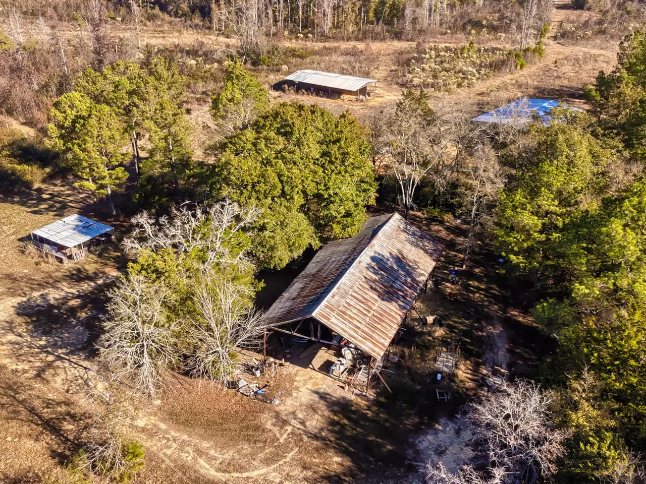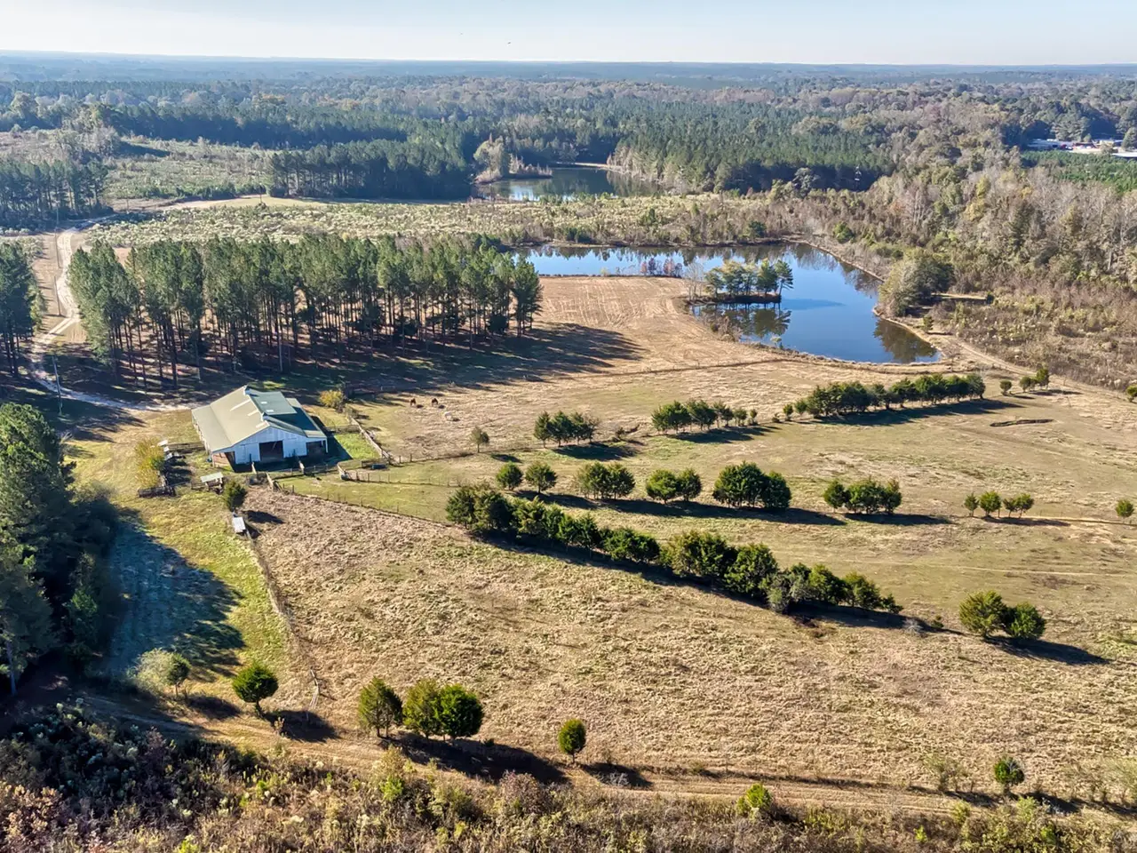 The 240 acres has unlimited potential. Currently it is a single family home with a loveable Barndominium with three different living spaces. Two downstairs and a separate apartment upstairs which was added in 2020 with a large closet/office, full bathroom open concept living/bedroom/kitchenette. The first living space was attached with the original stalls built approximately in 2006. Its a large bedroom/living room and kitchenette. The second was added in 2023 and is slightly smaller but very functional. The barn has an abundance of exterior living and dining space. The laundry/outdoor kitchen and dressing room are downstairs. This could be turned into a magnificent wedding venue with a bridal suite. Or keep it as a single-family home. The 240 acres holds three ponds. One is one acre, the other is three acres and the third is four acres. The land is sprawling with the ponds, the 5 stall barn with the living space, the chicken coops, paddocks for the horses, the exterior barn and pig pen (currently not being occupied) The property has hunting and fishing year round. All the ponds are fully stocked, the wildlife runs free for the taking and the barn could be converted to a hunting lodge. The endless uses for this property will keep your mind intrigued.