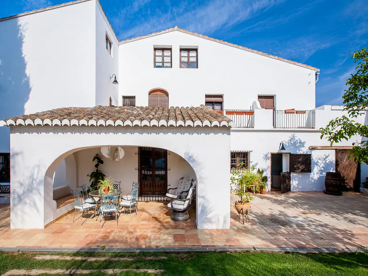 This rural villa features classic Valencian architectural styling. Situated on over 4,700m2 of land made up of well-established gardens, the 6-bedroom, 5-bathroom home covers a built area of 706m2, complete with terraces and courtyards. Close to the services and centre of San Antonio de Benagéber, a small town just west of Valencia, the property exudes the charm and tranquillity of a traditional country home yet simultaneously offers luxury and style. Accessed from one of two entrances, you pass under a classic Spanish gateway to a drive lined with vintage lampposts that leads through the verdant grounds to a spacious open forecourt with parking areas. The elegant covered terrace is large enough for it to be set up as an outdoor dining area, since the property is currently used as a fine dining restaurant. From here, the view is towards green lawns and tall trees, while the interior of the villa is marked by rustic charm and refinement. The pretty country kitchen combines modern facilities with lots of decorative and architectural appeal, including wooden windows and doors, vaulted wooden-beamed ceilings and a separate laundry room connected to the kitchen by a broad archway. The same interplay of plastered walls, hand-glazed tiles and wooden beams adds character and elegance to the living area, which is made up of a sizeable dining room with some steps down to a large and comfortable lounge complete with rustic fireplace. These areas, next to the covered terraces, form the heart of the villa, which also features six spacious bedrooms full of character and five stylish bathrooms. Another typically Mediterranean feature is the enclosed courtyard with a built-in bar and guestrooms, ideal for relaxing and especially entertaining. The property offers a great deal of privacy, with a pretty garden, terraces, swimming pool and also stables, with space to ride.