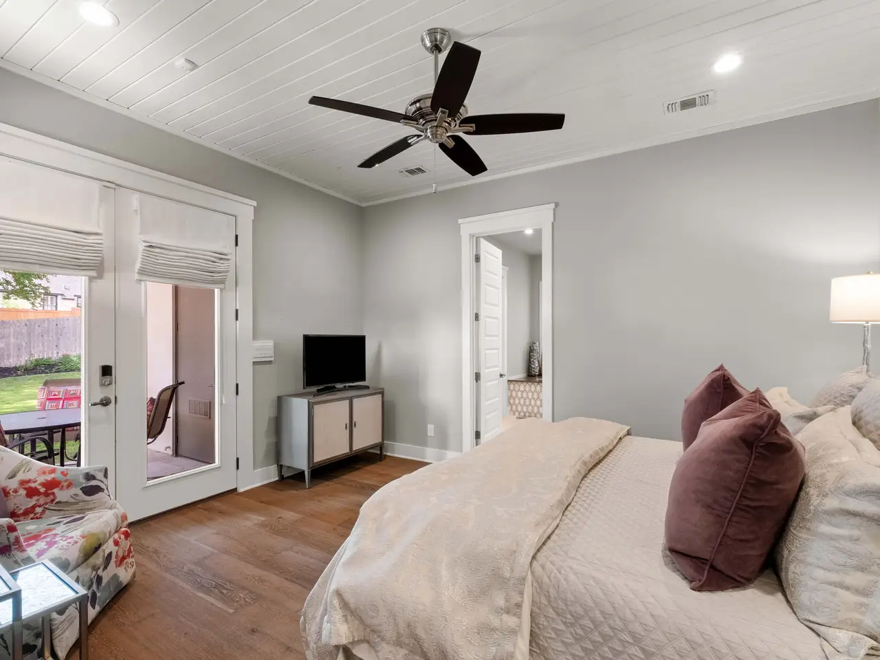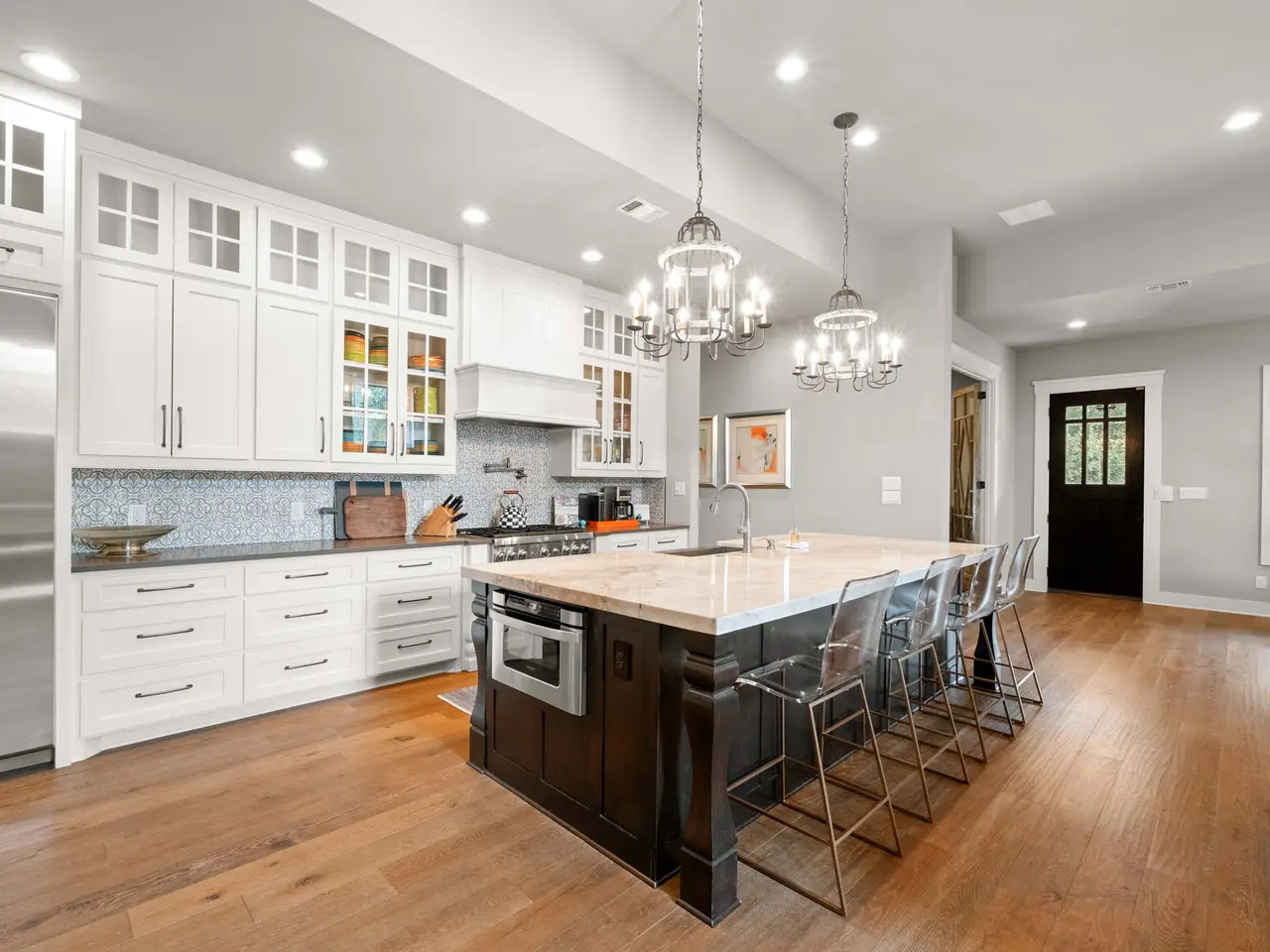 Sophisticated Alamo Heights Residence with Exceptional Design and Craftsmanship. Built in 2015 by renowned Dabney Homes and stylishly curated by Joyeux Home Decor, this stunning home blends timeless architecture with contemporary luxury. Immaculately maintained, it still shows like new. Step onto the inviting, stone-accented covered veranda and into a modern transitional floorplan designed for both refined living and effortless entertaining. The open-concept layout flows seamlessly from an expansive living and dining area into a showstopping chef's kitchen, featuring a quartzite island, premium Thermador appliances, and gas cooking. The main level includes a serene primary suite with spa-inspired bath, dual vanities, soaking tub, oversized walk-in shower, and two generous walk-in closets. A private guest suite with full bath, plus a flexible study or additional living area, completes the first floor. Upstairs, find three spacious bedrooms, two full baths, and a versatile game/media room offering endless possibilities. Additional highlights include a pass-through two-car garage with convenient street and alley access, offering ample parking for family and guests.