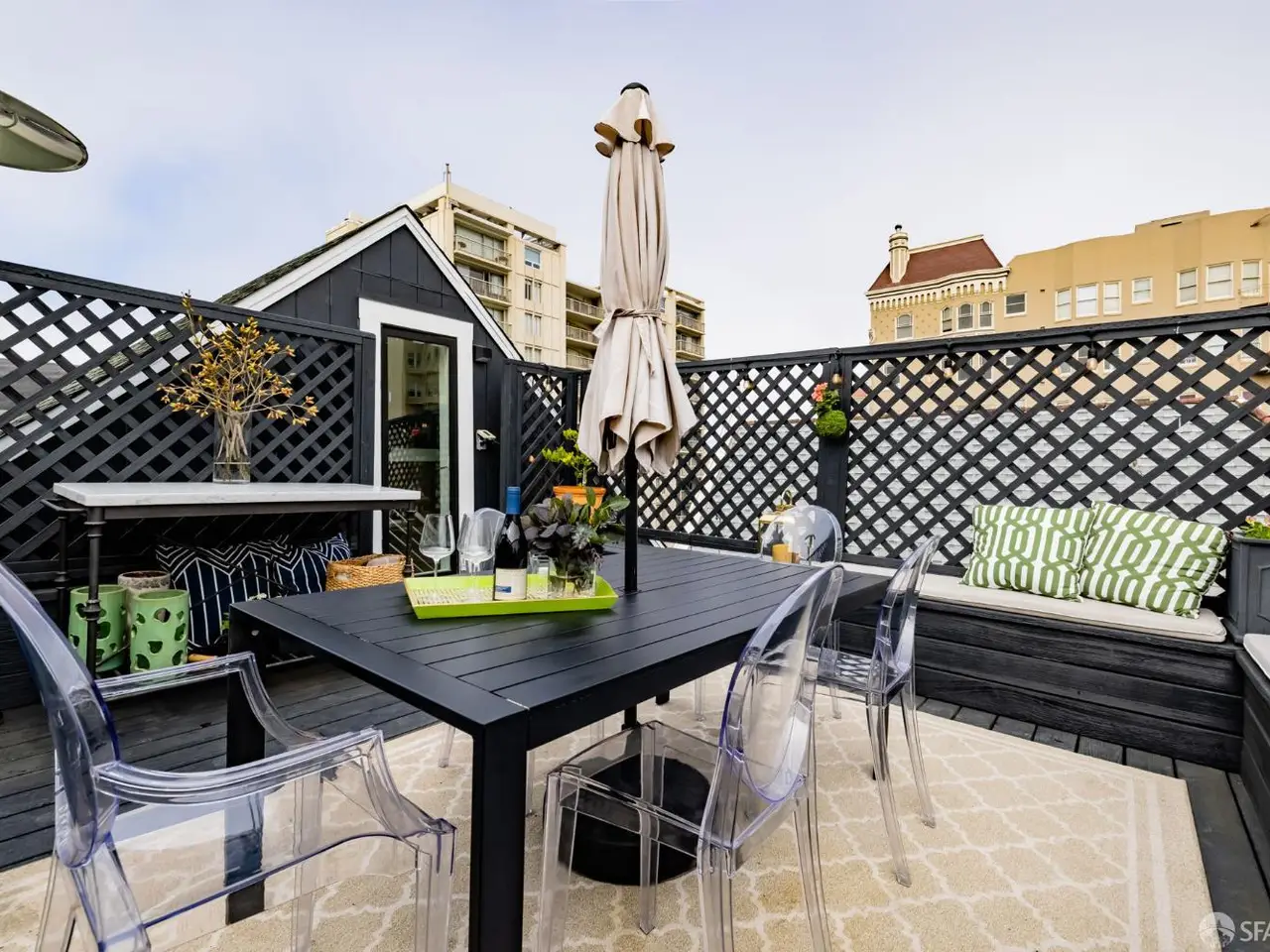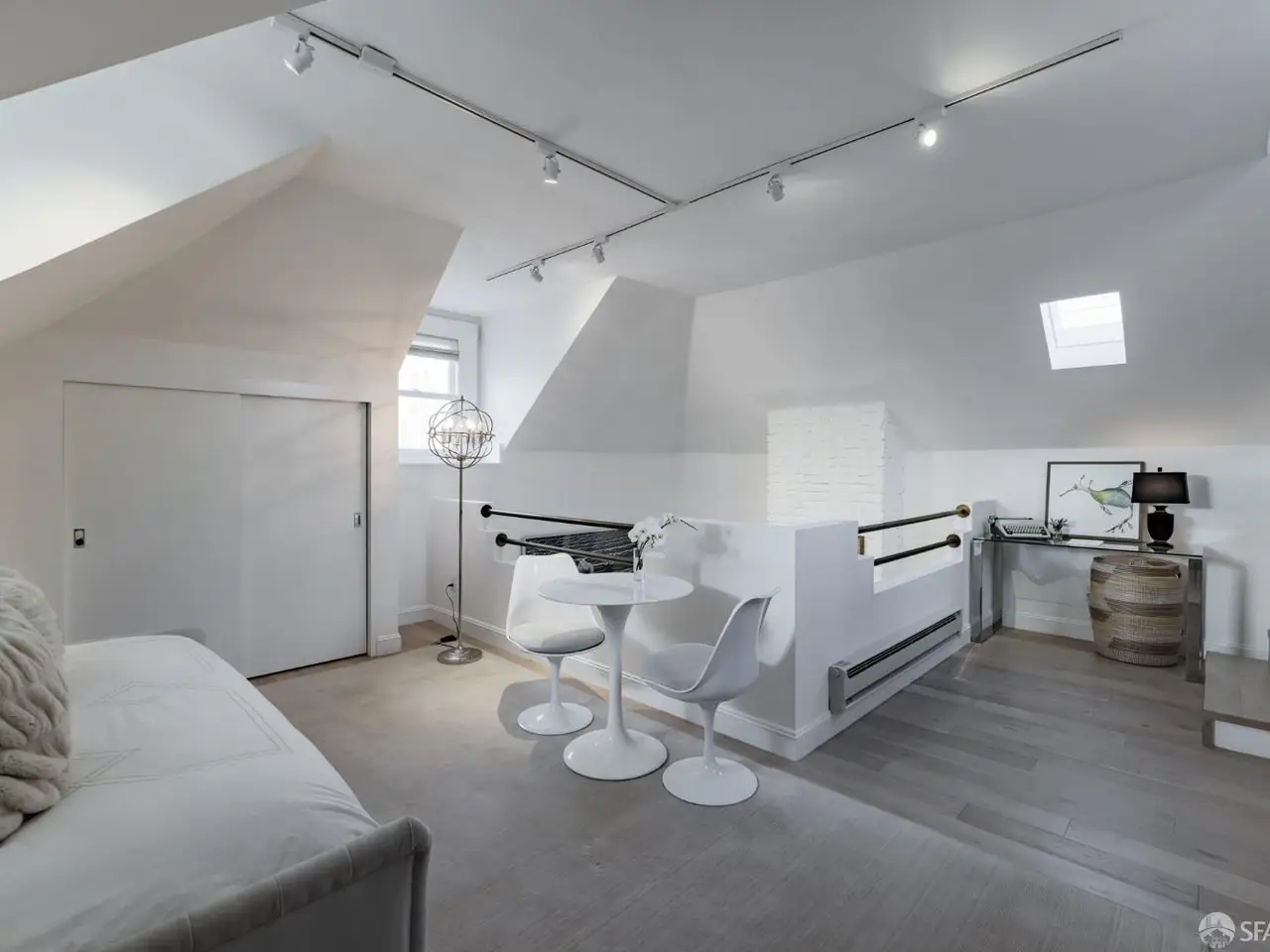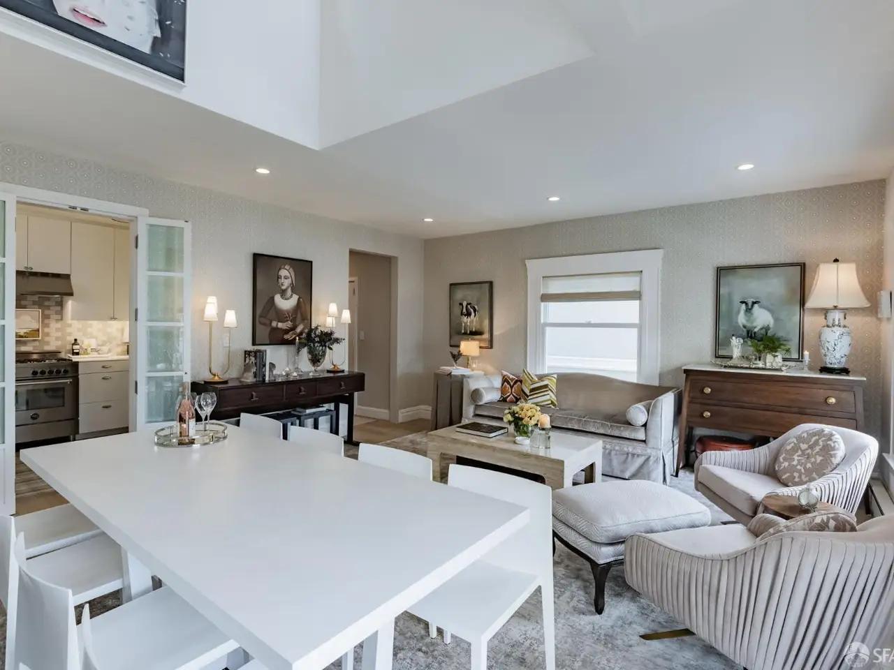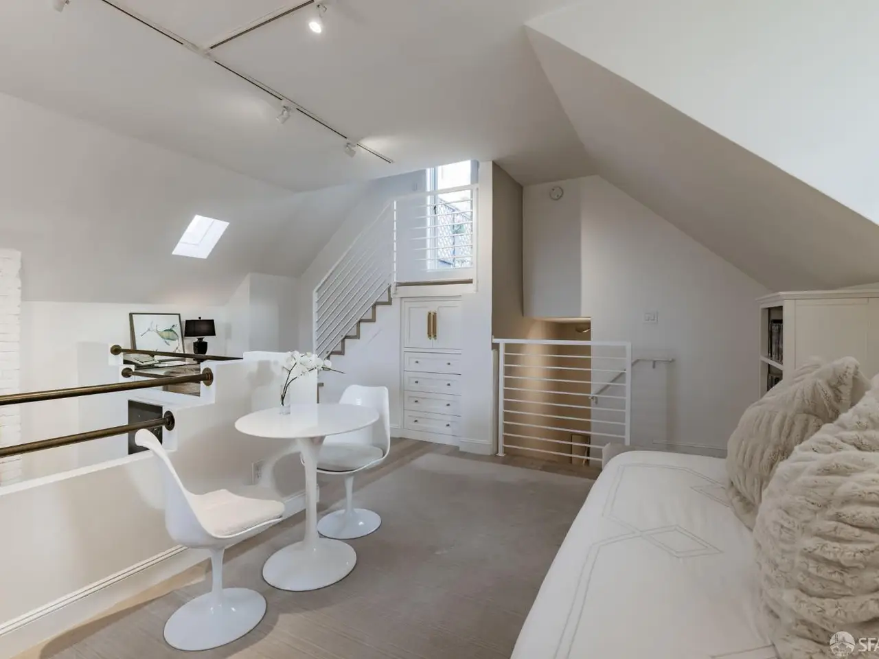 This stunning, pent level condo in prime Pacific Heights is truly one of a kind. Flooded with both natural light and old San Francisco charm, this home benefitted from an elegant, down-to-the-studs 2017 remodel and now boasts wide plank white oak floors, all new cabinets, countertops and appliances, and new windows throughout. The main level of this gorgeous home includes the primary bedroom with double closets and private patio (the first of two private outdoor spaces), remodeled bath with travertine walls and floors, living/dining room complete with fireplace and cathedral ceilings, and chef's kitchen with Bertazzoni gas range, new faucet by Hansgrohe and imported English cabinet pulls, in unit washer and dryer. Upstairs is your light and bright lofted second bedroom with custom under-stair storage casework, an office nook, and access to your private roof deck, which includes a heater and a marble island. Separate storage and a third shared common patio complete this exquisite residence.