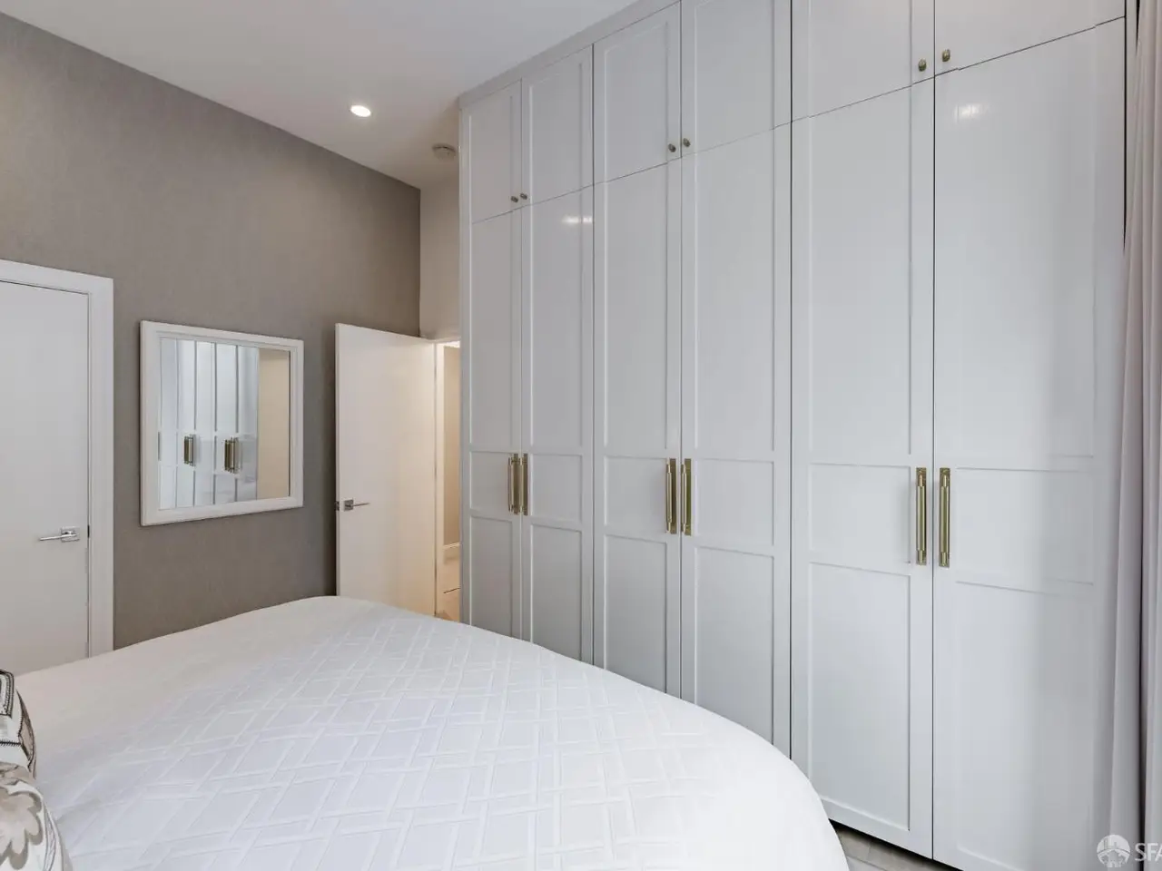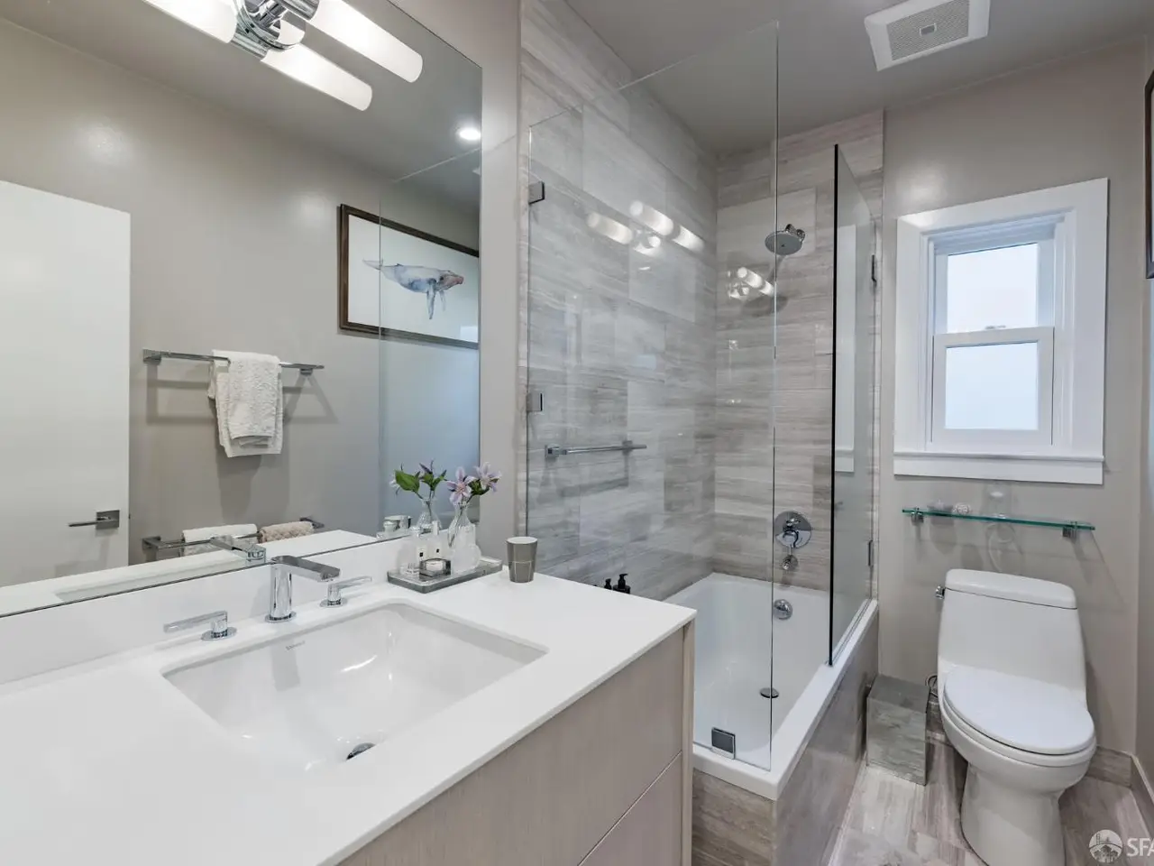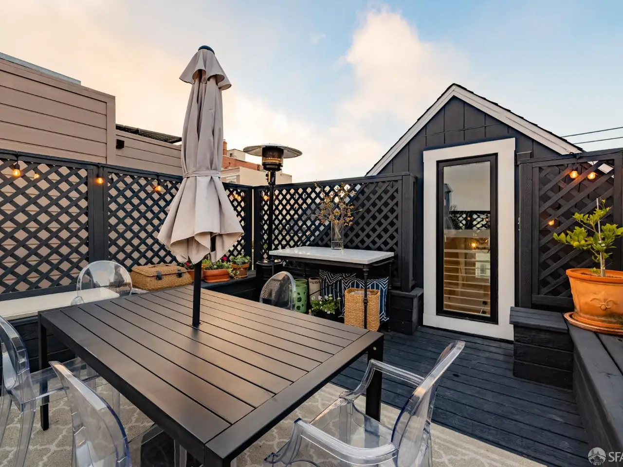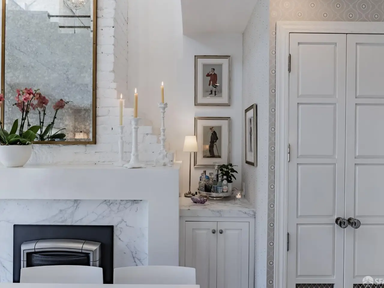 This stunning, pent level condo in prime Pacific Heights is truly one of a kind. Flooded with both natural light and old San Francisco charm, this home benefitted from an elegant, down-to-the-studs 2017 remodel and now boasts wide plank white oak floors, all new cabinets, countertops and appliances, and new windows throughout. The main level of this gorgeous home includes the primary bedroom with double closets and private patio (the first of two private outdoor spaces), remodeled bath with travertine walls and floors, living/dining room complete with fireplace and cathedral ceilings, and chef's kitchen with Bertazzoni gas range, new faucet by Hansgrohe and imported English cabinet pulls, in unit washer and dryer. Upstairs is your light and bright lofted second bedroom with custom under-stair storage casework, an office nook, and access to your private roof deck, which includes a heater and a marble island. Separate storage and a third shared common patio complete this exquisite residence.