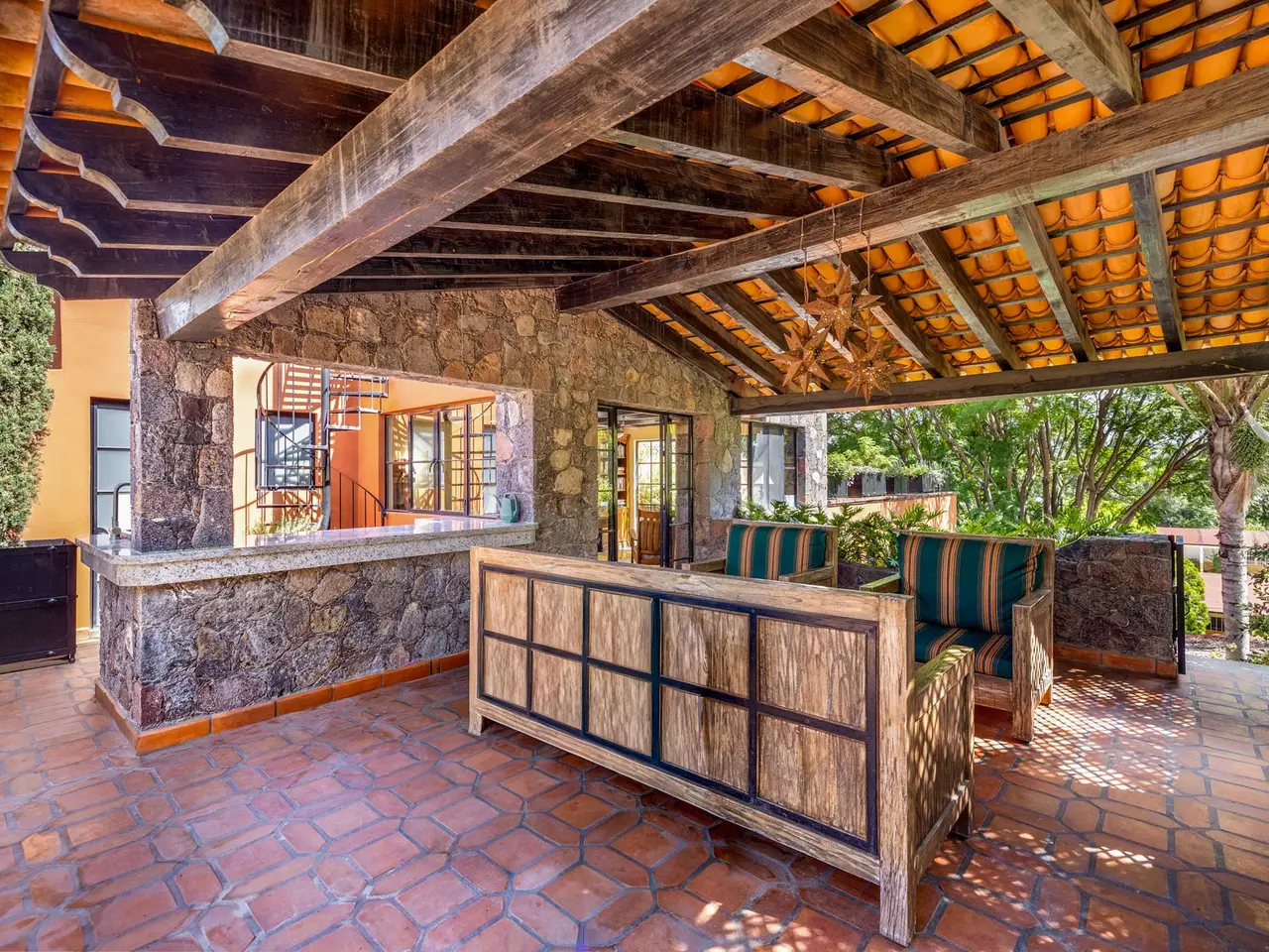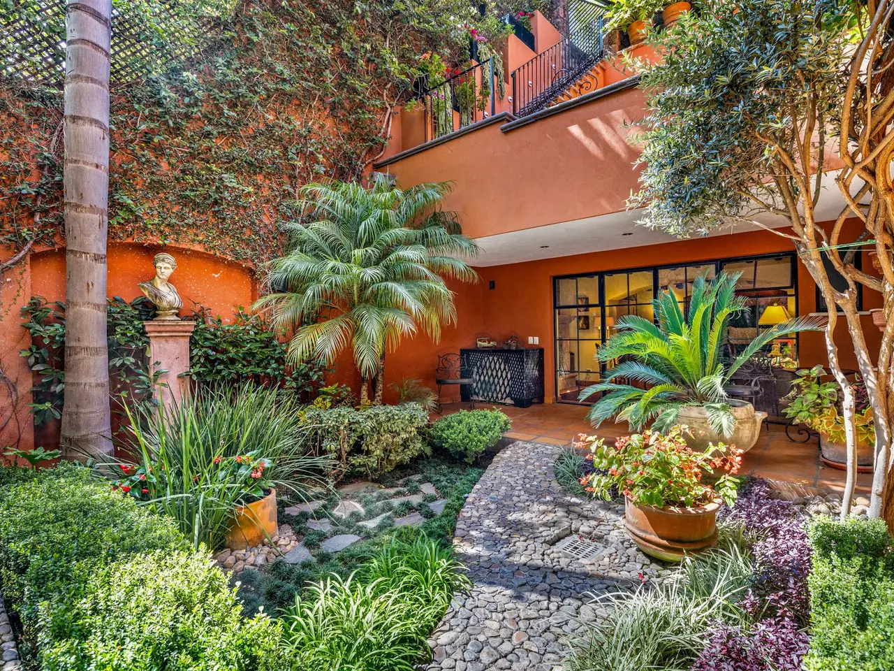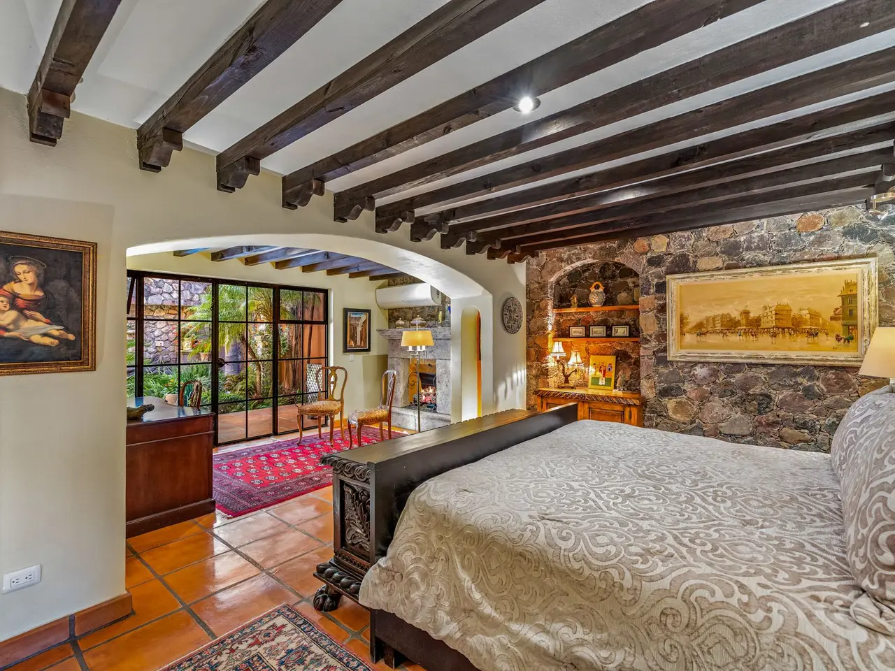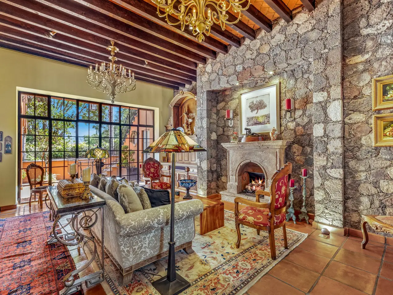 You enter Casa Flora through a graceful foyer, where a stone fountain and hand-crafted details set the tone for the home. From here, an anteroom provides access to the private quarters. The master suite is especially impressive, with carved wood accents, a cantera fireplace, and air conditioning for year-round comfort. Glass doors open to a garden and patio with another fountain and a covered seating area — ideal for enjoying the outdoors in privacy. The en-suite bathroom features high end finishes, including matching circular mirrors over dual sinks, and a spacious walk-in closet. Abundant natural light fills the space throughout the day. The guest bedroom offers its own en-suite bathroom and bright windows, making it comfortable for family or visitors. A laundry room is conveniently located off the anteroom. From the anteroom, a short staircase leads up to the main living level. The kitchen features granite countertops, high-end appliances, a large island, and hand-carved cabinetry. Adjacent is a terrace perfect for dining al fresco or enjoying evening cocktails. The formal living room centers around a grand cantera fireplace, complemented by a impressive custom cabinet built by a local master craftsman, two elegant chandeliers, and a grand piano. A formal dining room extends from the living area, offering a refined space for entertaining. From the kitchen terrace, stairs lead down to the back garden, where the sound of the fountain carries through the air. This level also includes a guest bathroom. Another short flight of stairs brings you to a second terrace with a sitting area and sweeping views. On this level you’ll also find a thoughtfully designed office with custom cabinetry and its own full bath. The office opens to yet another patio and could easily serve as a third bedroom if desired. From the upper terrace, a spiral staircase leads to a rooftop with panoramic views of the Parroquia and the surrounding hills. Casa Flora also offers modern conveniences and upgrades that enhance its livability. The home is equipped with eight solar panels for energy efficiency, a whole-house water purification and pressurization system, and mini-split air conditioning units. Casa Flora is offered with a carefully curated furniture package, including fine furnishings and antiques of exceptional quality. This turnkey offering allows new owners to step directly into a beautifully finished home, ready to be enjoyed from day one.