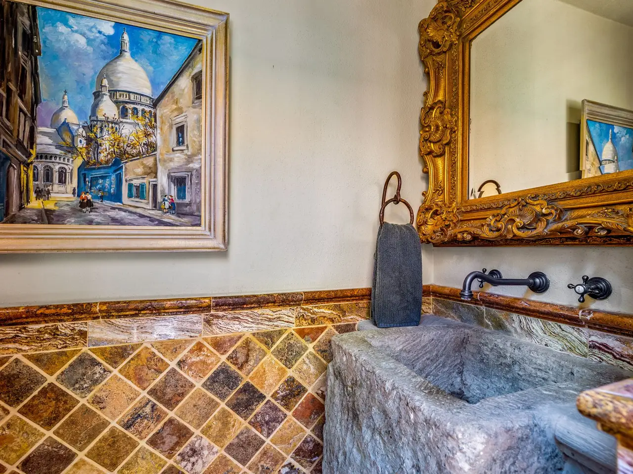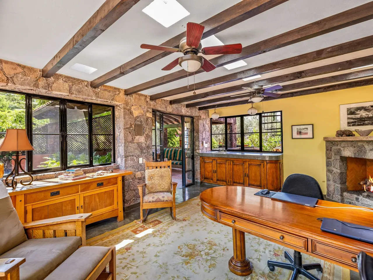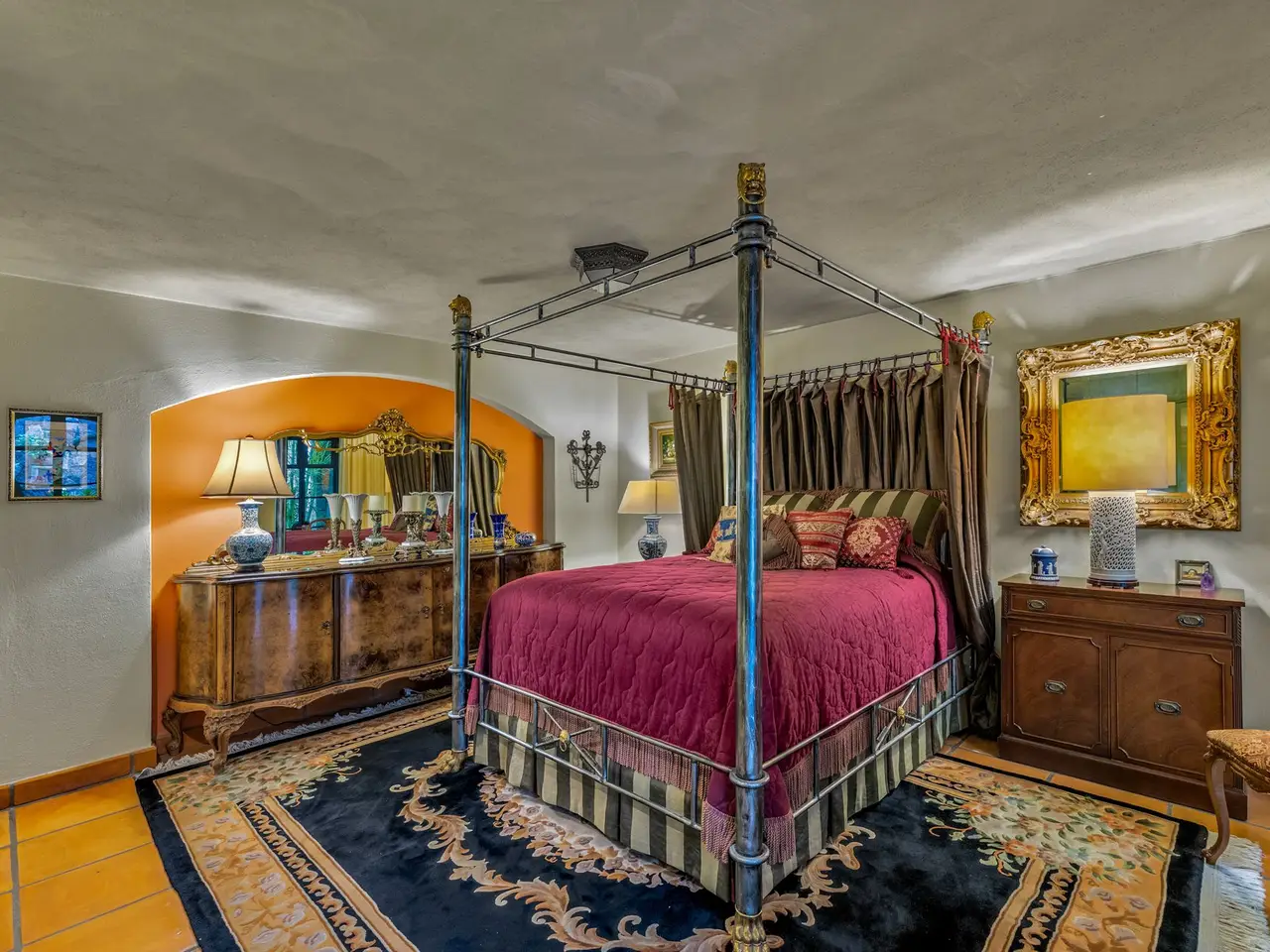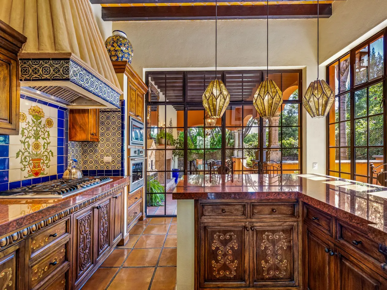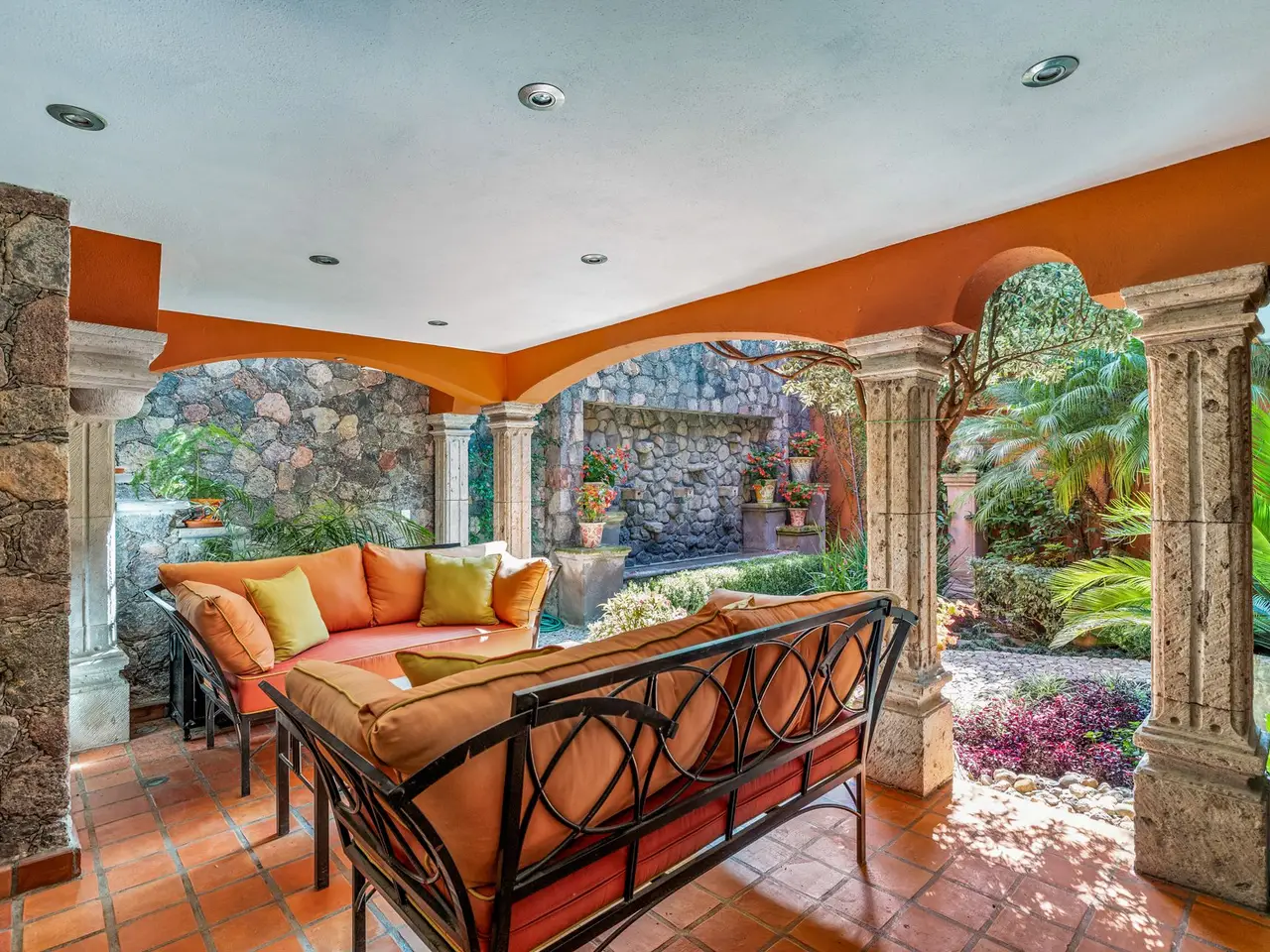 You enter Casa Flora through a graceful foyer, where a stone fountain and hand-crafted details set the tone for the home. From here, an anteroom provides access to the private quarters. The master suite is especially impressive, with carved wood accents, a cantera fireplace, and air conditioning for year-round comfort. Glass doors open to a garden and patio with another fountain and a covered seating area — ideal for enjoying the outdoors in privacy. The en-suite bathroom features high end finishes, including matching circular mirrors over dual sinks, and a spacious walk-in closet. Abundant natural light fills the space throughout the day. The guest bedroom offers its own en-suite bathroom and bright windows, making it comfortable for family or visitors. A laundry room is conveniently located off the anteroom. From the anteroom, a short staircase leads up to the main living level. The kitchen features granite countertops, high-end appliances, a large island, and hand-carved cabinetry. Adjacent is a terrace perfect for dining al fresco or enjoying evening cocktails. The formal living room centers around a grand cantera fireplace, complemented by a impressive custom cabinet built by a local master craftsman, two elegant chandeliers, and a grand piano. A formal dining room extends from the living area, offering a refined space for entertaining. From the kitchen terrace, stairs lead down to the back garden, where the sound of the fountain carries through the air. This level also includes a guest bathroom. Another short flight of stairs brings you to a second terrace with a sitting area and sweeping views. On this level you’ll also find a thoughtfully designed office with custom cabinetry and its own full bath. The office opens to yet another patio and could easily serve as a third bedroom if desired. From the upper terrace, a spiral staircase leads to a rooftop with panoramic views of the Parroquia and the surrounding hills. Casa Flora also offers modern conveniences and upgrades that enhance its livability. The home is equipped with eight solar panels for energy efficiency, a whole-house water purification and pressurization system, and mini-split air conditioning units. Casa Flora is offered with a carefully curated furniture package, including fine furnishings and antiques of exceptional quality. This turnkey offering allows new owners to step directly into a beautifully finished home, ready to be enjoyed from day one.