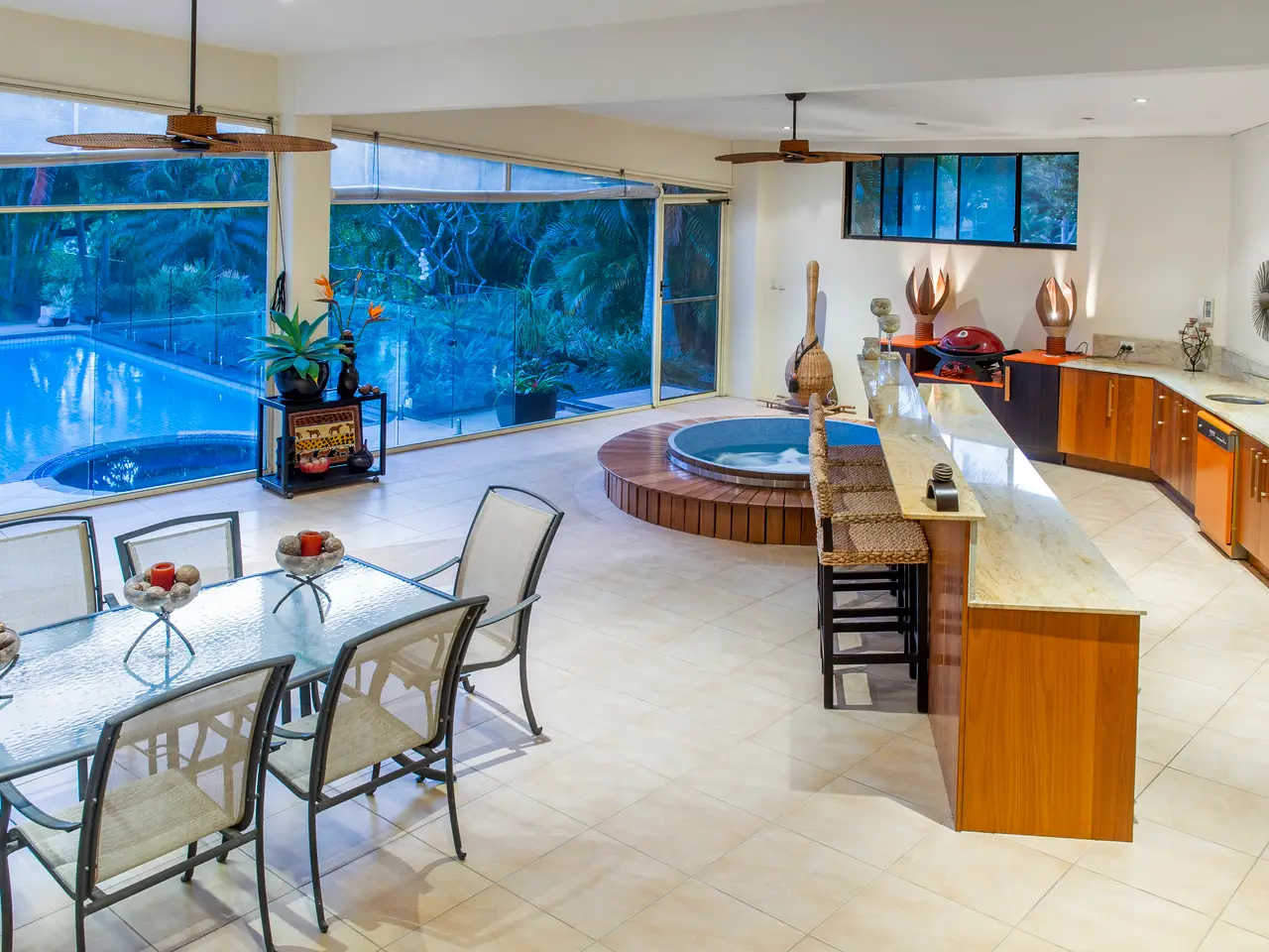 This palatial home, situated on a panoramic elevated block in the prestigious gated resort of Sanctuary Cove must be seen to be appreciated. Constructed to withstand any weather conditions, this multi-level home is completely built from concrete with a suspended slab. Set in private and manicured, lush gardens with breath-taking views over the resort to the mountains, the home is an oasis in a busy world. This wonderful family residence is ideal for a large or extended family. It has 4 luxurious bedrooms and 6 superior bathrooms. It boasts its own soundproof movie theatre with surround sound and ample seating space for family and friends. The separate study is perfect for working from home. Complementing the luxury of the interior is an expansive indoor Cabana with a kitchen, bar, hot tub and living area. With all these features combined with the facilities that Sanctuary Cove living offers, you would feel permanently on holiday! Features of the home include: • 4 car and 2 buggy parking • Huge under home storage • 4 water storage tanks • 4 bedrooms, master ensuite with walk-in wardrobe • 6 bathrooms • Study • Soundproofed home theatre • Open plan living with an abundance of living areas • Fully airconditioned • 24 hours manned security with regular mobile patrols • FIRB approval for overseas investors Sanctuary Cove, a gated and FIRB approved resort is situated on the Northern end of The Gold Coast with easy access to the main M1 motorway to Brisbane, 45 minutes to Brisbane International Airport and 40 minutes to Coolangatta Airport. The famous golden beaches of Surfers Paradise are only a 25 minute drive away and Sanctuary cove boasts 2 championships, world-class golf courses, a very large marina and a charming Marine Village shopping, restaurant and medical precinct. In addition, there is a fully equipped health centre and gym with swimming pool and tennis courts as well as The Intercontinental Hotel situated next to the Marine Village – and all these facilities are accessible by golf buggy! There are several Private and Public schools in the area, 2 Westfield Shopping Centres and multiple medical centres as well.