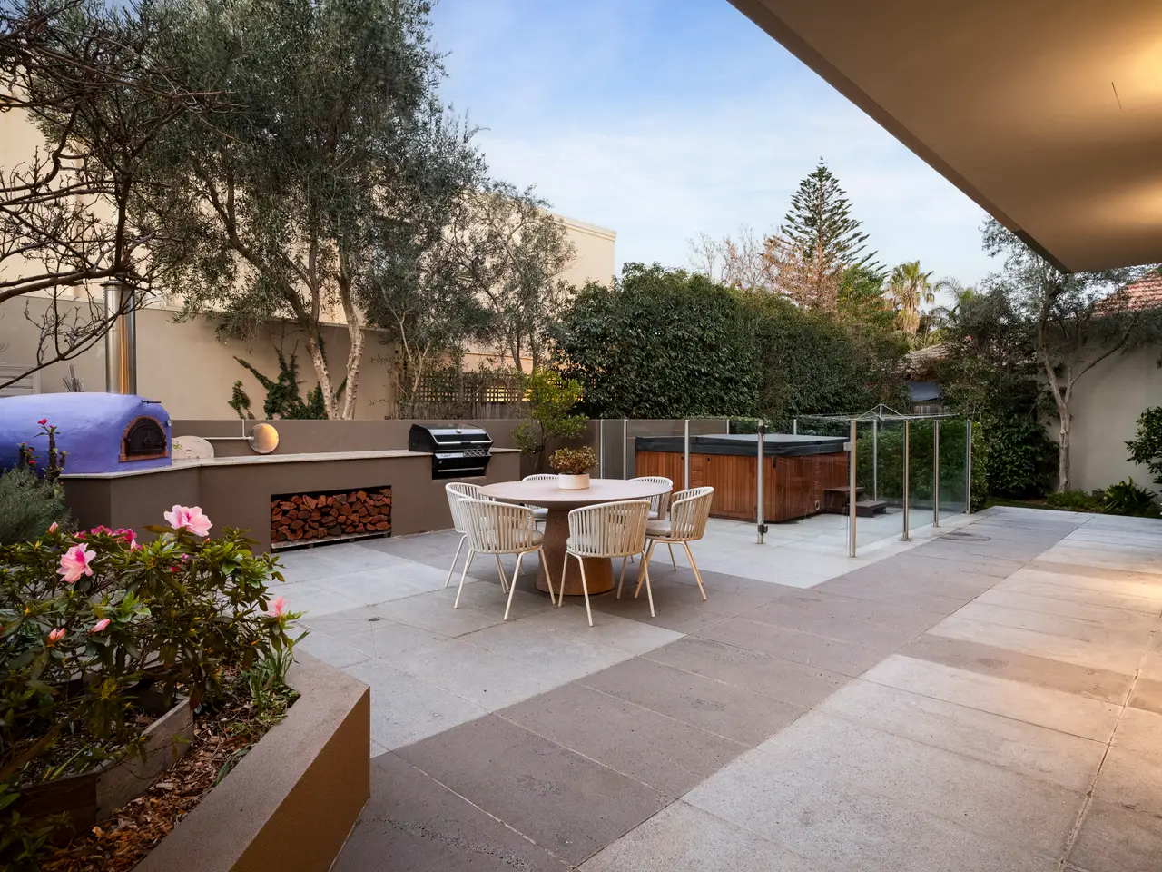 Ground floor outdoor entertaining area with pizza oven, BBQ, and spa