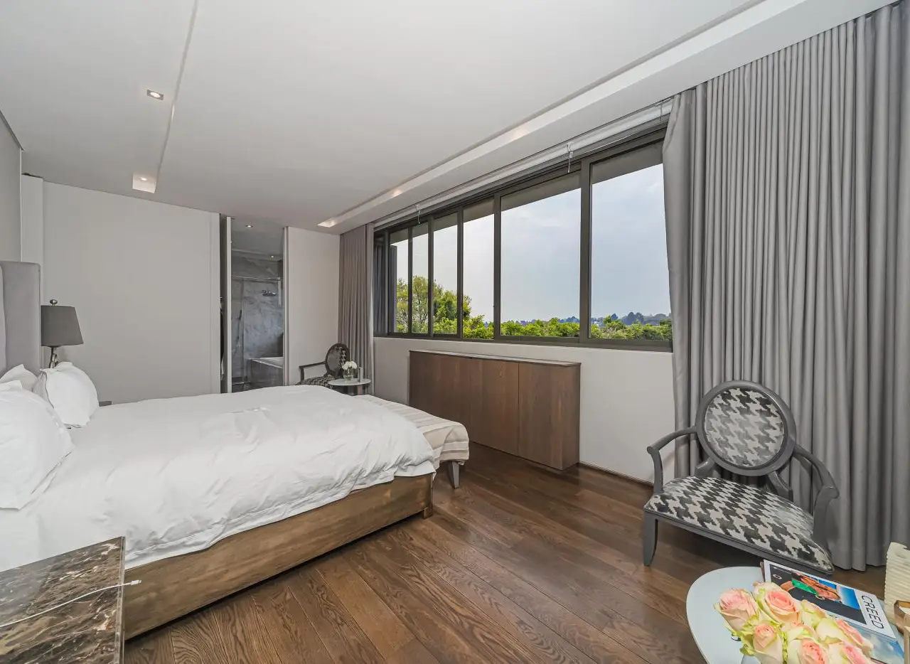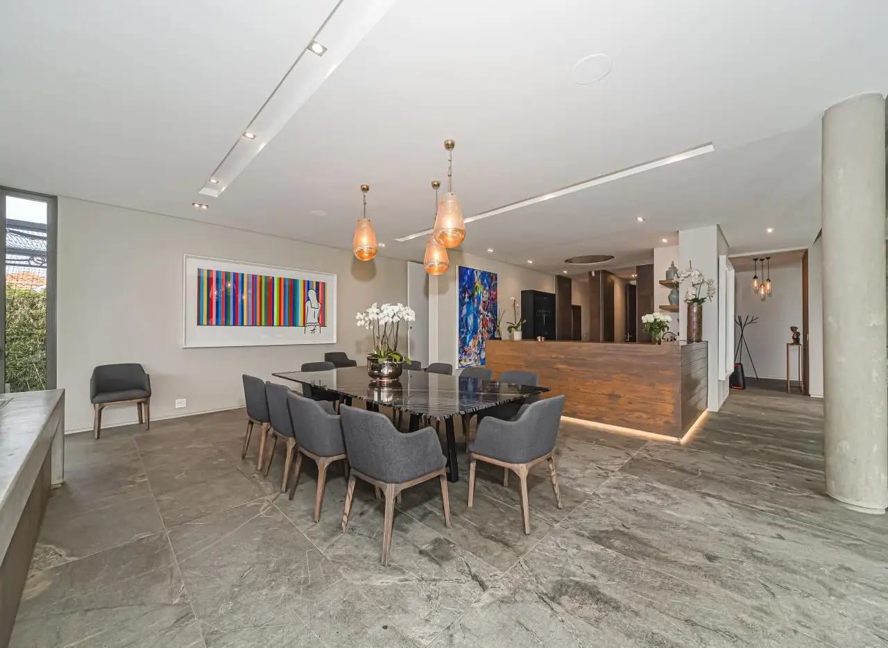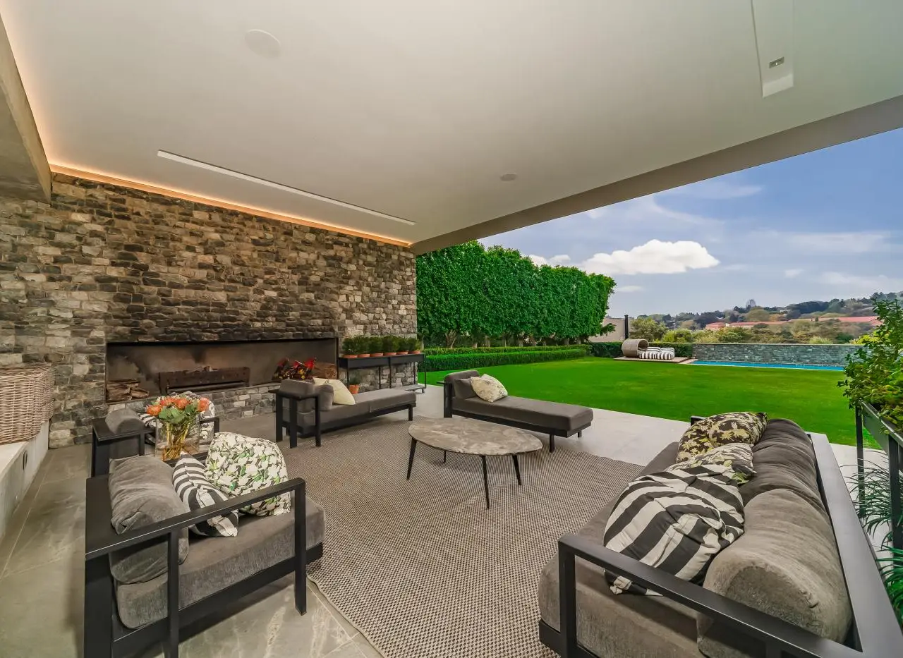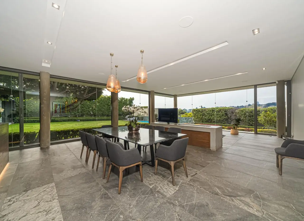A Home of International Prestige.With grand volumes, bespoke finishes, and sheer opulence, this residence, designed by the iconic, Stephen Pellerade, offers a refined masterpiece of contemporary design, state-of-the-art technology with timeless elegance. Security & Technology; Complete peace of mind with private 24-hour guarded security, for the 3 homed estate, 2 further gated entrance, and an Elan Smart Home system. From your phone, you can effortlessly manage; CCTV, alarms, air conditioning, security, the Luton lighting system, audio, and all visuals throughout the property. Arrival & Outdoor Living A large scale, paved driveway and striking entrance welcome you into expansive landscaped gardens. The sliding wooden doors offer the option of privacy or opened with views from the driveway of; manicured lawns framed by sculpted flowerbeds and mature trees ensure complete privacy. The edged position lap pool opens to uninterrupted Sandton skyline views. The integrated entertainment terrace welcomes you to a palatial wooden dining table, a relaxed lounge area, and a stone-clad fireplace - perfect for both summer evenings and cozy winter gatherings. A private guest studio cottage adjoins this outdoor living. For active families and guests, a secluded cricket net. Interior Living The interiors exude warmth and sophistication. An open-plan lounge and dining area are centered around a raised gas fireplace, flowing into the designer kitchen. Wooden paneling and marble countertops combine with a bespoke serving counter, creating an ideal setting for culinary occasions. The separate pantry, laundry, wine cellar, and staff accommodation complete the service areas. Upstairs Retreat A sculptural wooden staircase leads to a pajama lounge/library and study station. Three magnificent en-suite bedrooms feature rich wooden flooring, custom paneling, each with expansive sliding glass windows overlooking lush gardens and leafy suburban views. The En-suite bathrooms showcase marble, mosaic floors, and feature brickwork - a striking fusion of textures and finishes. Master Wing In its own private wing, the master suite is an elegant sanctuary. A spacious lounge/TV area opens to a private astro-turf roof top terrace. The bedroom, finished with soothing tones and premium detailing. A luxurious bathroom with bespoke wall features and a fashion-forward dressing room with generous cabinetry. Additional Features Triple garage (one currently utilised as a home gym) 32 solar panels, 2x 15kVA batteries, and inverter system for full energy independence Advanced Lutron lighting system The stylish home, invites glamorous entertaining and refined family living. A rare modern home at a prestigious address, it redefines luxury living in Johannesburg.