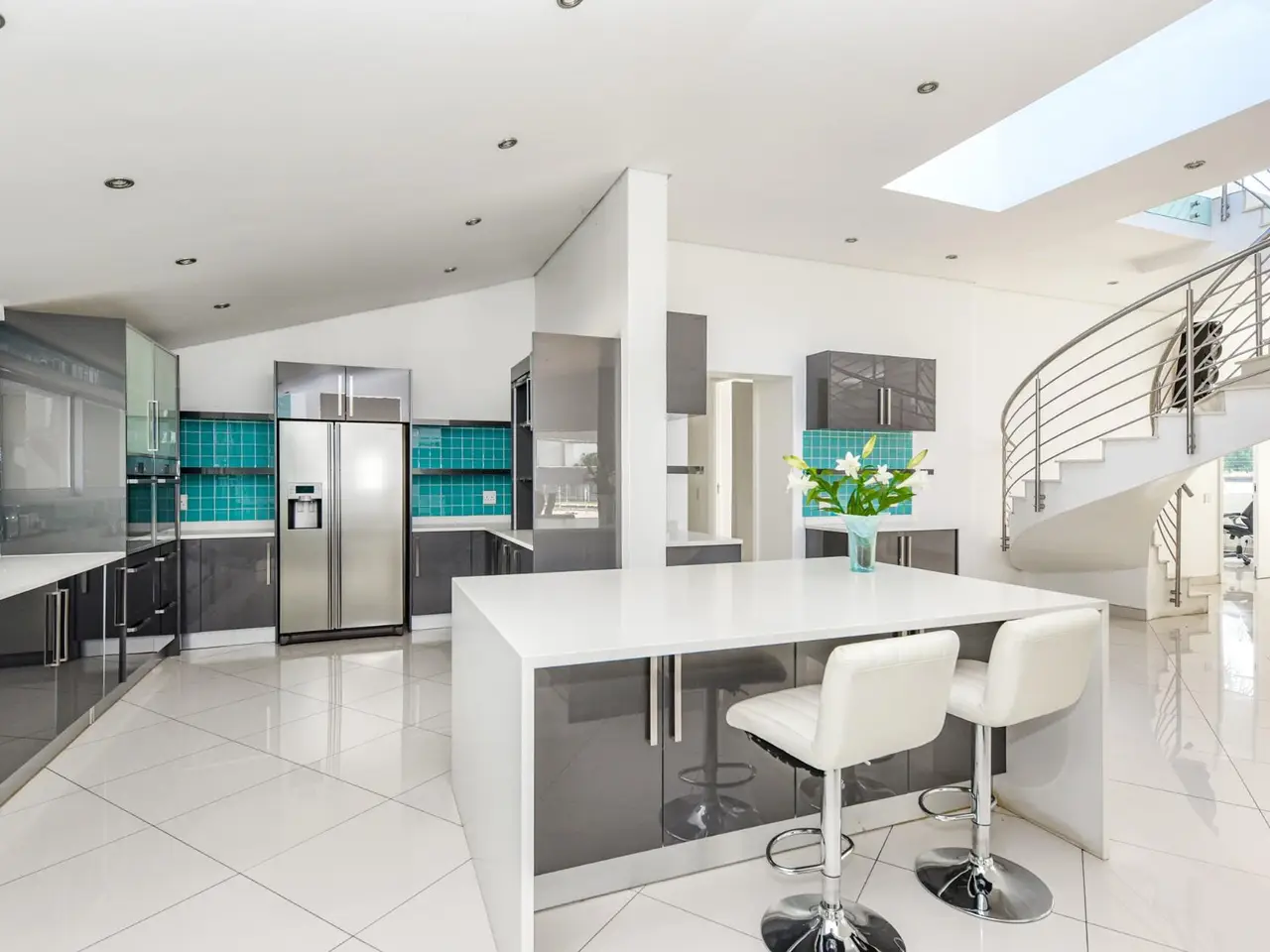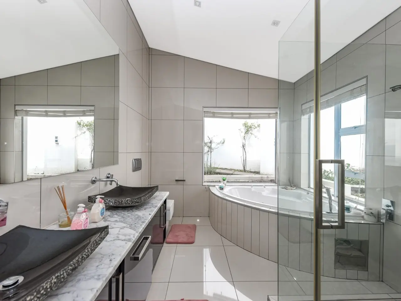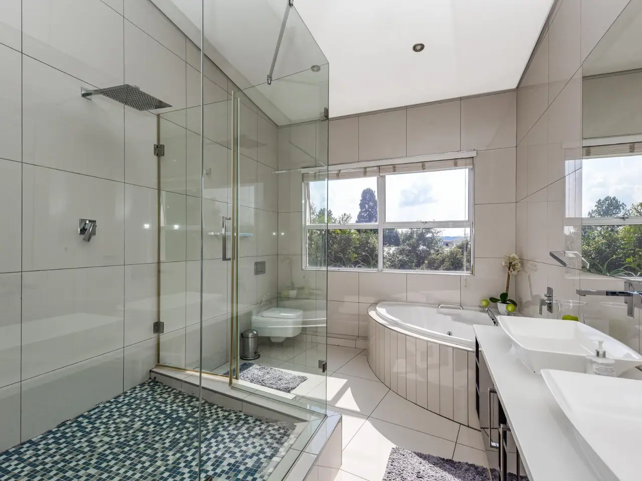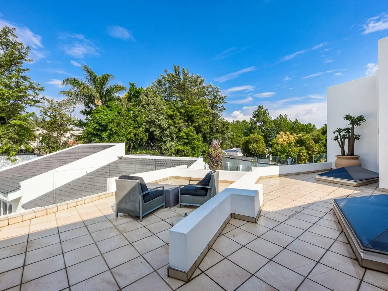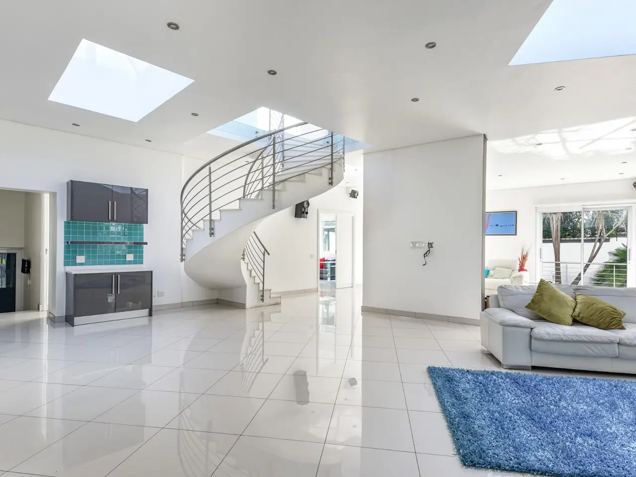 Modern Miami Feel Modern Mansion Masterpiece Tucked away at the end of a long, private driveway, this sleek, architectural statement offers over 2,000 square meters of contemporary luxury. A truly seamless blend of sophistication, comfort, and high-end entertaining, this five bedroom residence is designed for those who appreciate space, privacy, and effortless style.***Grand Entrance and Living Spaces***Private and secure, this home is set back from the road for ultimate tranquility and discretion, with two double glass garages welcoming you home. Plus, ample parking in the drive. A showpiece open plan kitchen is a food lovers dream, with top-tier appliances, sleek finishes, and fluid integration into the grand, modern dining and lounge areas. A seamless flow of all the living areas, whilst being large enough for personal space, is divided by a stunning central gas fireplace that just anchors the living space.The living spaces lead to a vast, covered entertainers area with a sleek built-in bar and ample chill space - perfect for South Africas signature indoor-outdoor lifestyle.This is absolute elevated luxury and entertainment for those who are open to a fabulous lifestyle.Sprawling scullery and ample storage space keeping the home pristine and organised with ample storage throughout.Three bedrooms downstairs (one ensuite) all opening to the lush gardens and pool area. PLUS a dedicated home office, for a perfect quiet, private space for work or study.A striking winding staircase leads to the upper level entertainment hub and living area.Here you will find the Primary bedroom ensuite and an additional substantial bedroom also ensuite. Pure luxury and elegance.Upstairs there is also large lounge and equipped entertainment area, a glass wrapped balcony plus an airy, light-filled retreat come patio opening onto a rooftop deck with panoramic garden and pool views.Sunlit interiors and expansive skylights flood the home with natural light, creating an atmosphere of warmth and openness.Staff quarters, ensuring full-service convenience.This bold, contemporary home is more than just a residence it is a statement of modern luxury, crafted for those who LIVE LARGE, entertain often, and appreciate the finest in design and comfort.