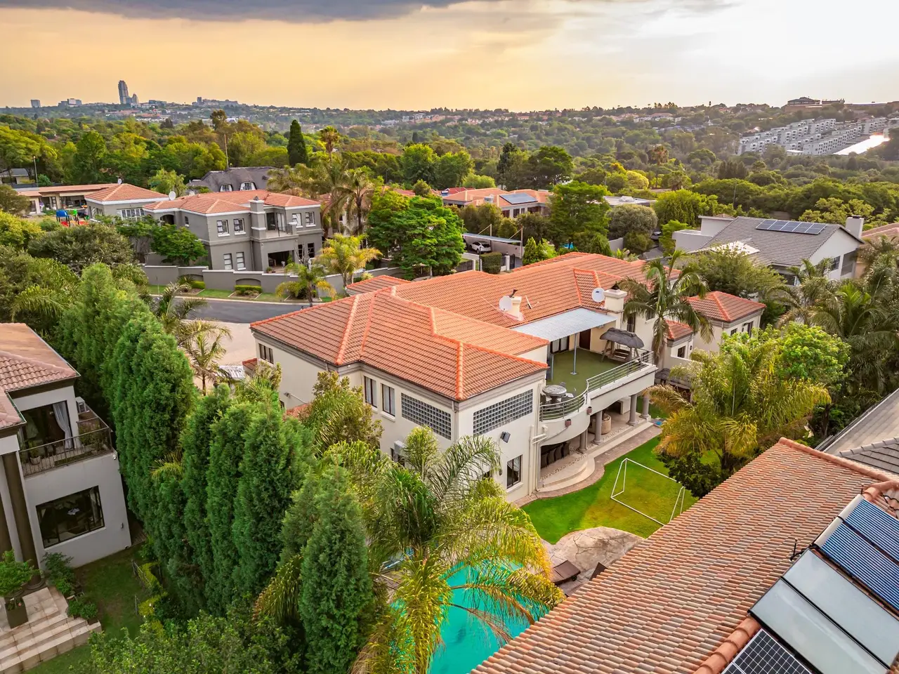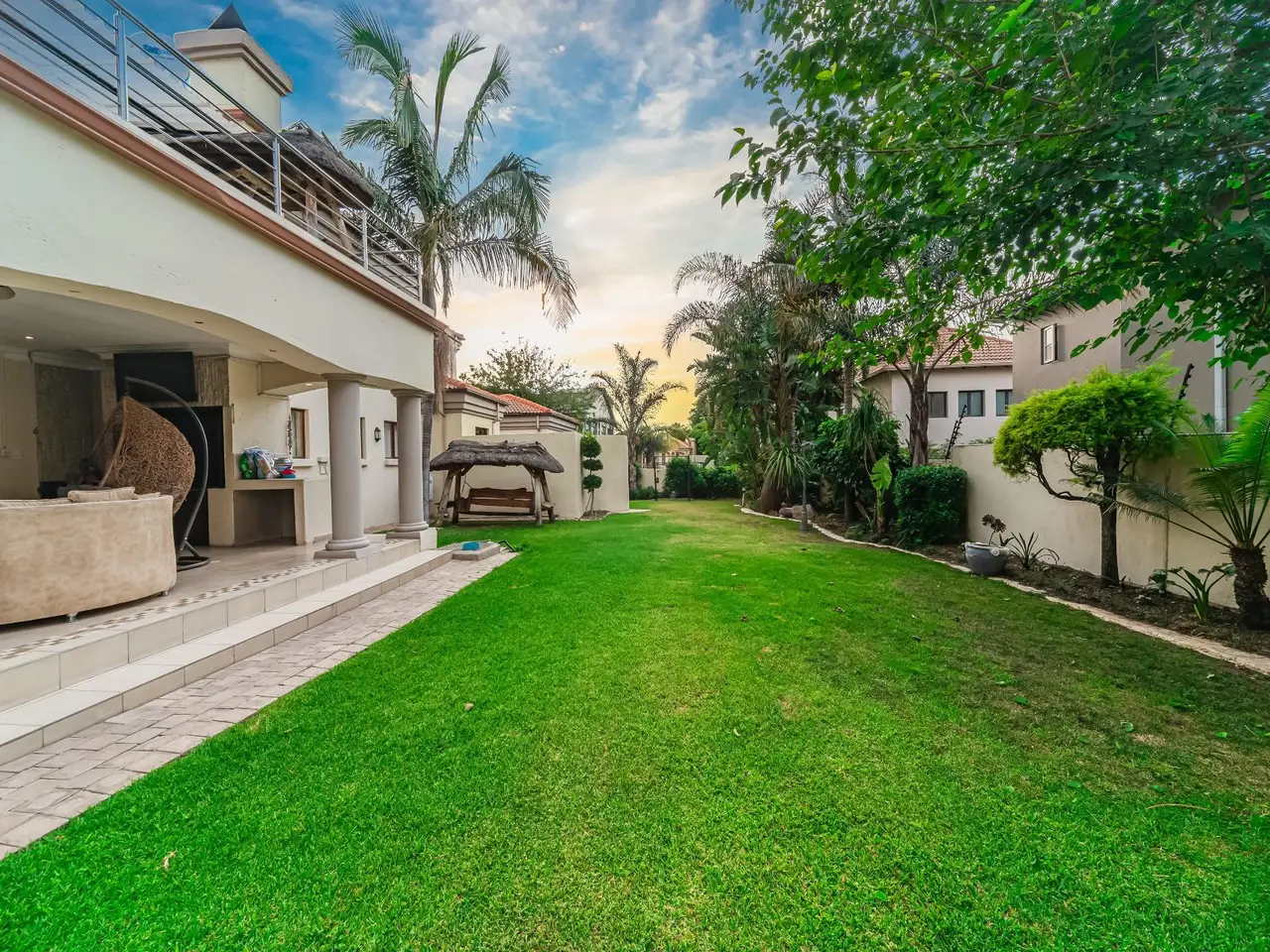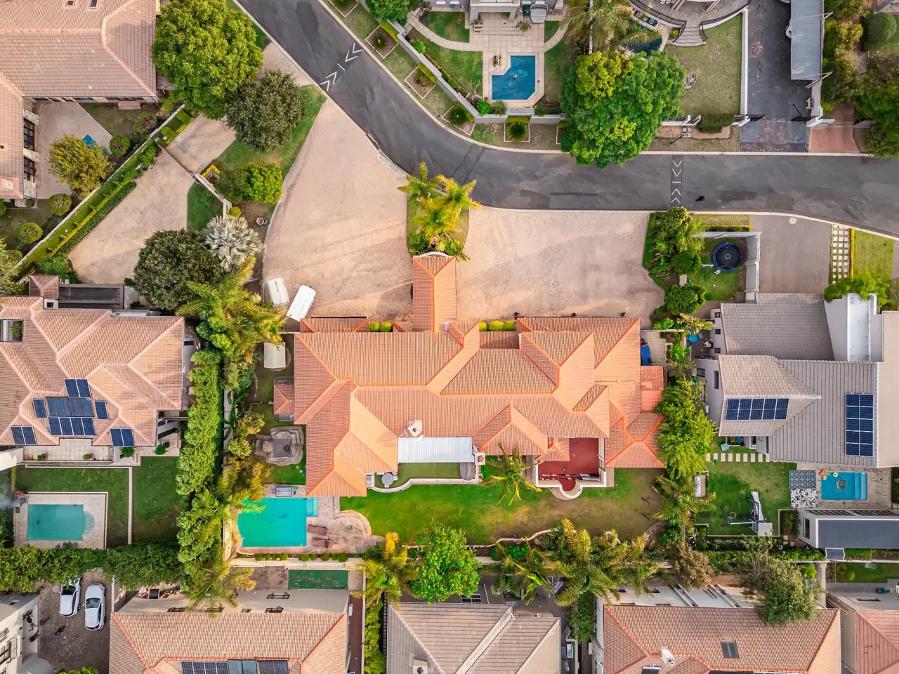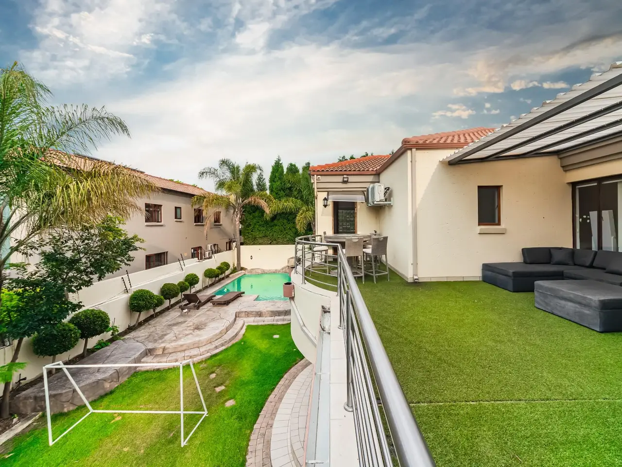BIGGER IS BETTER for a large family. HIGH LEVEL SECURITY AND PRIVACY Welcome to one of the largest homes in the prominent, secure Ashby Estate in Woodmead, Sandton. At 1774sqms, this elegant, warm and sprawling family home offers a secure compound for those looking to live and grow with their families. The home, which is on a double stand in this secure estate has been built by the most esteemed masons of the time, resulting in a solid structure that boasts a contemporary Tuscan-style home with 6 bedrooms and 6.5 bathrooms. Upon entering the double doors, you are welcomed by the free flowing double volume and open planned living area all custom designed with Tuscan-inspired architecture. The central focus of this home is voluminous gourmet contemporary kitchen with granite counter tops throughout and light wood built-in-cupboards. A substantial centre island is perfect for a family get together offering a seamless fusion of chic and functionality. A separate laundry and scullery, allow for a spacious environment for all appliances and daily home keeping tasks. The continuous flow, formal lounge, dining area and TV rooms all are lead out to the tiled covered patio, with a built-in-braai overlooking the well-manicured garden. If entertaining is your way of life, this outdoor oasis featuring a luxurious sparkling swimming pool and inviting jacuzzi, are ideal for hosting guests and blissful relaxation. The basement offers the perfect space for fitness enthusiasts or those who would like to create a private cinema room. The master bedroom is truly magnificent, with walk in closet, a full bathroom ensuite tiled to the ceiling, includes a covered separate sunroom balcony and endless built in cupboards and storage space. Feel relaxed, safe and secure in this upmarket immaculate estate. No power outage concerns as this property as the home includes a 30KVA generator, ensuring peace of mind. This property has 3 staff rooms and a fully self-contained cottage, offering private accommodations for guests or family members.