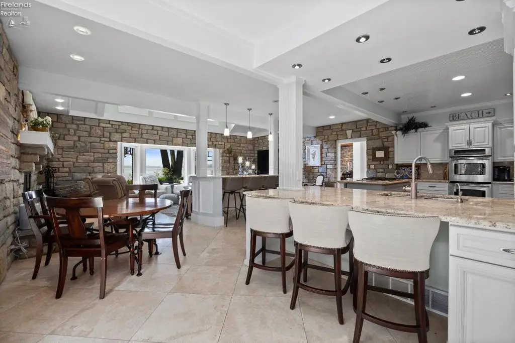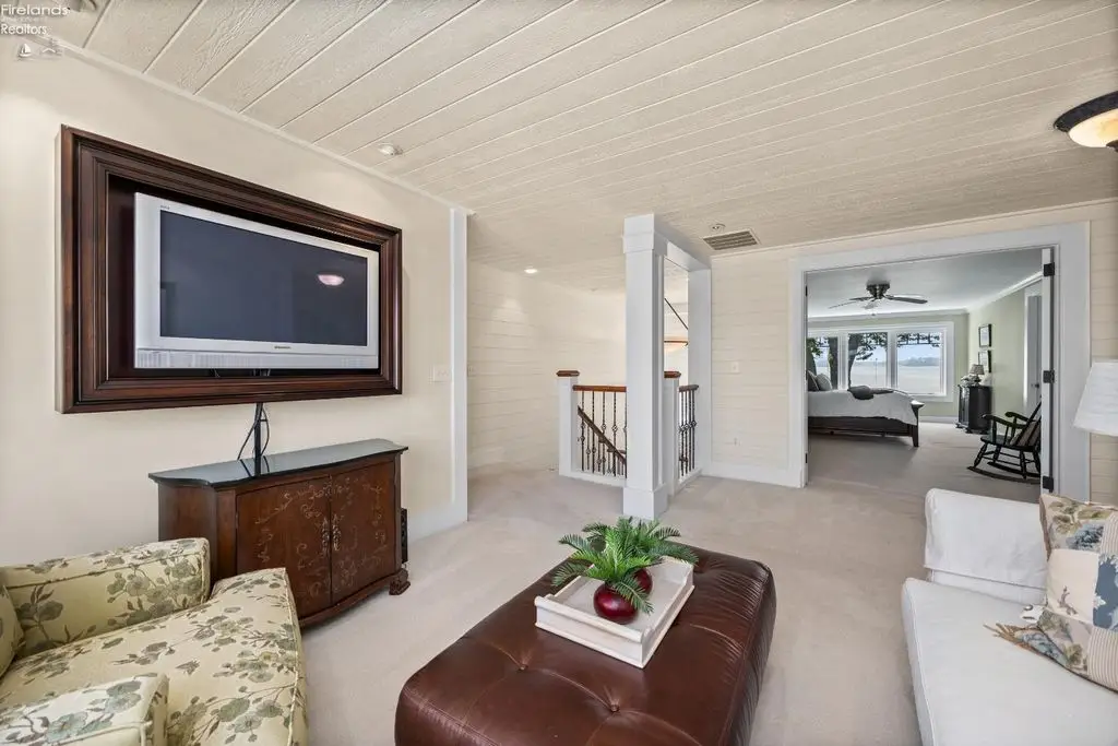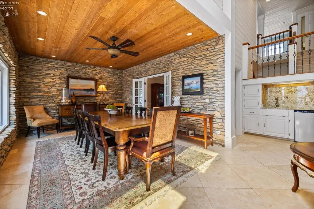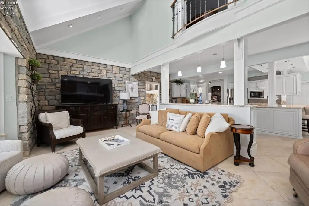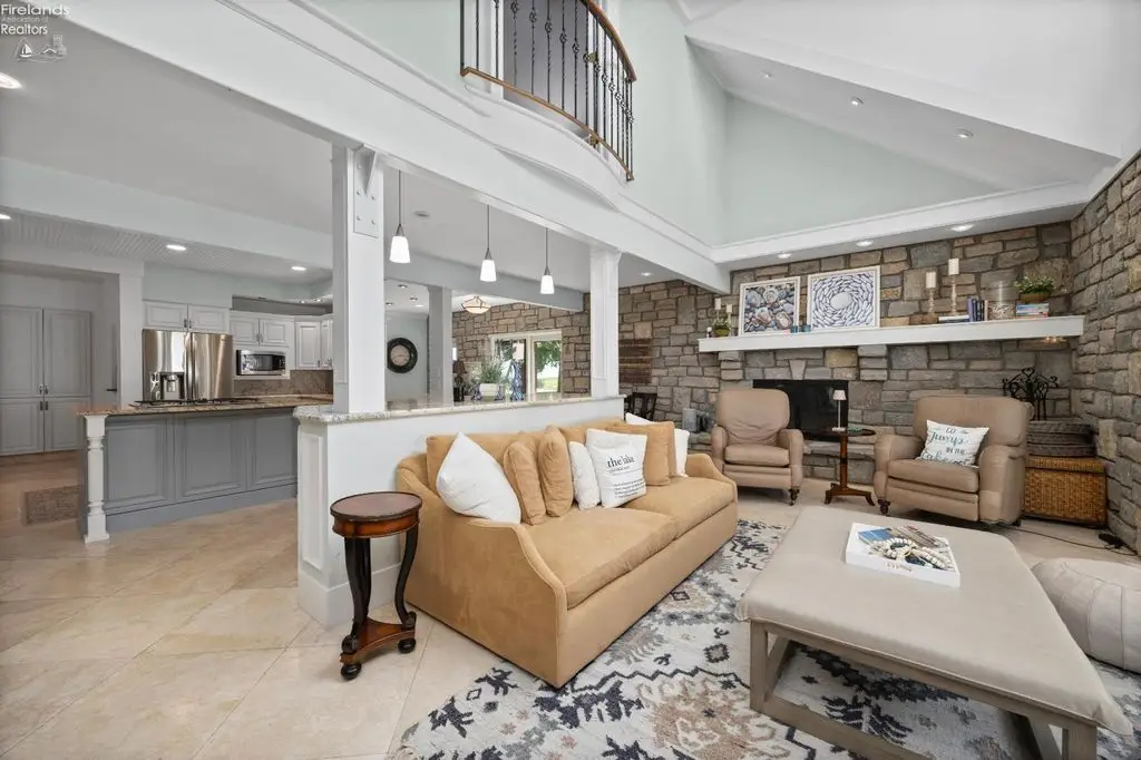 Exquisite Waterfront Luxury Estate - Sunrise & Sunset Views / 1.5+ Acres / 5,000+ SqFt Welcome to your private retreat on the water - where luxury, recreation, and nature unite. This custom all-brick estate offers breathtaking sunrise and sunset views with 135 feet of pristine lakefront and 145 feet of protected bayfront, nestled on over 1.5 acres of beautifully landscaped grounds. Enjoy resort-style living with a sandy beach, private volleyball court, putt-putt course, and expansive outdoor living areas perfect for entertaining or relaxing. Gather around the gas firepit, explore the cabana with full bath, or launch directly from your private boat ramp. Inside, more than 5,000 square feet of meticulously designed space includes 4-5 bedrooms, four full and two half baths, and high-end finishes throughout. The gated front entry ensures ultimate privacy. The great room is a showstopper, featuring custom stonework, a cozy fireplace, and open-concept flow into the gourmet kitchen, complete with island seating and wood and stone accents. Elegant Peruvian Travertine tile flows seamlessly through the main living areas. A dedicated wine tasting room with cooler invites quiet moments or lively gatherings. The grand first-floor primary suite boasts a spa-like ensuite bath, walk-in shower, dual vanities, custom walk-in closet, and patio access. A main-floor den with fireplace adds to the inviting warmth. Upstairs, find a spacious loft, three additional bedrooms, and two full baths, perfect for guests or family. Whether you're entertaining on the water, enjoying a peaceful evening by the fire, or soaking in panoramic views, this estate offers Vacationland living at its finest.