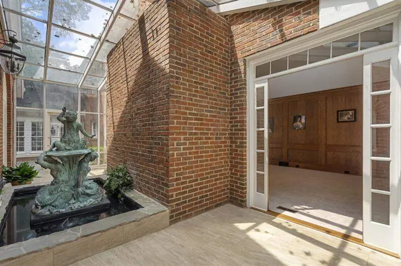 This elegant gated estate rests on 2.23 manicured acres in the heart of Sandy Springs, offering exceptional privacy, architectural sophistication, and an abundance of living space both inside and out. A long, landscaped driveway leads to a grand brick facade with classic columns. The grand double doors welcome you into a breathtaking two-story foyer featuring polished marble floors and a sweeping staircase. To the left, the formal living room invites conversation with its fireplace and abundant natural light, while across the foyer the formal dining room exudes elegance with marble flooring and a mirrored feature wall. The richly paneled den, accented by coffered ceilings and a fireplace, offers a warm and refined space for quiet reading or intimate gatherings. Nearby, a solarium with floor-to-ceiling windows and an antique fountain opens into an expansive media and entertainment room, complete with built-in cabinetry, a retractable awning, surround sound, and dramatic Palladian-style windows that flood the space with light. The heart of the home lies in the gourmet kitchen, with white custom cabinetry, porcelain tile flooring, stainless steel appliances including a built-in steamer, tile backsplash, and off-white Corian countertops. A spacious breakfast room and adjacent sunroom provide stunning views of the backyard, creating a peaceful setting for daily living. The main level also features a large primary suite with dual oversized closets and a private en suite bath, ideal for guests. Upstairs, the luxurious secondary primary suite is a true retreat, highlighted by a lighted double tray ceiling, spa-inspired bath with dual vanities, a jacuzzi tub, and a custom-designed oversized closet. Additional upstairs bedrooms are generously sized and share well-appointed baths, offering comfort and privacy for family and guests. The finished terrace level expands the home's living space with a versatile layout that includes a home office, a full bath, a wet bar, a game area