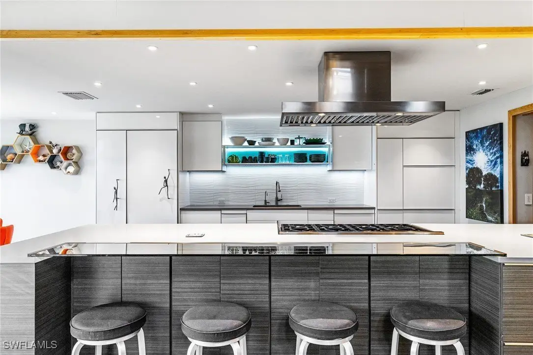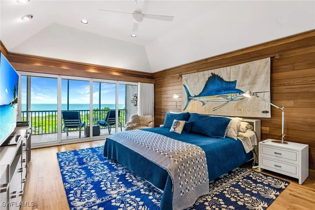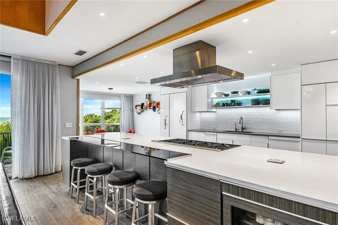 Beachcombers and boaters will appreciate this furnished modern/mid-century gulf front condo - one of only two units - offering 4 bedrooms, 4.5 baths with panoramic views of the gulf. Soaring cathedral ceilings creates the feeling of spaciousness in the living area and modern kitchen which features an expansive island with breakfast bar, 8-burner gas stove, double-oven, steam/warming tray, wine cooler, and trash compactor. Extensive use of wood throughout, solid wood doors, and 3 gulf front lanais. Two guest bedrooms with en suite bathroom and balcony. Beautiful gulf view from primary bedroom with screened-in lanai, bathroom with large walk-in shower, 2 shower heads & double vanities. 4-car tandem garage, and lower level walkout lanai leading directly to the private boardwalk to the beach. Condo is part of Kinzie Island's HOA enjoying a 50' pool, assigned boat slip on canal with gulf access, private beach lockers, showers & restrooms, fitness center, clay tennis/pickleball and bocce courts. This is a truly one-of-a-kind property on Sanibel and a lifestyle that's second to none!