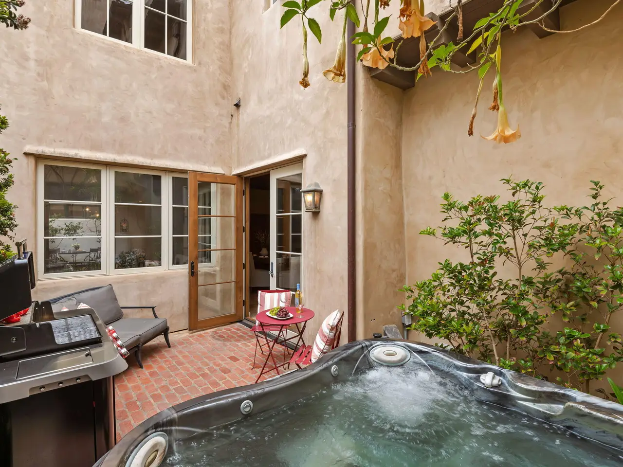 Luxury Living in Downtown Santa Barbara at Anacapa Villas, a gated enclave of 8 Tuscan-style homes just steps from State Street, the waterfront, and Funk Zone. Designed by renowned architect Barry Berkus and built in 2006, this approx. 2,900 sq. ft. home features 3 beds, 3.5 baths, a loft den, and an attached 2-car garage. Enjoy two private brick patios (one with a spa), natural stone floors, vaulted ceilings, solid wood doors, and custom iron fixtures. The gourmet kitchen boasts granite counters, stainless appliances, and a Thermador 6-burner range. The spacious primary suite offers a spa-like bath, walk-in closet, and balcony. A second-floor guest bedroom offers a private bathroom and walk-in closet. The oversized top floor ensuite bedroom enjoys wonderful mountain and Riviera views.