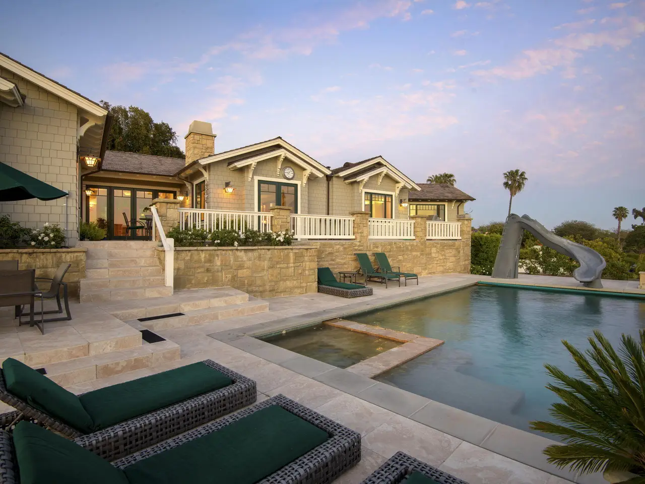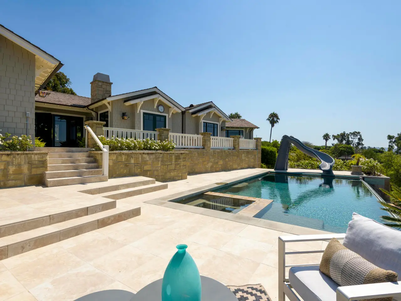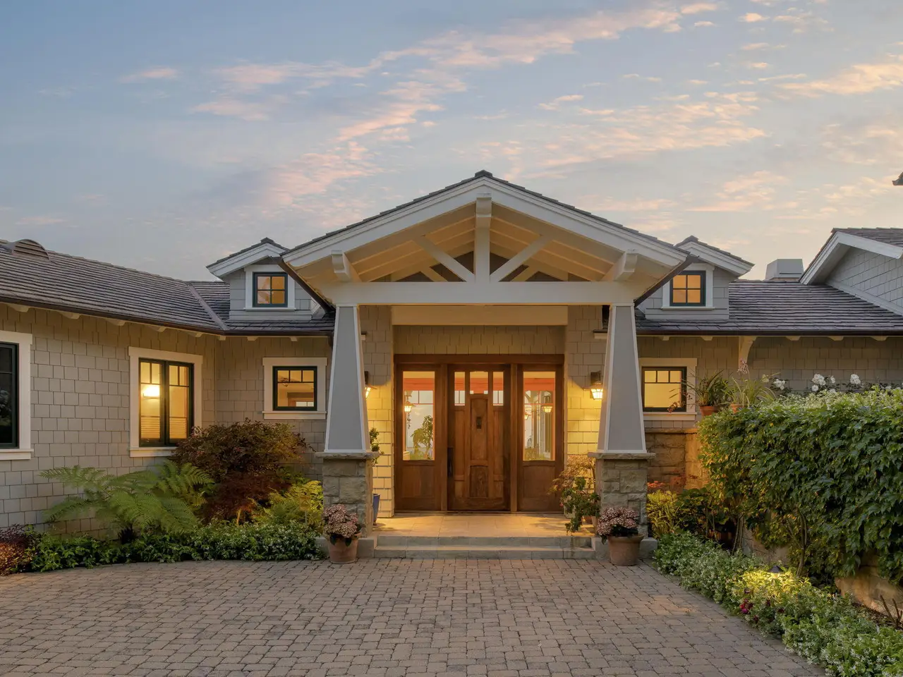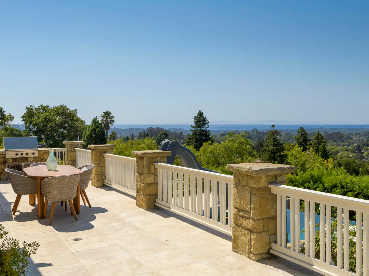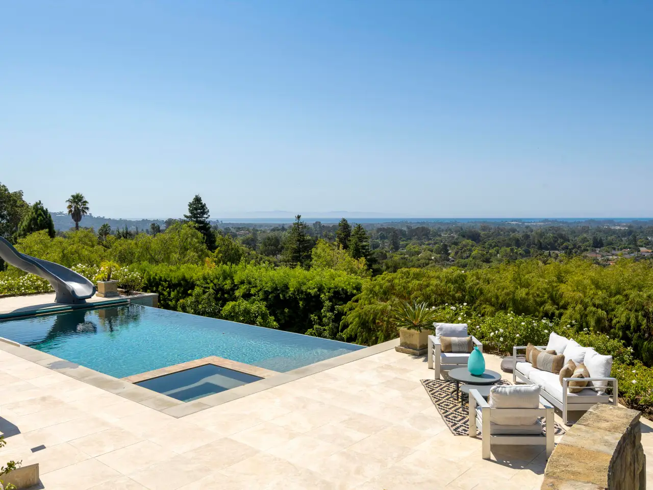 Perched on a Park Highlands promontory with 180-degree ocean, island, and mountain views, this modern Craftsman-inspired retreat offers luxurious living and year-round sunsets. Enjoy Santa Barbara's iconic pink mountain moments from expansive view decks, an infinity pool, and lush, fruit-filled gardens. Inside, rich Arts & Crafts details include natural wood, stonework, built-ins, and a spacious kitchen opening to a great room with fireplace and bar. Views surround the formal living, dining and family rooms which are framed by classic Craftsman pillars and rich wood detail. The primary suite is a serene escape with spa bath, fireplace, and private balcony. All bedrooms feature ensuite baths and walk-in closets. A separate-entry suite adds flexible space for guests, gym, or office.