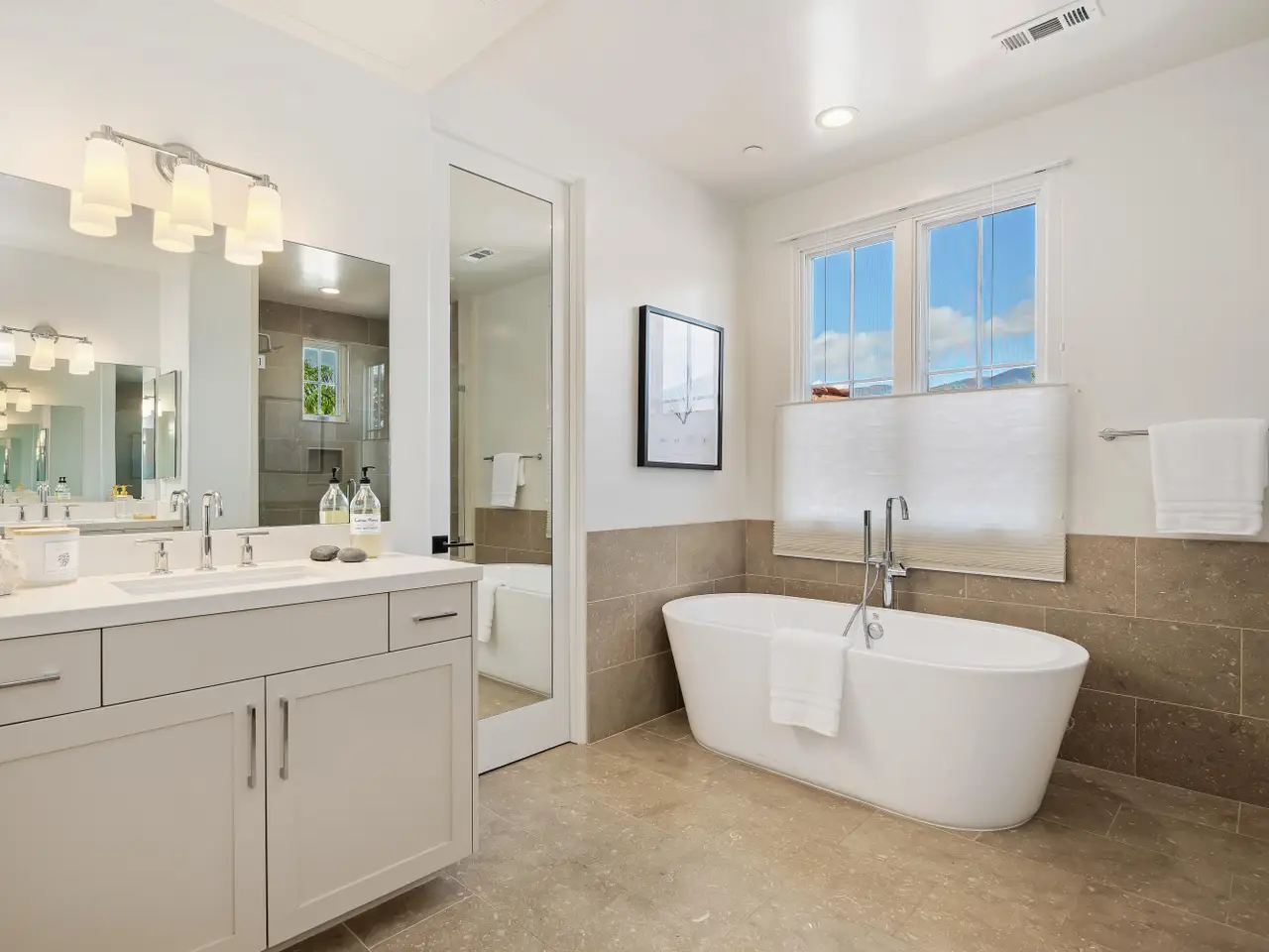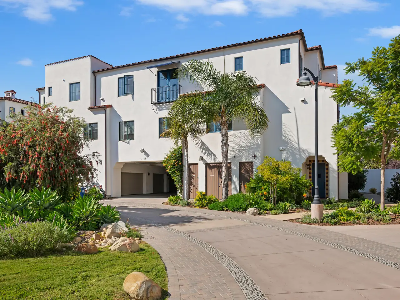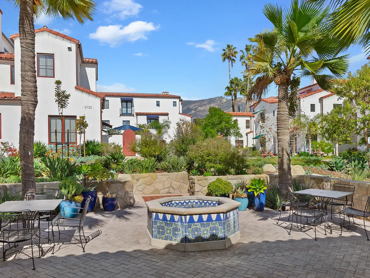 Welcome to Estancia, a contemporary enclave built in 2018 located on vibrant Upper State Street. This 2,045 sf home offers 3 bedrooms and 3 full baths, making it one of the largest in the community. Premiere location at the quiet rear of the HOA. Expansive great room with 10-ft ceilings, open living and dining, fireplace, and gourmet kitchen with island and stainless appliances. Abundant windows and a private balcony capture mtn. views. Designer touches include gray oak floors, quartz countertops, and intricate tile work. The spacious primary suite boasts a Juliet balcony, spa-like bath with dual sinks, soaking tub, separate shower, soothing mountain views, and two walk-in closets. A/C. Attached garage and a dedicated uncovered parking space. Walk to shops, dining, and La Cumbre Plaza.