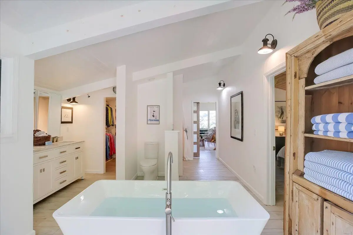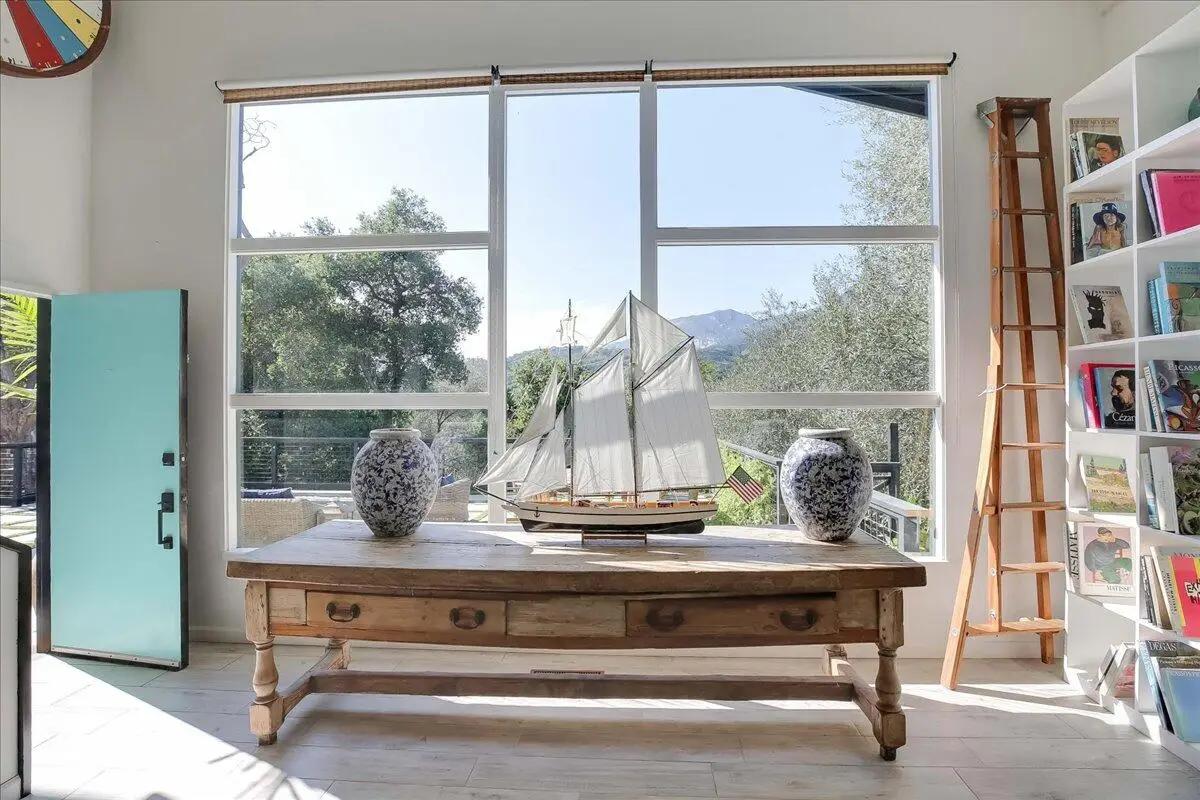 Up a scenic, private drive this mid-century, four bed/three bath home offers striking architecture, dual living, and epic SY mountain views from every space. Vaulted ceilings, picture windows, and indoor-outdoor flow define all living areas opening to the expansive view terrace and side garden w/dining area and chicken coop. A showstopper, modern farmhouse kitchen and dining area features pretty blue tile and long island under volume ceiling. Large folding doors allow open-air connection for entertaining inside and out. Occupying entire 2nd floor, a luxurious primary retreat w/loft sitting room, private deck, and spa bath is a serene sanctuary. On first floor: BR 2 has private entrance, bunk beds, kitchenette, private patio. BR 3 w/walk-in closet also has door to BR 4 with doors to patio. attached 3-car garage. At the top of a scenic, private drive, this remodeled mid-century gem blends artful design with a relaxed California spirit. Set on just over an acre near the Santa Barbara Botanic Garden, the home is embraced by verdant landscaping and towering trees in a lush hillside setting. The main living spaces open to an expansive entry terrace that faces the Santa Ynez Mountains a dramatic, ever-changing backdrop. Vaulted, whitewashed beam ceilings soar above the living room, where picture windows frame the views and French doors lead to the side yard. A custom corner fireplace adds warmth and architectural interest. The remodeled modern farmhouse-style kitchen and dining area is a showpiece, with a massive quartz island, Wedgewood-blue tile, and abundant natural light enhancing its airy appeal. Large folding doors open to the view terrace, creating a seamless indoor-outdoor flow. A charming side yard off the living room offers both dining and lounge areas. When occupied, the spacious chicken coop provides a cheerful presence and fresh eggs daily. The living room is central to everything, and up the stairs, the entire upper level is devoted to a luxurious primary retreat. A sunny loft-style sitting area welcomes you at the top of the stairs, overlooking both mountains an living room below. The bedroom, with walk-in closet, opens to a shady private deck, while the spa-inspired bath features a glass shower and a soaking tub before a wall of windows. Downstairs, three bedrooms offer distinct personalities. BR2 is a whimsical suite with a private entrance, built-in bunks, kitchenette, full bath, and patio perfect for dual living. BR3 is en suite with a walk-in closet and a door to BR3 which has French doors to the side patio. With a three-car garage, laundry, thoughtfully updated interiors, and an effortless connection to nature, this residence offers a rare blend of style, seclusion, and natural beauty in one of Santa Barbara's most serene settings.