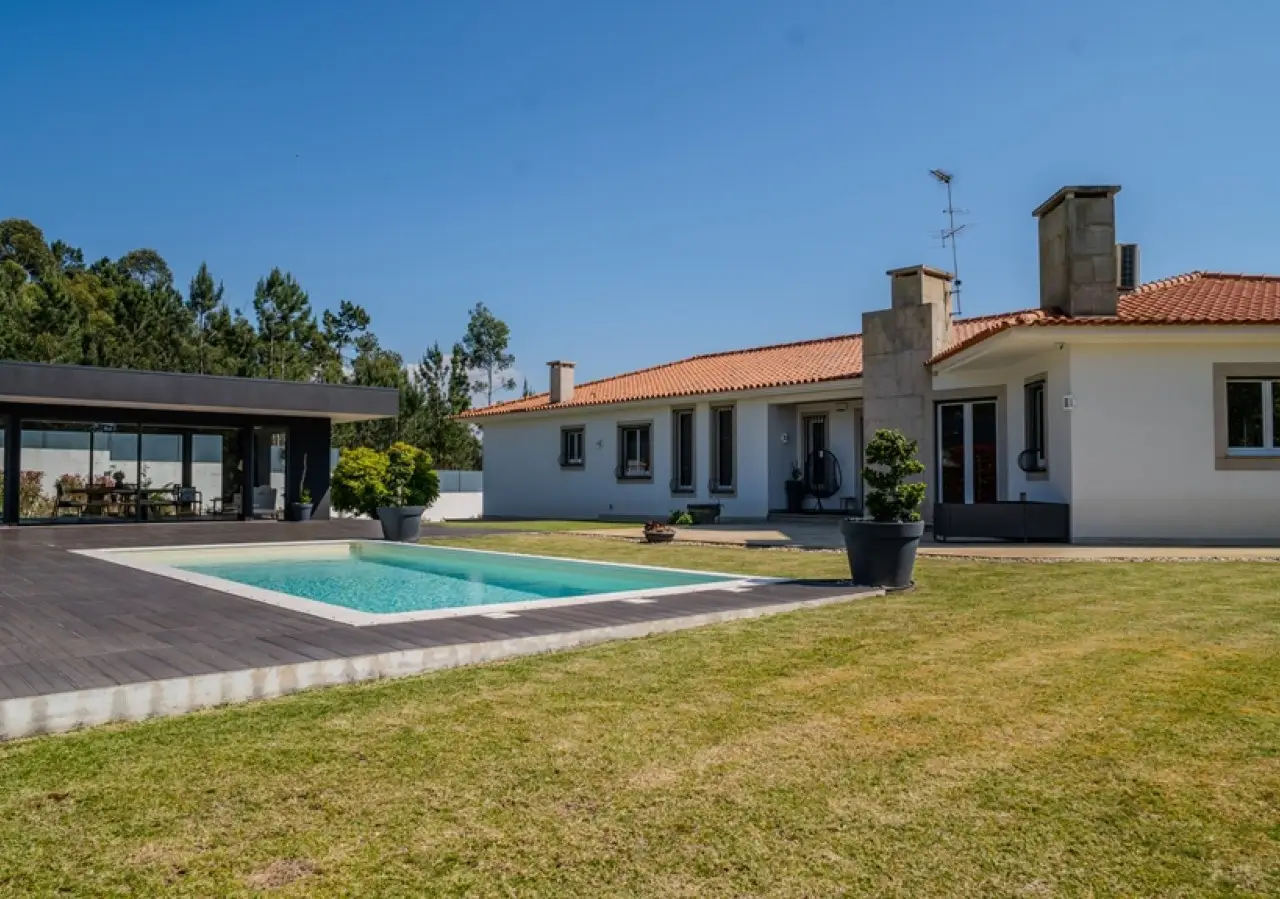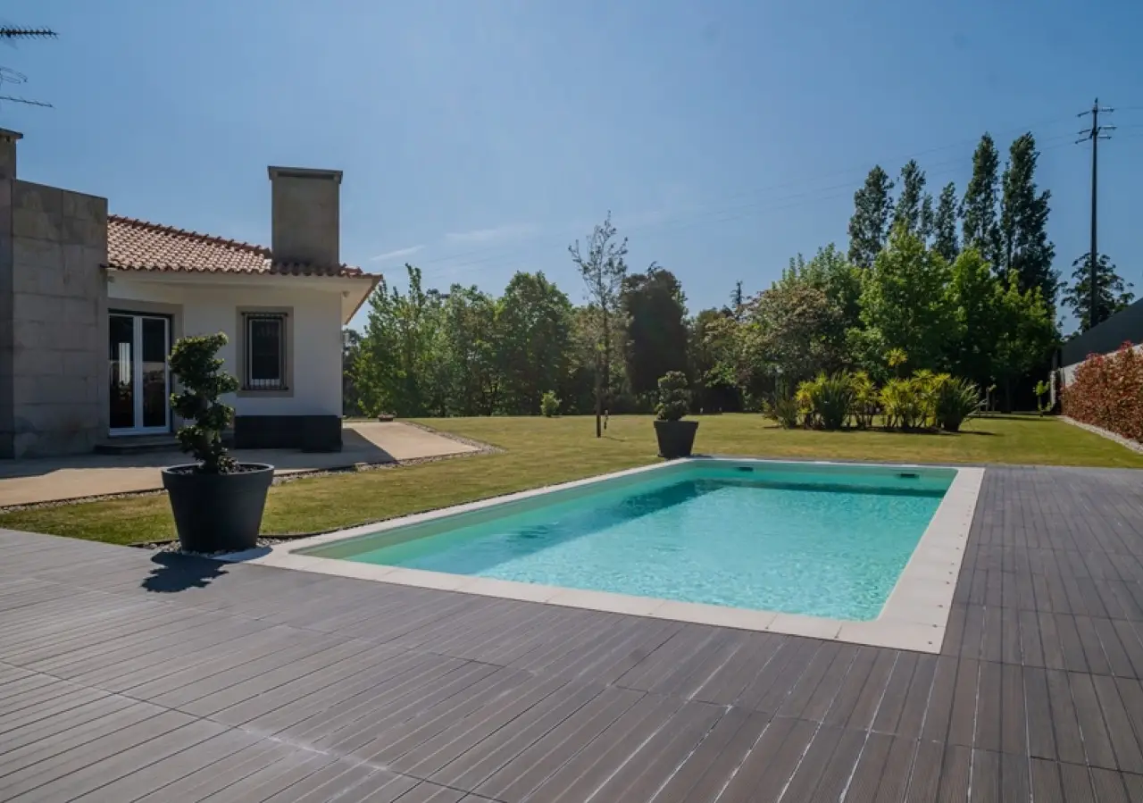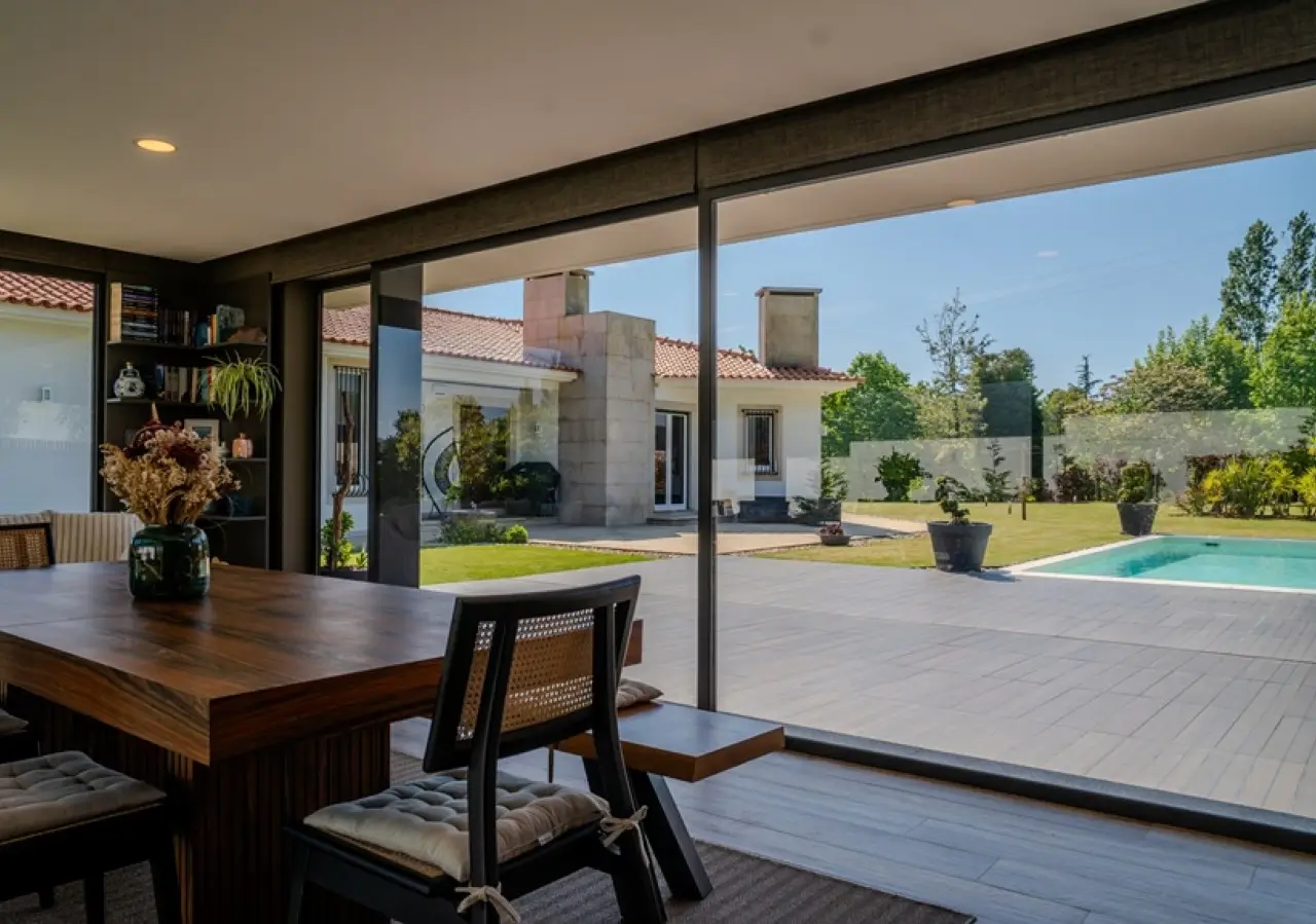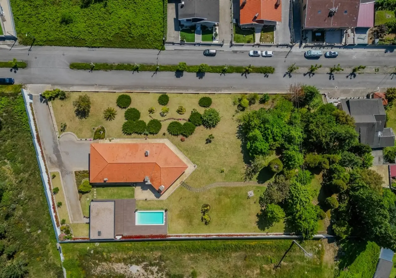 Excellent detached villa set in a plot of around 1,650 m², for sale in Santa Maria da Feira. This is a true haven for those seeking quality of life and exclusivity, with large spaces bathed in natural light, in which each room has been designed to provide well-being and functionality. The private area of this property includes four magnificent suites, all with excellent finishes, including marble in all the bathrooms, wooden floors and generous areas, central heating and air conditioning, providing comfort and privacy. But what really sets this property apart are its social areas: on the first floor, the living room and dining room, extremely comfortable and bright, have a cozy and elegant atmosphere; the kitchen, in turn, is modern and fully equipped, combining design and practicality, ideal for family gatherings or friends. In the basement there is a distinctive space with a bar, games area, wine cellar, TV room and gym, perfect for entertaining or simply relaxing in the comfort of home, plus a large laundry room and a toilet. And outside, the setting is simply stunning: a vast, meticulously tended garden surrounds the house, creating an atmosphere of tranquillity and beauty, with an automatic irrigation system. There is also a magnificent swimming pool with a covered lounge area, equipped with a kitchen and a guest toilet, ideal for enjoying sunny days in total privacy. The garage with capacity for three cars ensures day-to-day convenience. All this in a villa that is in excellent condition and where top quality materials and finishes have been used, reflecting exemplary care in every detail. About 25 minutes from Porto. CHARACTERISTICS: Plot Area: 1 650 m2 | 17 760 sq ft Deployment Area: 255 m2 | 2 745 sq ft Building Area: 530 m2 | 5 702 sq ft Bedrooms: 4 Bathrooms: 6 Garage: 3 Energy efficiency: B- FEATURES: Central heating; Air conditioning; Marble in bathrooms; Fireplace; Swimming pool.