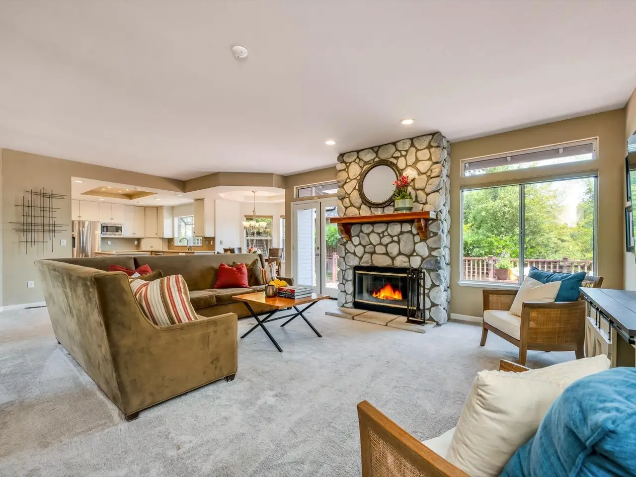 Entertainer's Dream in Private Bennett Valley Setting! Welcome to this expansive home -From the moment you arrive, a two-story entry and sweeping staircase set the tone. Vaulted ceilings soar above a sunken living room anchored by a fireplace,and the adjacent dining area comfortably seats 10, with a great open floor plan. At the heart of the home, the updated kitchen shines. A garden window fills the space with natural light, and new appliances including an induction cooktop and stainless refrigerator. A breakfast nook offers wraparound views of the hills. The open-concept layout flows seamlessly into a cozy den, complete with a wet bar and built-in refrigerator to support entertaining. French doors lead to a generous Trex deck featuring built-in seating, a pergola, and a propane fire tableideal for entertaining. On the first floor, a guest bedroom and full bathroom provide an ideal guest suite. A conveniently placed laundry room adds everyday ease. A 3-car garage offers built-in cabinetry, a workbench, and overhead storage. Retreat upstairs to the primary suite, where vaulted ceilings, a jetted tub, oversized shower, and walk-in closet. Two additional large bedrooms share a double‐sink bathroom with shower over tub. This stunning 4 bedroom home is spacious and comfortable!