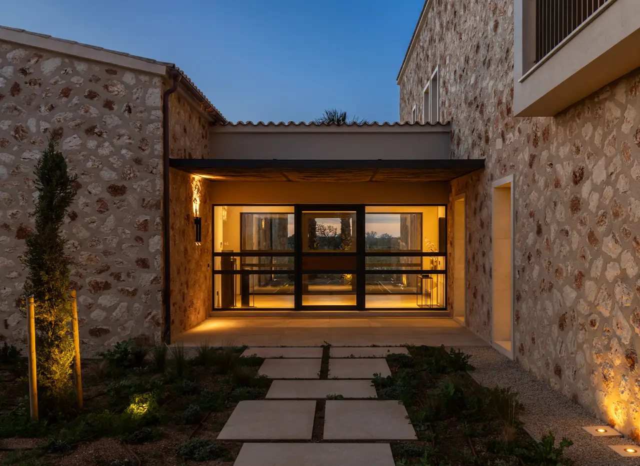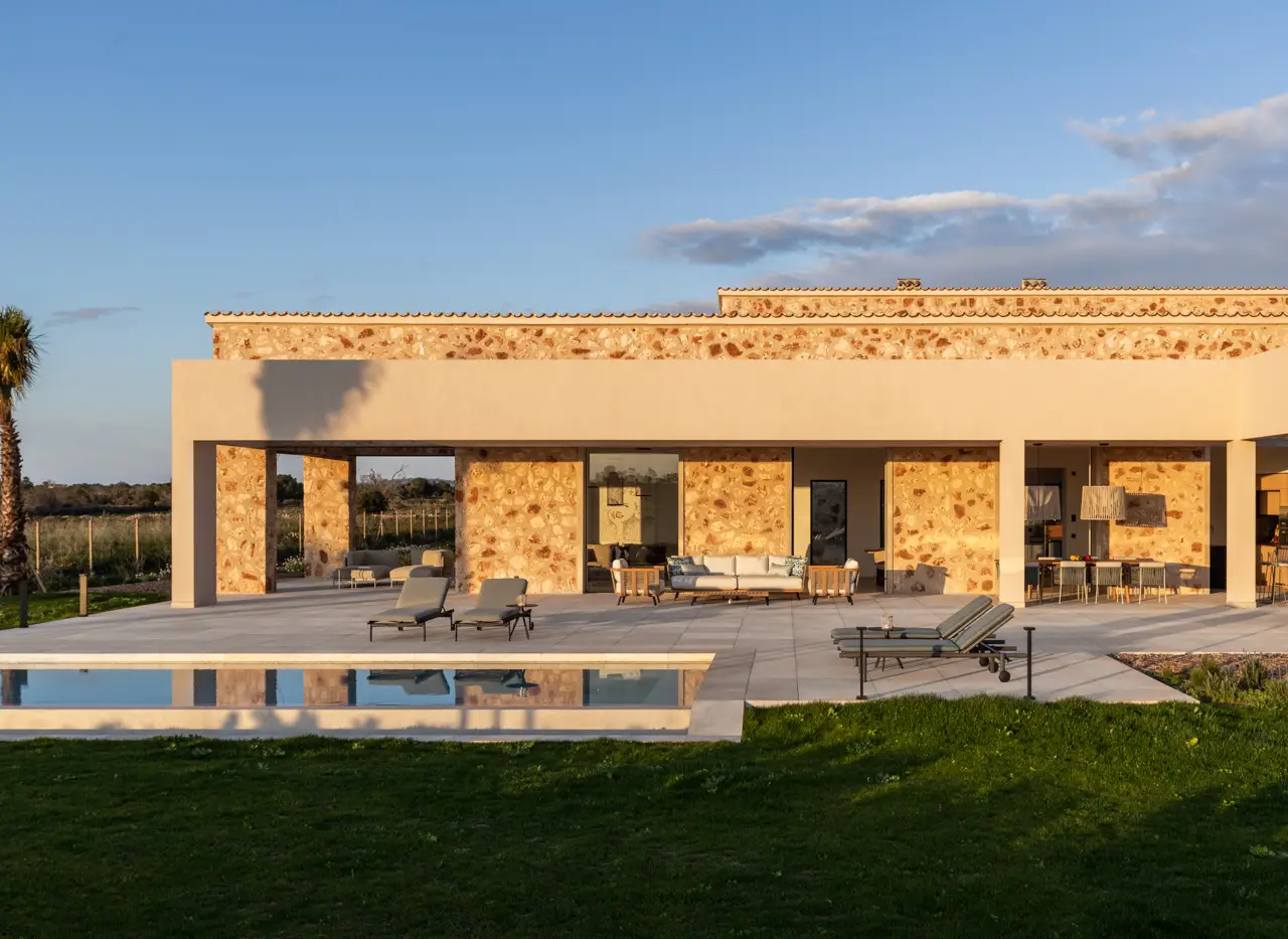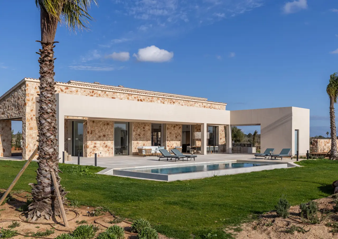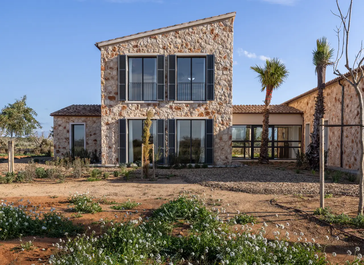 Surrounded by the Mediterranean landscape near Cala Llombards, this exceptional property is set on a generous plot of approx. 18,880 m². Built in 2024, the finca impresses on arrival with a driveway lined with olive trees and modern, minimalist architecture that creates light-flooded rooms through large glass fronts. With a living space of approx. 455 m² on two levels, the property elegantly combines traditional natural stone, fine wooden elements and a harmonious color and lighting concept. The first floor welcomes you with a spacious entrance area that leads into the left wing with a stylish living and dining area complete with fireplace. The luxurious kitchen is equipped with first-class Gaggenau appliances, while the integrated Sonos sound system ensures an incomparable sound experience throughout the house. Four exclusive bedrooms and five elegant bathrooms - including a master bathroom with free-standing bath and shower - guarantee the highest level of living comfort. All bedrooms also have high-quality built-in wardrobes. Modern underfloor heating and air conditioning controlled by the Gira system create a pleasant indoor climate at any time of year. A photovoltaic system with generator, a gas fireplace and two water tanks with a total of 100,000 liters underline the sustainable character of the house. The inviting outdoor area with infinity pool offers absolute privacy and breathtaking views of nature and the fascinating bay of Cala Llombards. A spacious terrace, a BBQ area and an outdoor shower with separate WC invite you to relax and enjoy the Mediterranean surroundings. The garage offers space for two vehicles, a charging station for electric cars and an additional parking space. This exclusive finca combines luxury, comfort and sustainability in perfect harmony. Please do not hesitate to contact us for further information.