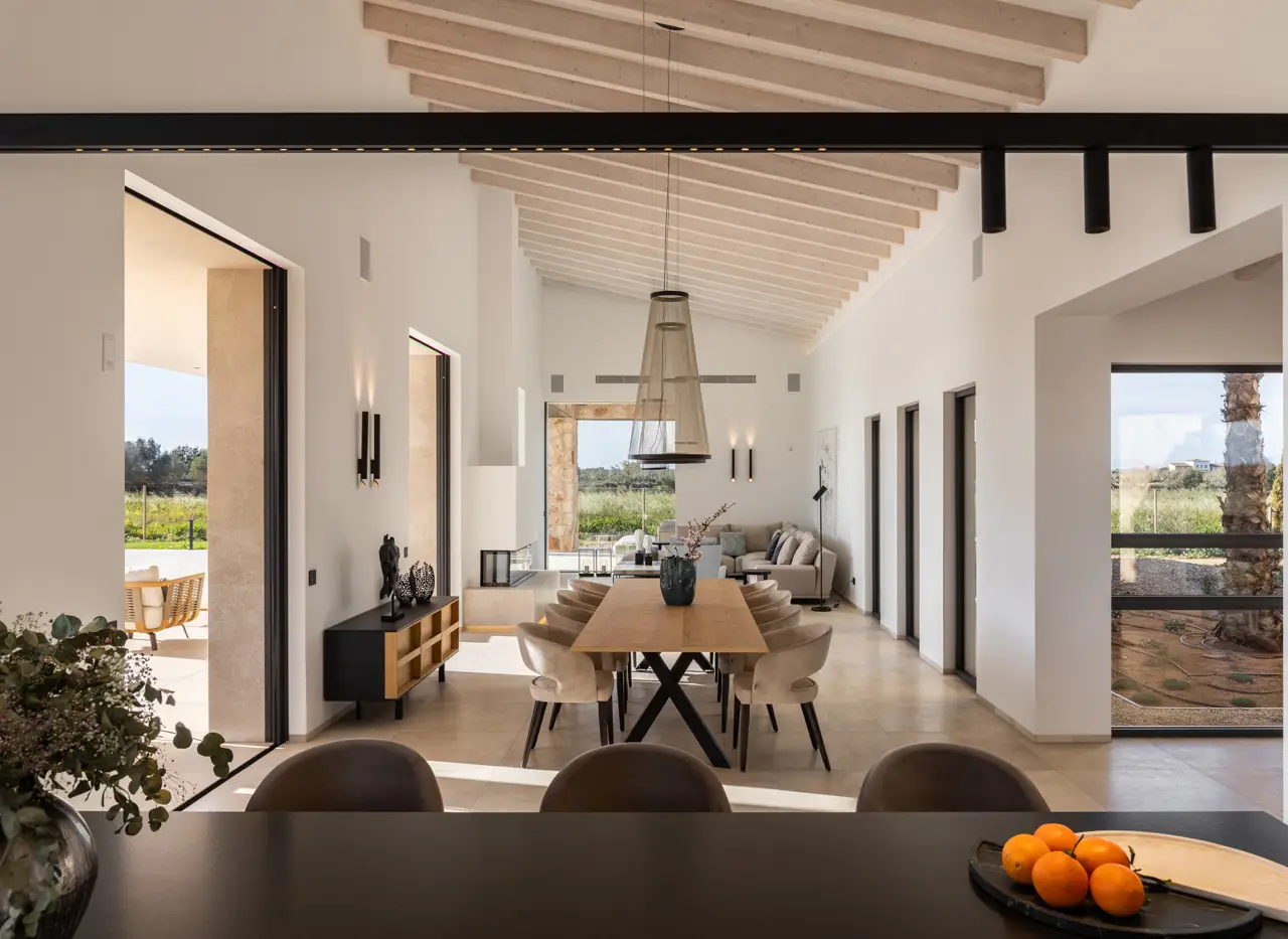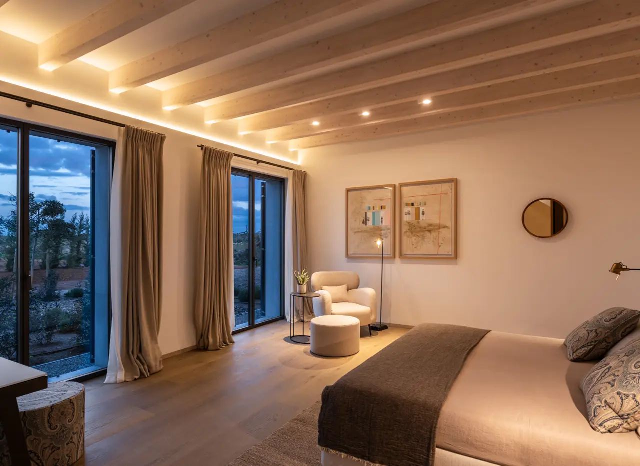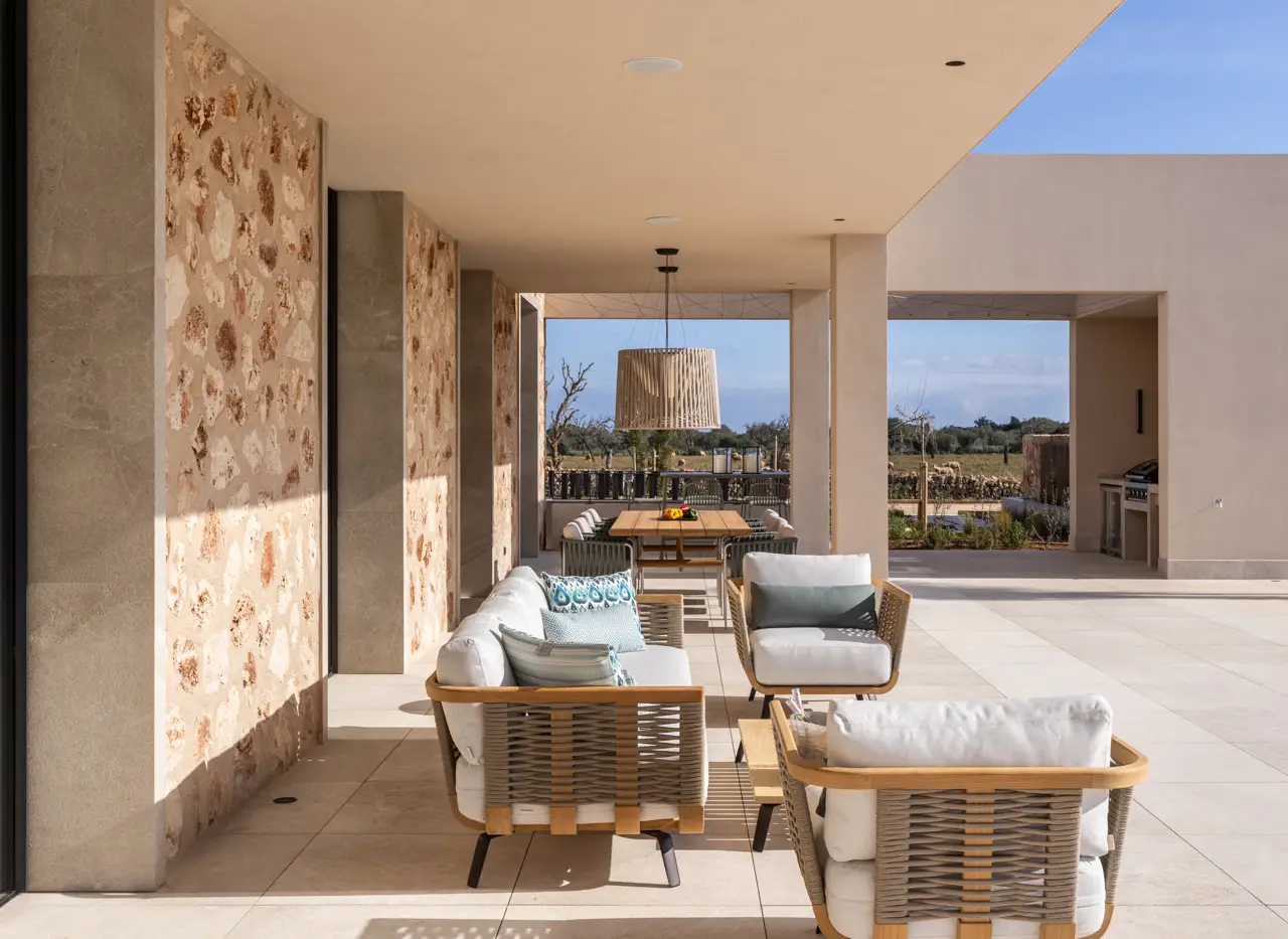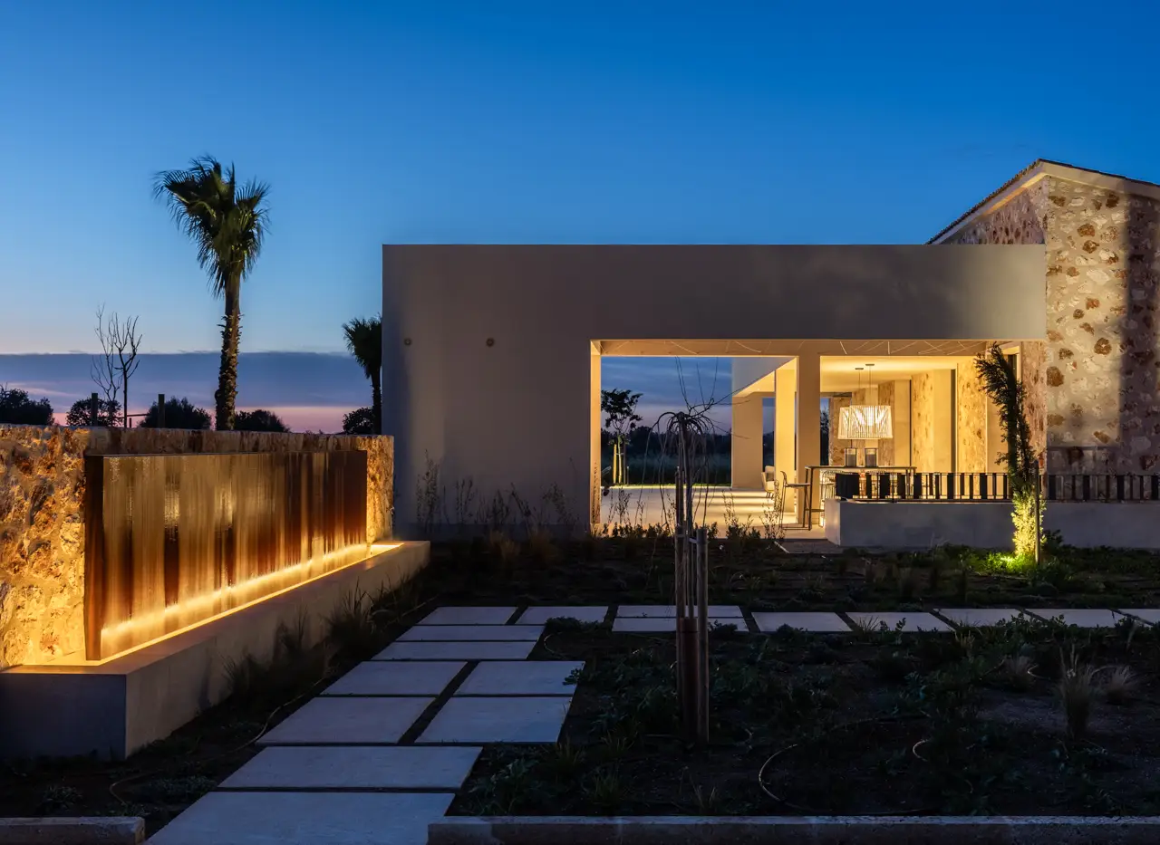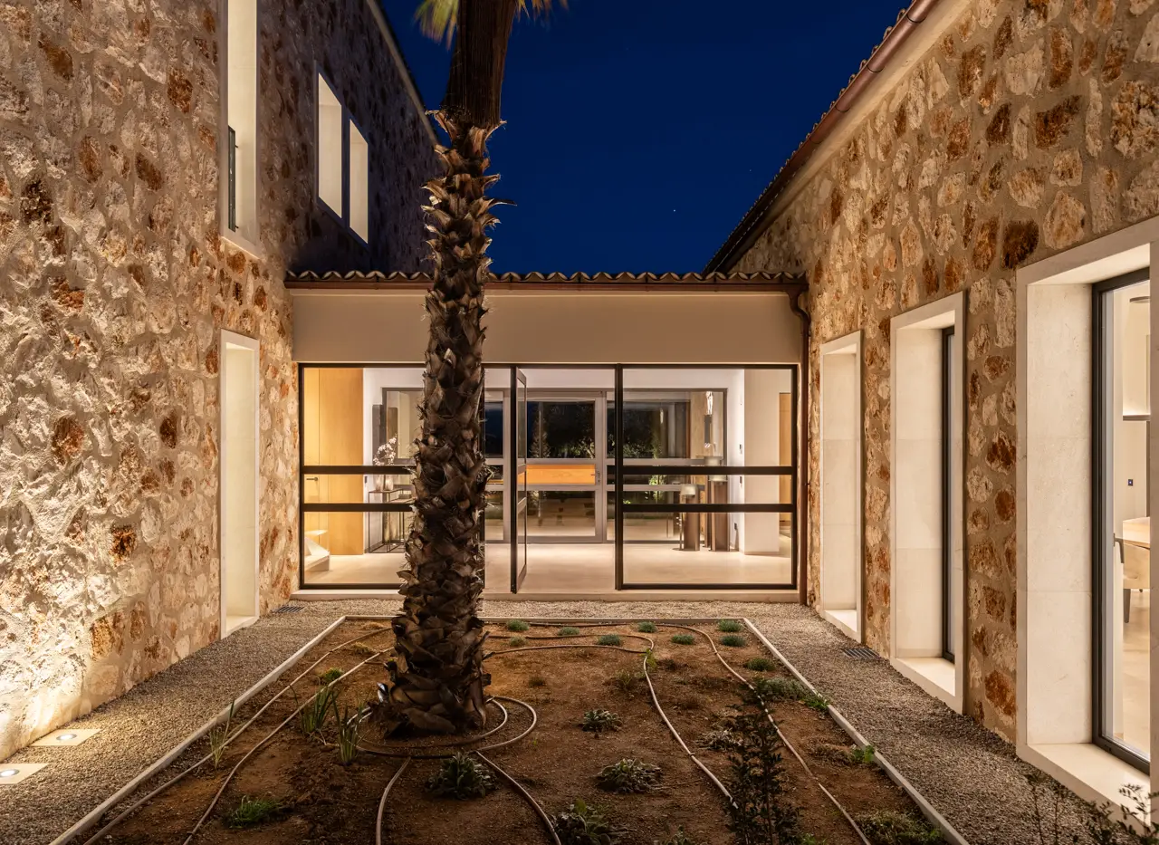 Surrounded by the Mediterranean landscape near Cala Llombards, this exceptional property is set on a generous plot of approx. 18,880 m². Built in 2024, the finca impresses on arrival with a driveway lined with olive trees and modern, minimalist architecture that creates light-flooded rooms through large glass fronts. With a living space of approx. 455 m² on two levels, the property elegantly combines traditional natural stone, fine wooden elements and a harmonious color and lighting concept. The first floor welcomes you with a spacious entrance area that leads into the left wing with a stylish living and dining area complete with fireplace. The luxurious kitchen is equipped with first-class Gaggenau appliances, while the integrated Sonos sound system ensures an incomparable sound experience throughout the house. Four exclusive bedrooms and five elegant bathrooms - including a master bathroom with free-standing bath and shower - guarantee the highest level of living comfort. All bedrooms also have high-quality built-in wardrobes. Modern underfloor heating and air conditioning controlled by the Gira system create a pleasant indoor climate at any time of year. A photovoltaic system with generator, a gas fireplace and two water tanks with a total of 100,000 liters underline the sustainable character of the house. The inviting outdoor area with infinity pool offers absolute privacy and breathtaking views of nature and the fascinating bay of Cala Llombards. A spacious terrace, a BBQ area and an outdoor shower with separate WC invite you to relax and enjoy the Mediterranean surroundings. The garage offers space for two vehicles, a charging station for electric cars and an additional parking space. This exclusive finca combines luxury, comfort and sustainability in perfect harmony. Please do not hesitate to contact us for further information.