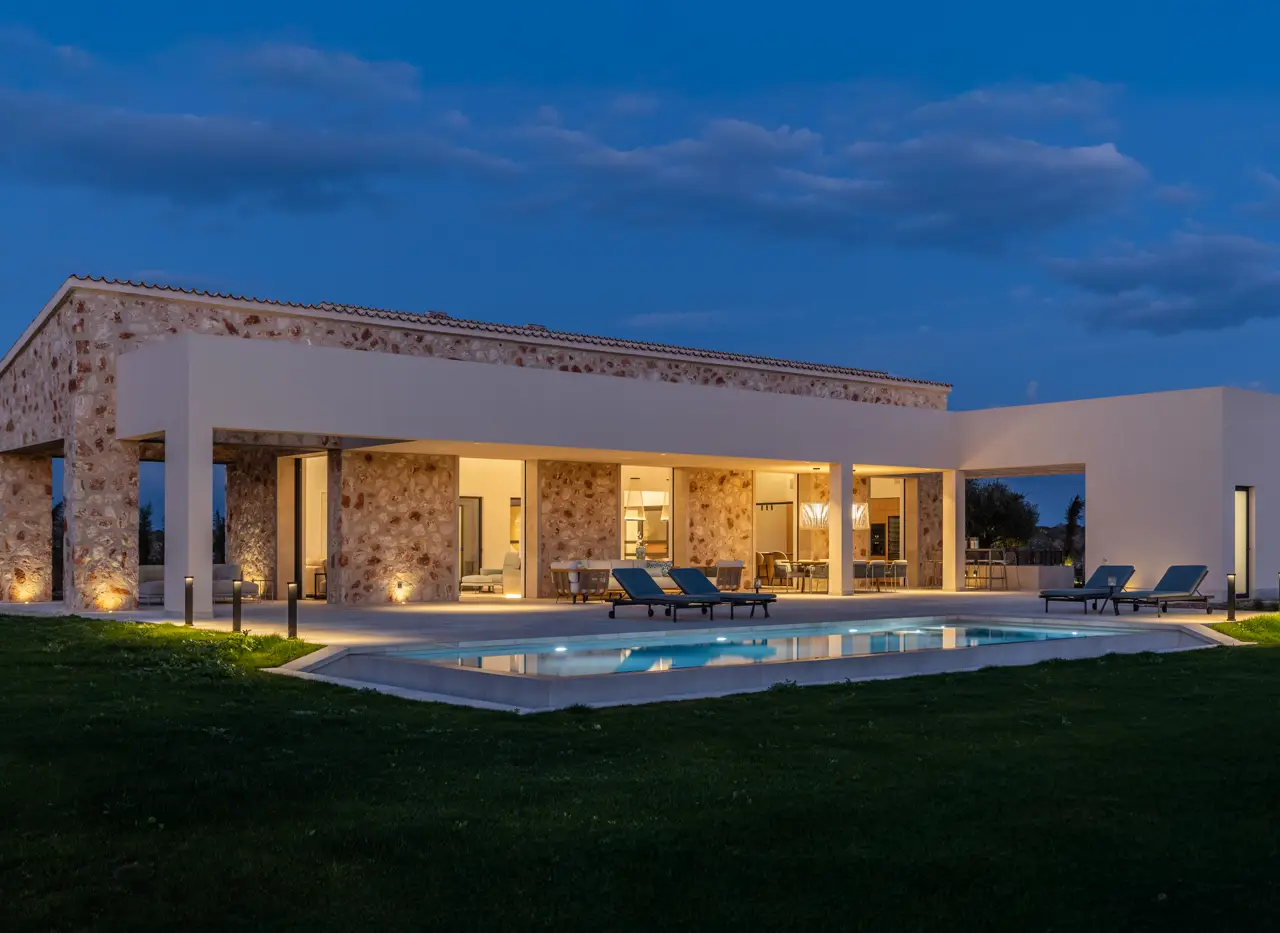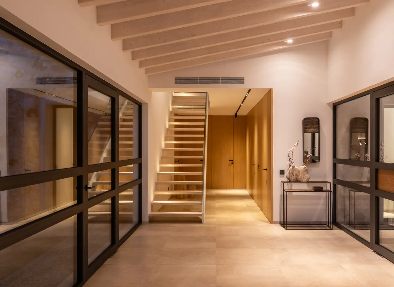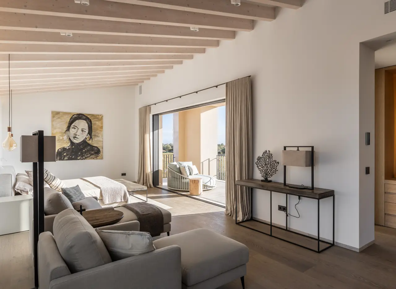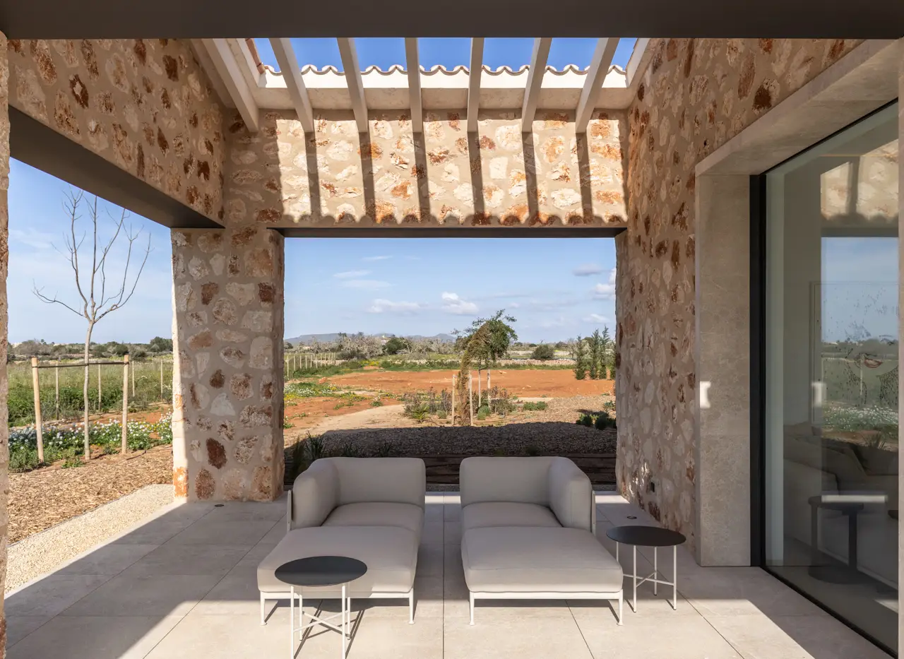 Surrounded by the Mediterranean landscape near Cala Llombards, this exceptional property is set on a generous plot of approx. 18,880 m². Built in 2024, the finca impresses on arrival with a driveway lined with olive trees and modern, minimalist architecture that creates light-flooded rooms through large glass fronts. With a living space of approx. 455 m² on two levels, the property elegantly combines traditional natural stone, fine wooden elements and a harmonious color and lighting concept. The first floor welcomes you with a spacious entrance area that leads into the left wing with a stylish living and dining area complete with fireplace. The luxurious kitchen is equipped with first-class Gaggenau appliances, while the integrated Sonos sound system ensures an incomparable sound experience throughout the house. Four exclusive bedrooms and five elegant bathrooms - including a master bathroom with free-standing bath and shower - guarantee the highest level of living comfort. All bedrooms also have high-quality built-in wardrobes. Modern underfloor heating and air conditioning controlled by the Gira system create a pleasant indoor climate at any time of year. A photovoltaic system with generator, a gas fireplace and two water tanks with a total of 100,000 liters underline the sustainable character of the house. The inviting outdoor area with infinity pool offers absolute privacy and breathtaking views of nature and the fascinating bay of Cala Llombards. A spacious terrace, a BBQ area and an outdoor shower with separate WC invite you to relax and enjoy the Mediterranean surroundings. The garage offers space for two vehicles, a charging station for electric cars and an additional parking space. This exclusive finca combines luxury, comfort and sustainability in perfect harmony. Please do not hesitate to contact us for further information.