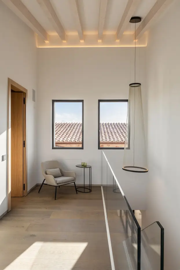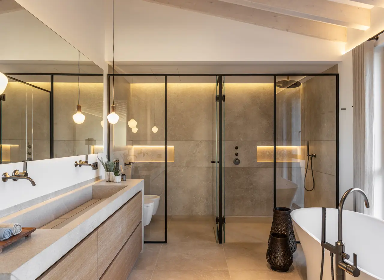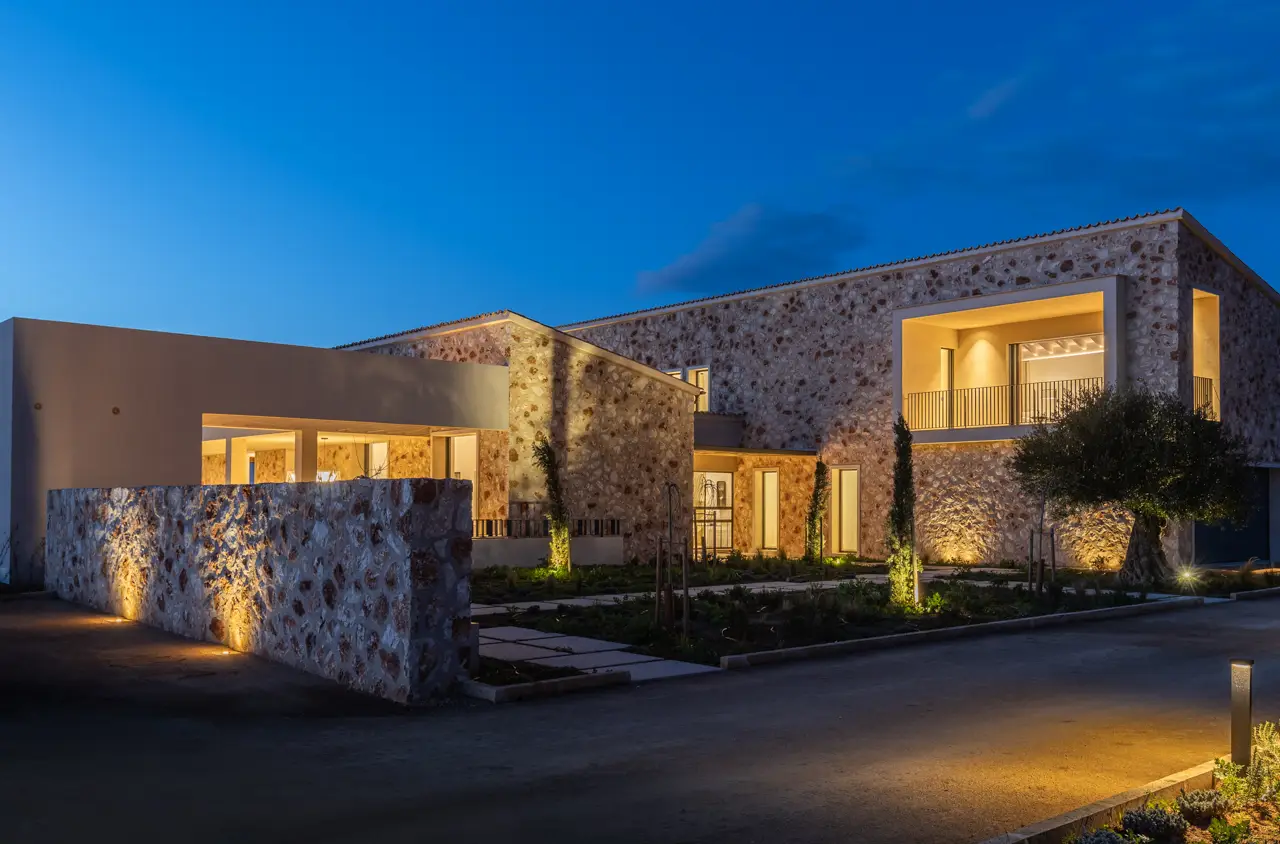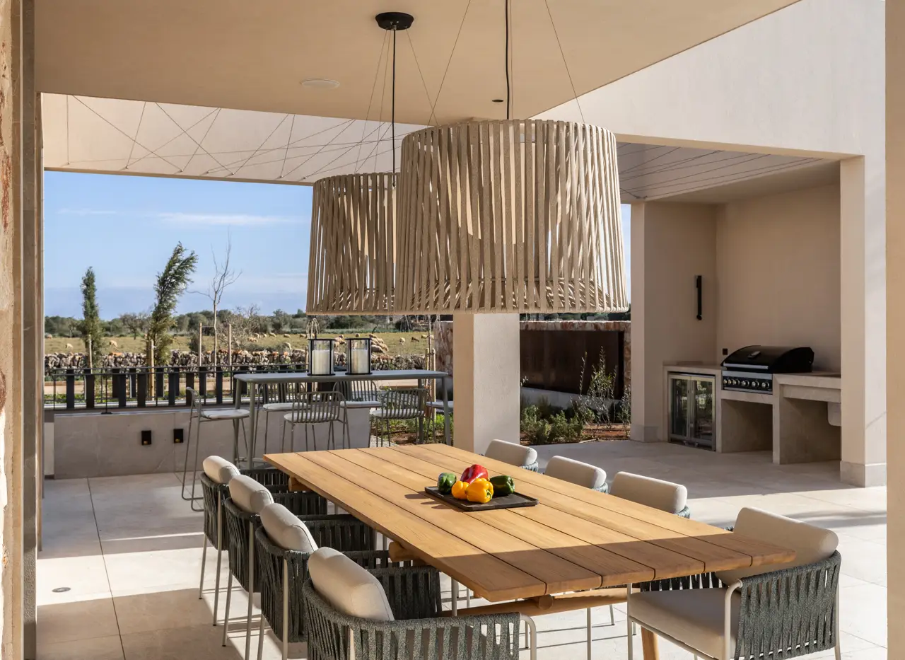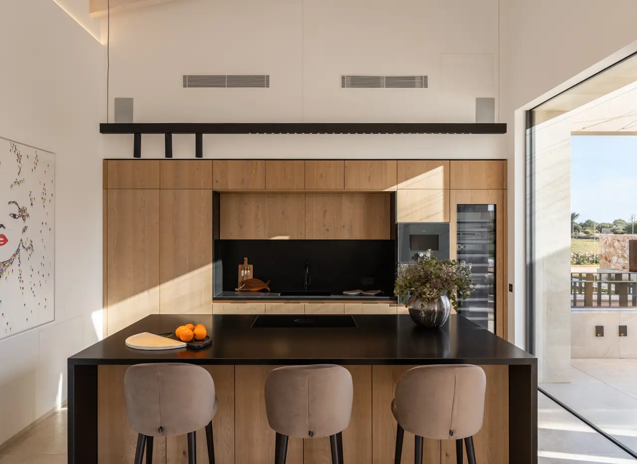 Surrounded by the Mediterranean landscape near Cala Llombards, this exceptional property is set on a generous plot of approx. 18,880 m². Built in 2024, the finca impresses on arrival with a driveway lined with olive trees and modern, minimalist architecture that creates light-flooded rooms through large glass fronts. With a living space of approx. 455 m² on two levels, the property elegantly combines traditional natural stone, fine wooden elements and a harmonious color and lighting concept. The first floor welcomes you with a spacious entrance area that leads into the left wing with a stylish living and dining area complete with fireplace. The luxurious kitchen is equipped with first-class Gaggenau appliances, while the integrated Sonos sound system ensures an incomparable sound experience throughout the house. Four exclusive bedrooms and five elegant bathrooms - including a master bathroom with free-standing bath and shower - guarantee the highest level of living comfort. All bedrooms also have high-quality built-in wardrobes. Modern underfloor heating and air conditioning controlled by the Gira system create a pleasant indoor climate at any time of year. A photovoltaic system with generator, a gas fireplace and two water tanks with a total of 100,000 liters underline the sustainable character of the house. The inviting outdoor area with infinity pool offers absolute privacy and breathtaking views of nature and the fascinating bay of Cala Llombards. A spacious terrace, a BBQ area and an outdoor shower with separate WC invite you to relax and enjoy the Mediterranean surroundings. The garage offers space for two vehicles, a charging station for electric cars and an additional parking space. This exclusive finca combines luxury, comfort and sustainability in perfect harmony. Please do not hesitate to contact us for further information.
