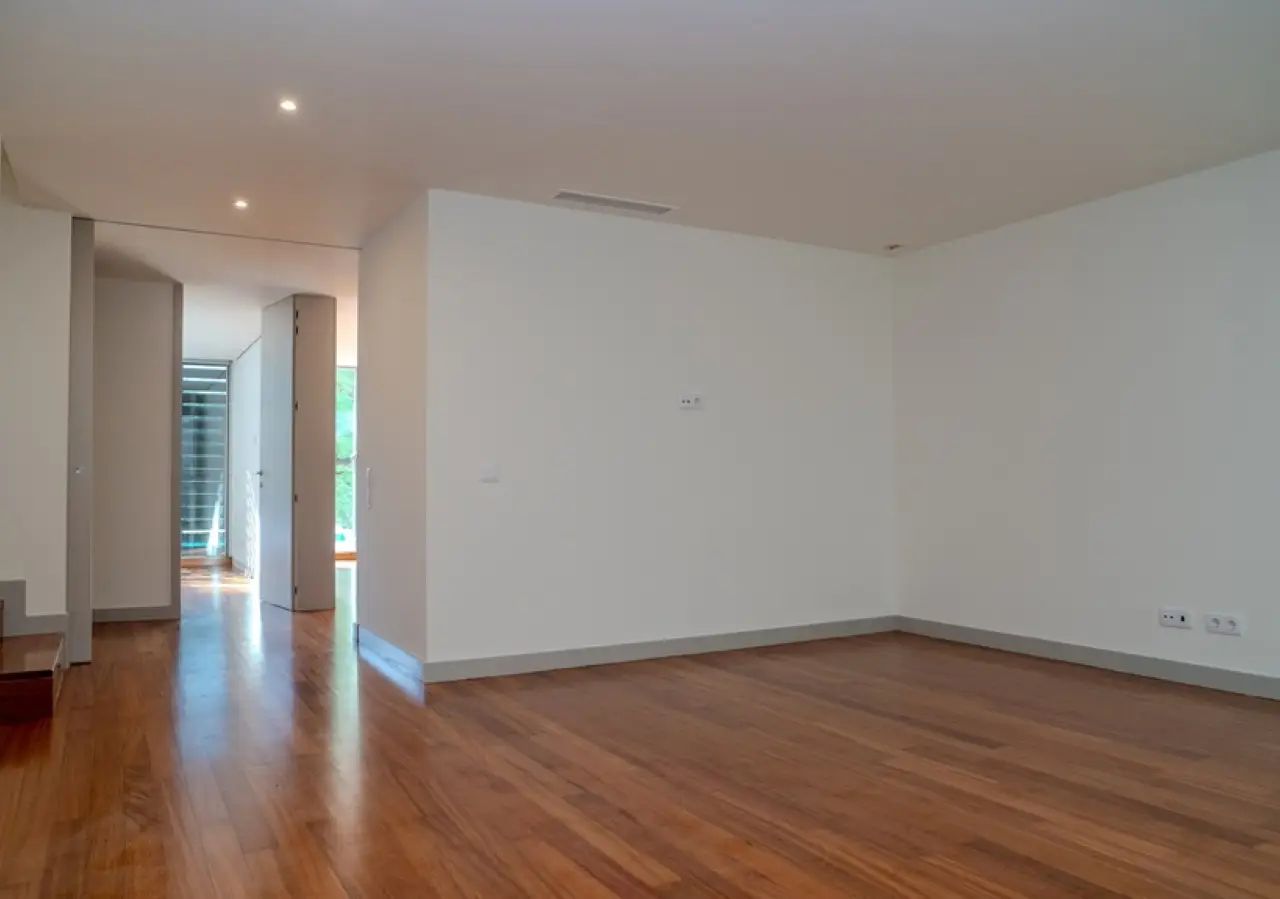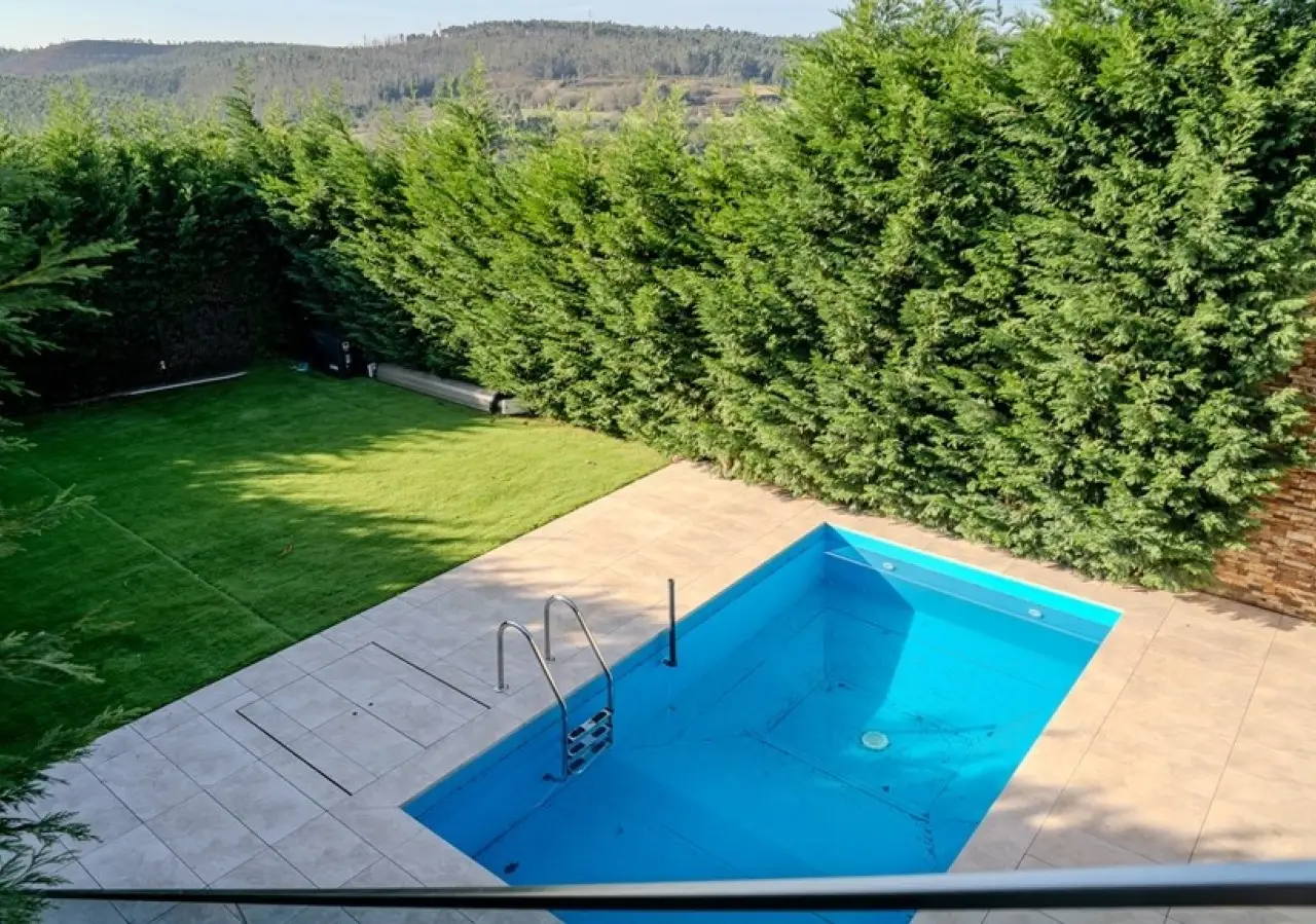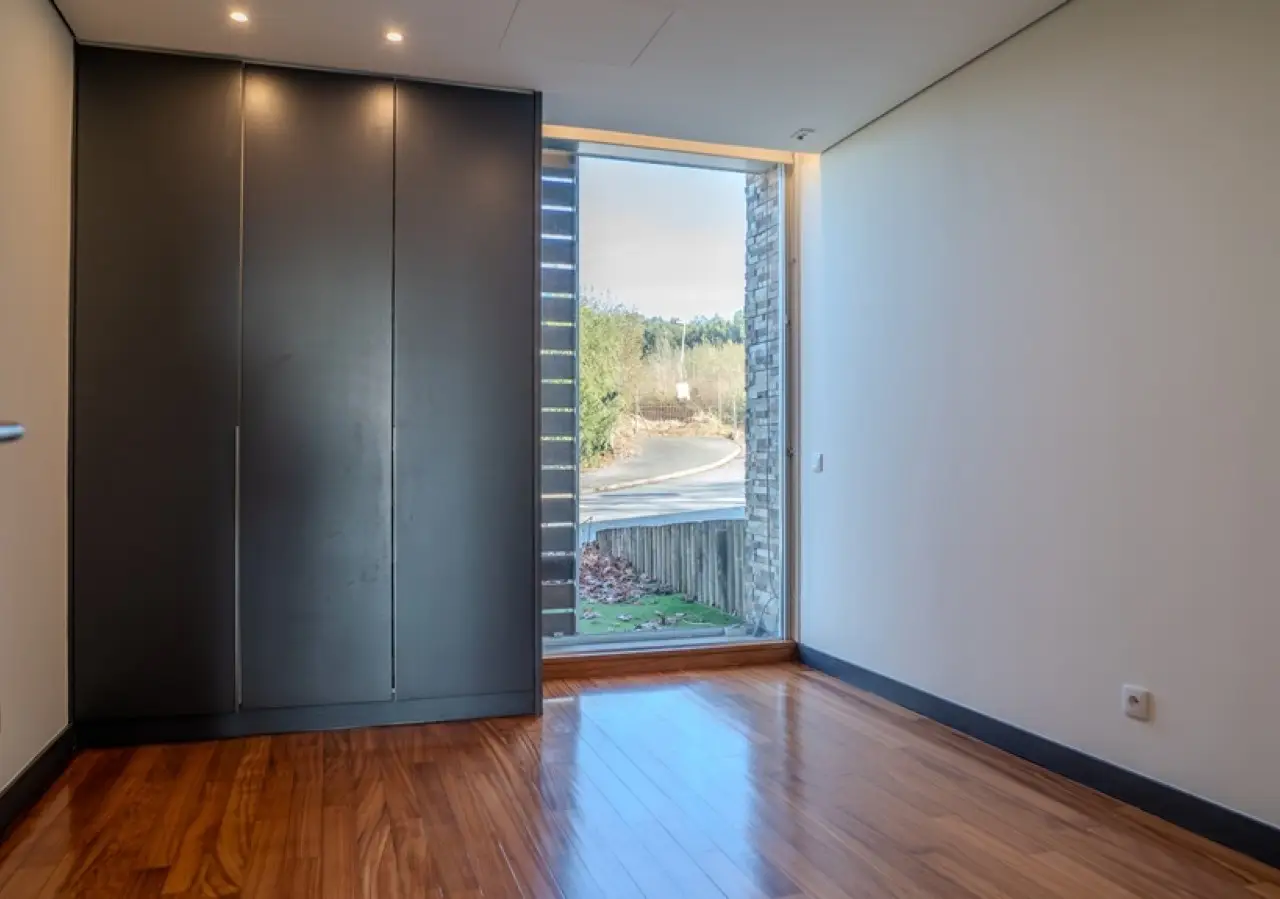 Fantastic two-storey villa with a modern design, set in rural surroundings in a prestigious gated community in the Vale Pisão Nature and Golf Resort, Santo Tirso. In excellent condition, with a fully refurbished kitchen and bathrooms, this villa has a large, bright living area that opens onto a generous balcony with magnificent views. Also on this floor, there is a fully equipped kitchen, a complete bathroom and a bedroom or office. On the lower floor is another living room and the bedroom area, including a master suite with dressing room and two bedrooms that share a bathroom. All rooms have direct access to the private garden with swimming pool, surrounded by greenery and with views of the mountains. At this resort you can also enjoy the Golf Academy, the Clubhouse with restaurant, lounge and bar, as well as controlled access with 24-hour security. CHARACTERISTICS: Plot Area: 95 m2 | 1 026 sq ft Area: 253 m2 | 2 726 sq ft Bedrooms: 4 Bathrooms: 3 Garage: 2 Energy efficiency: A FEATURES: 95.30 m2 garden; Swimming pool; Air conditioning; Central vacuum; Armored door; Automatic irrigation system.