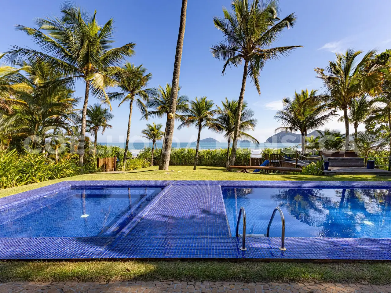 • Home Theater e sala de estar com vista para o jardim e praia