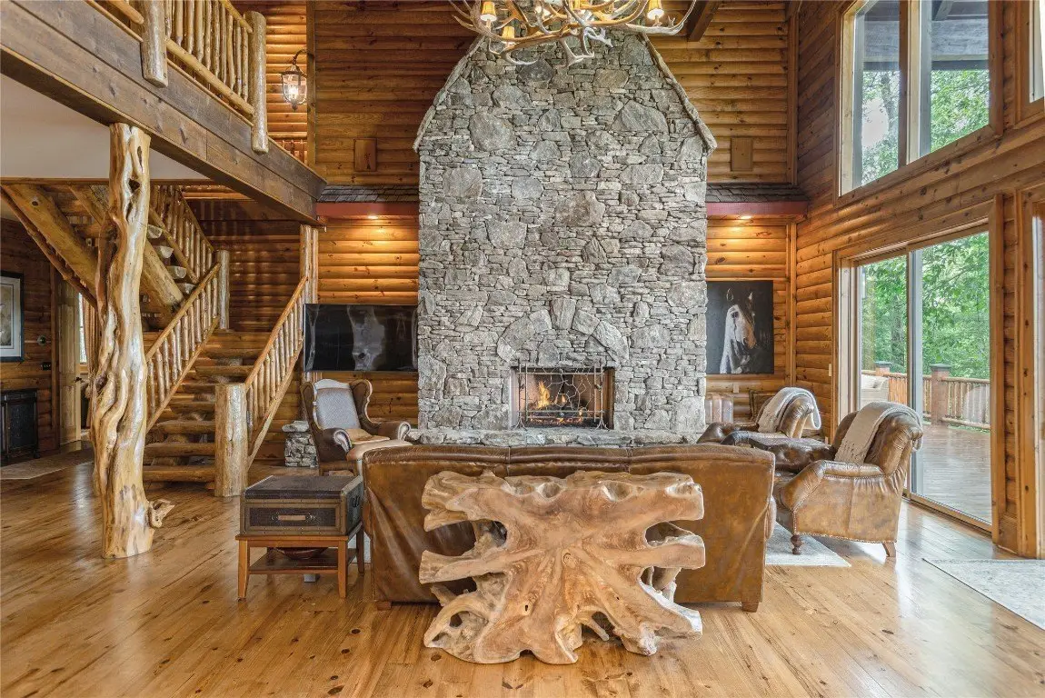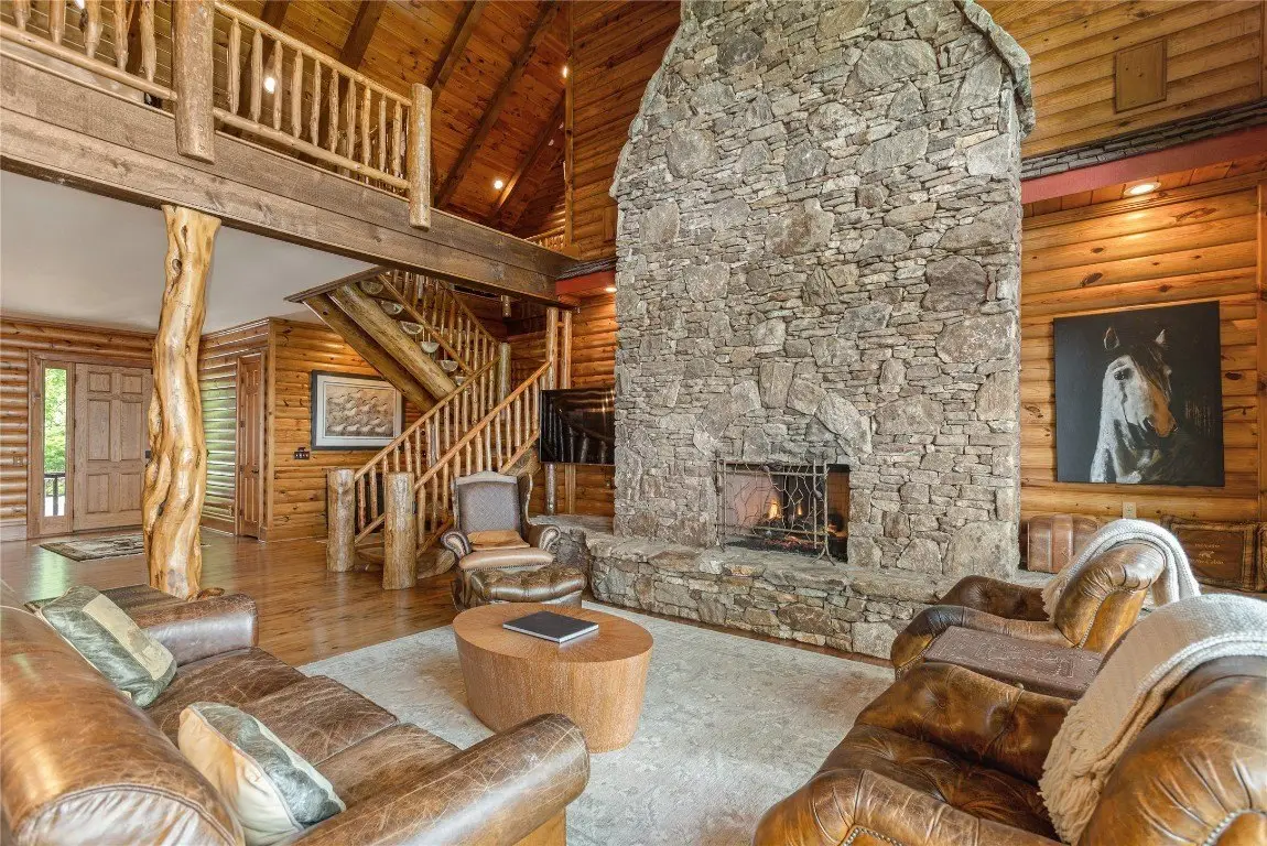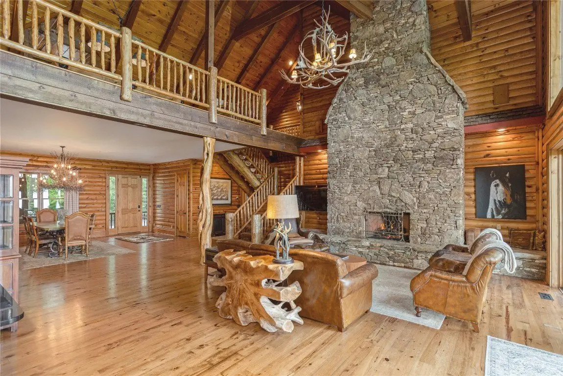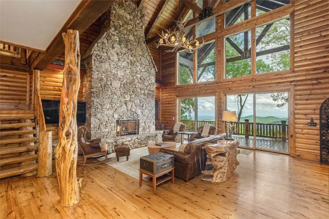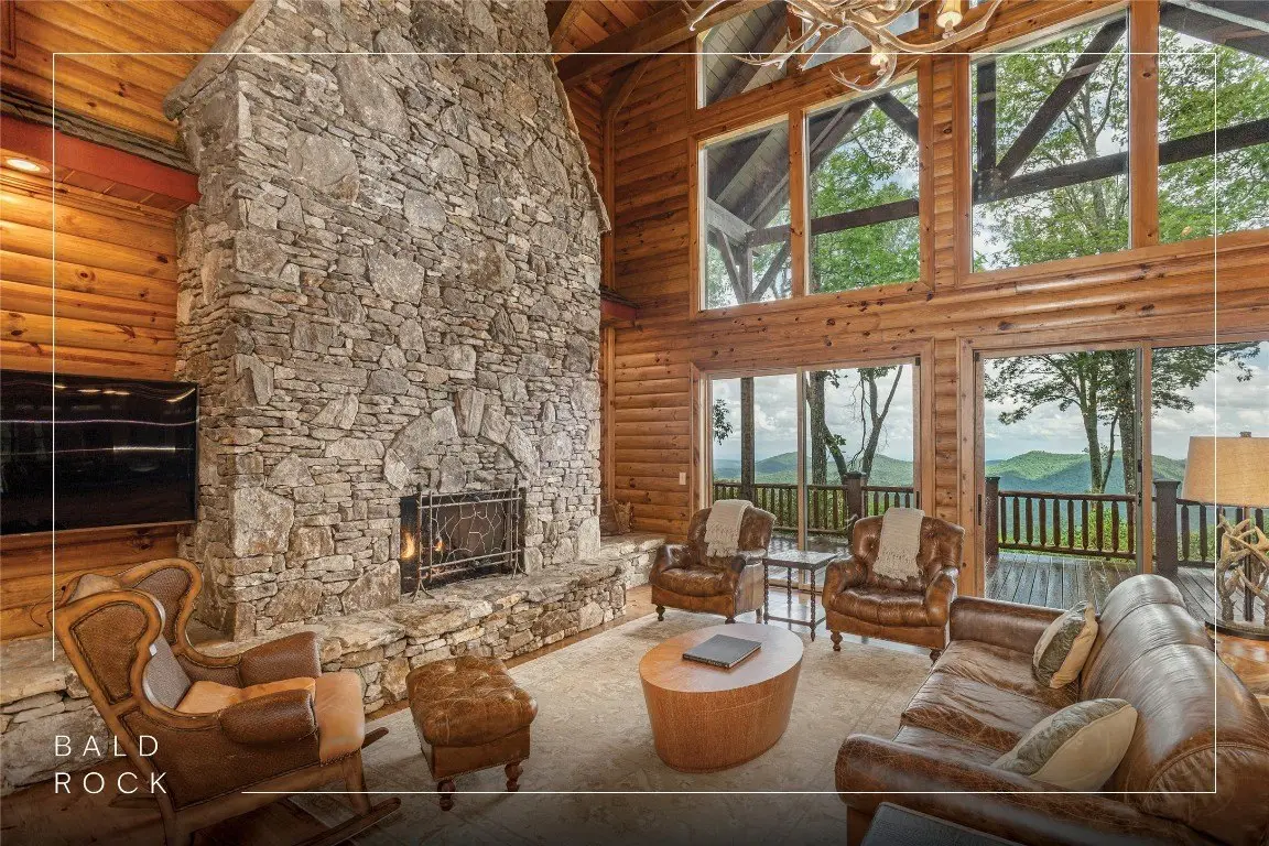 Perched high above the valley floor in the coveted gated community of Bald Rock, this authentic log home is a true mountain sanctuary. Set on 3.79 gently sloping acres, the property offers a rare combination of panoramic long-range views and usable land—ideal for exploring with family, friends, and pets. A private trail winds through the trees and past dramatic rock outcroppings, leading to a peaceful fire pit tucked just behind the home, inviting moments of connection under the open sky. As you step into the soaring great room, you're greeted by 28 foot ceilings, a striking stone fireplace, and breathtaking views that stretch to the horizon. The warmth of natural wood, the crackle of a fire, and the ever changing mountain backdrop create an atmosphere that is both grand and grounded. The kitchen, complete with a covered grilling porch and casual dining area, opens to an expansive deck that frames the landscape beyond. An adjacent formal dining room, designed to accommodate large gatherings, offers space to host with ease. Nearby, a well-appointed pantry, bar, and laundry room add to the home's thoughtful functionality. The main level primary suite is spacious and inviting, featuring its own stone fireplace, a generous walk-in closet, and a luxurious bath with dual stone vessel sinks. An adjoining study provides a quiet retreat for reading, work, or reflection. A handcrafted log staircase leads to the upper level, where an open loft with a carved full size pool table overlooks the great room and mountain vistas. Two guest bedrooms with private baths, along with a versatile bonus room, offer ample accommodations. One of the upstairs bedrooms is particularly expansive and features a bathroom with its own stone fireplace—perfect for those crisp Plateau mornings. A two car garage with an integrated workshop completes the offering. Rich in mountain character and set on a property that celebrates both natural beauty and practical livability, this home stands apart with its rare blend of charm, comfort, and commanding views. Bald Rock is one of the Plateau’s premier gated communities, offering privacy, security, and access to a range of amenities including an equestrian center, hiking trails, and direct access to Panthertown Valley. Residents enjoy the natural beauty, cooler climate, and a true sense of mountain living.
