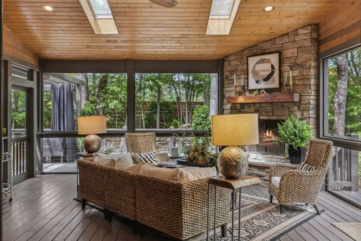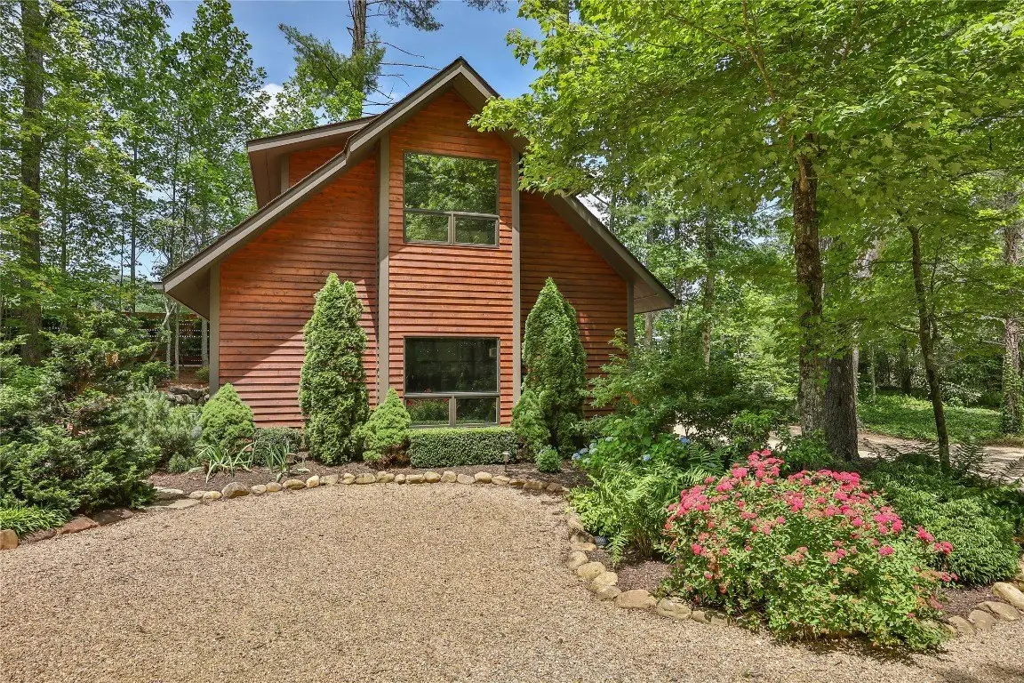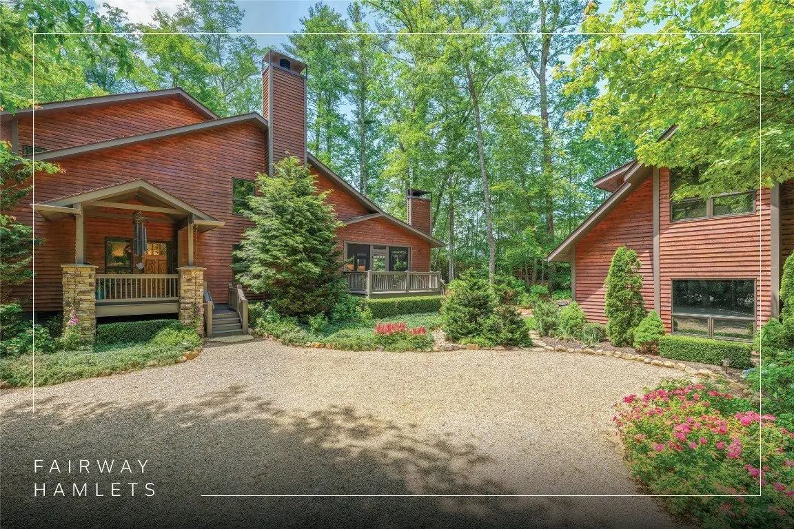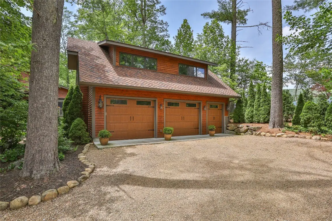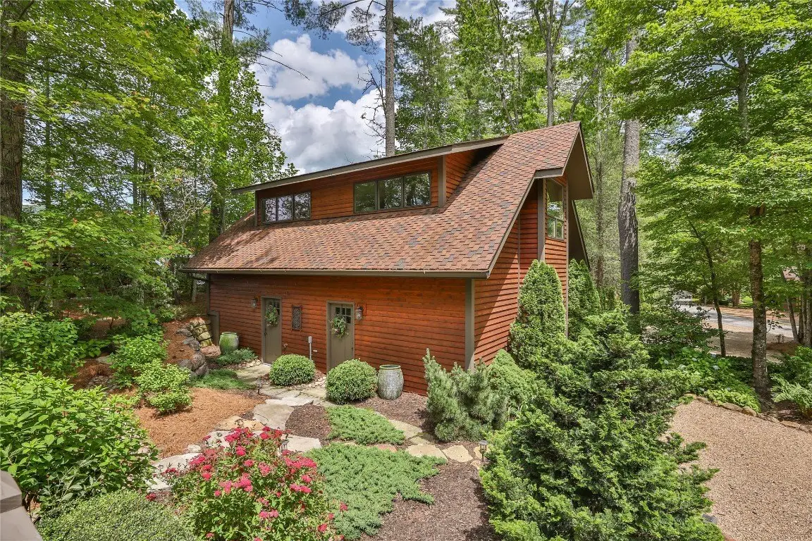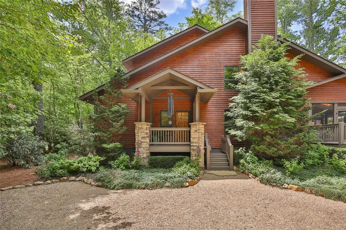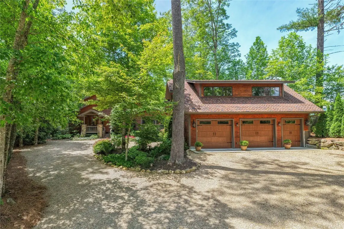 Located in the desirable heart of Sapphire Valley, this exceptional mountain retreat offers an ideal blend of comfort, elegance, and privacy. Set on a beautifully landscaped lot, the property features a level driveway with generous parking, stone walkways, ambient exterior lighting, a tranquil water feature, and privacy fencing. Inside the main residence, soaring vaulted ceilings and rich hardwood floors create an open and inviting ambiance. The great room is anchored by a striking stone fireplace with gas logs, while the adjacent chef’s kitchen is equipped with KitchenAid stainless steel appliances, custom cabinetry, and a charming herb garden window. The open-concept layout flows into the dining area and out to a screened Carolina room with skylights and a wood-burning fireplace—perfect for enjoying the seasons in comfort. The home offers two spacious primary suites, one on each level, each featuring spa-inspired bathrooms with dual vanities, jetted soaking tubs, and separate showers. A detached two-car garage with an additional golf cart bay includes a thoughtfully designed upstairs guest apartment, complete with a small kitchen, living area, bedroom, and full bath—ideal for visitors or a private home office. A 22kW generator ensures peace of mind year-round. Tucked away on a quiet lane with golf cart access to the nearby Country Club of Sapphire Valley (membership by invitation only), this refined property captures the essence of mountain living with unmatched access to the area’s best amenities.