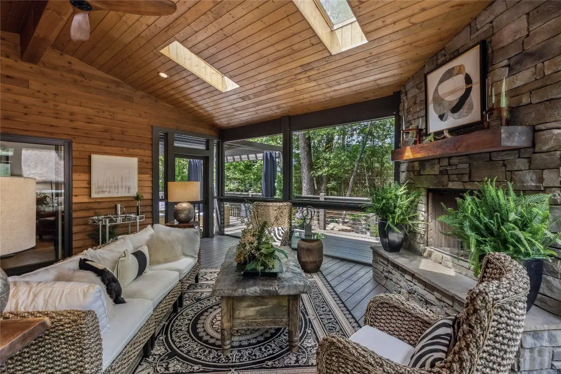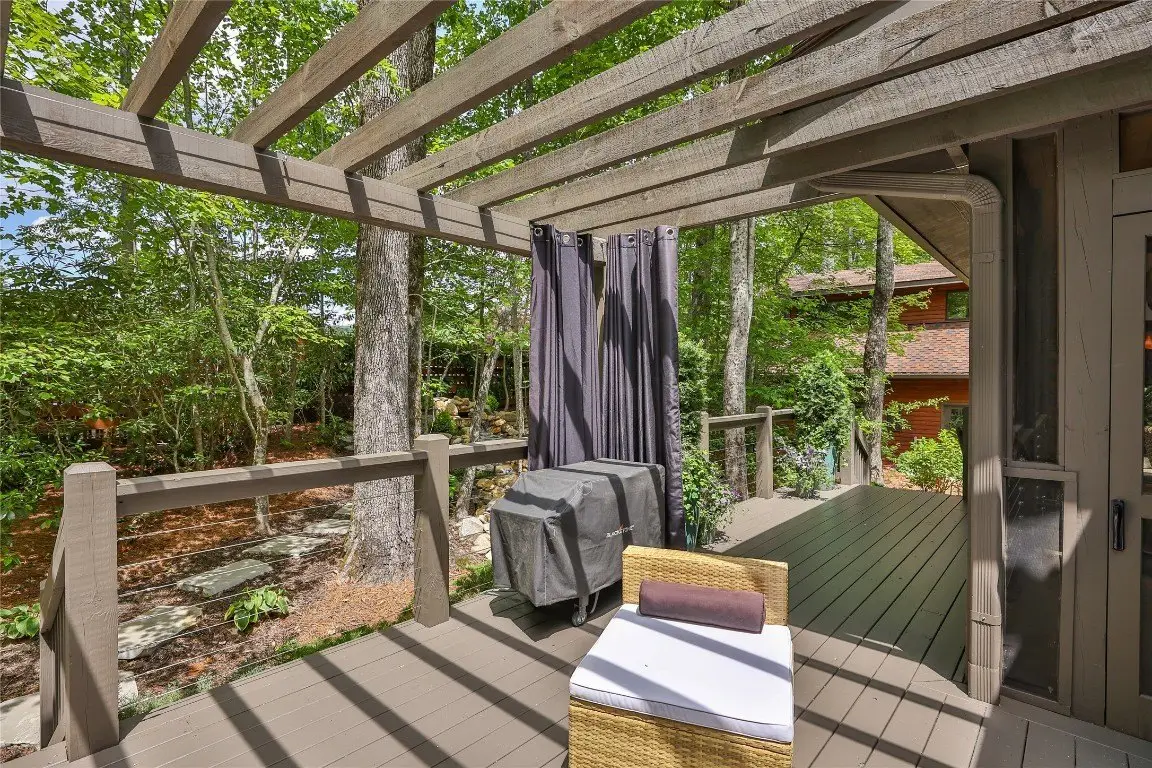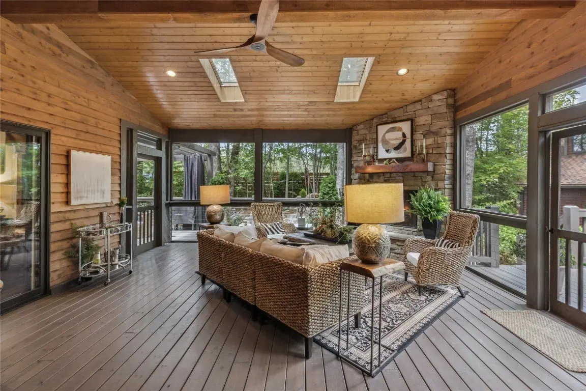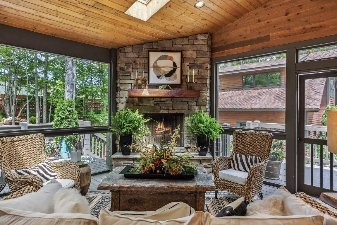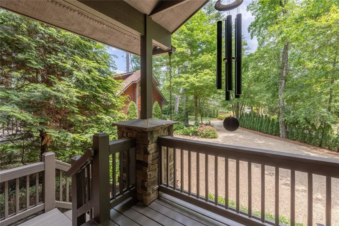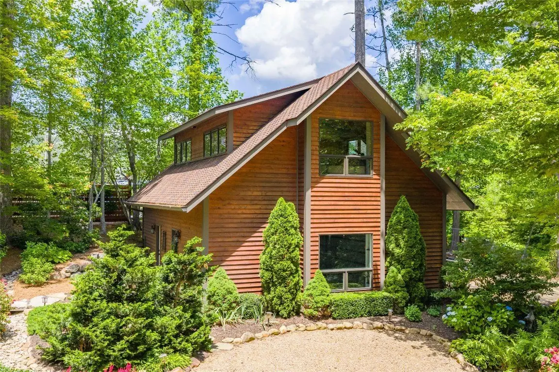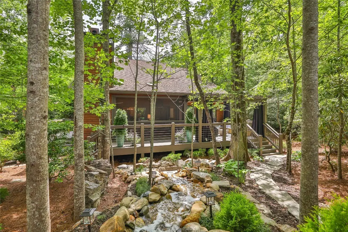 Located in the desirable heart of Sapphire Valley, this exceptional mountain retreat offers an ideal blend of comfort, elegance, and privacy. Set on a beautifully landscaped lot, the property features a level driveway with generous parking, stone walkways, ambient exterior lighting, a tranquil water feature, and privacy fencing. Inside the main residence, soaring vaulted ceilings and rich hardwood floors create an open and inviting ambiance. The great room is anchored by a striking stone fireplace with gas logs, while the adjacent chef’s kitchen is equipped with KitchenAid stainless steel appliances, custom cabinetry, and a charming herb garden window. The open-concept layout flows into the dining area and out to a screened Carolina room with skylights and a wood-burning fireplace—perfect for enjoying the seasons in comfort. The home offers two spacious primary suites, one on each level, each featuring spa-inspired bathrooms with dual vanities, jetted soaking tubs, and separate showers. A detached two-car garage with an additional golf cart bay includes a thoughtfully designed upstairs guest apartment, complete with a small kitchen, living area, bedroom, and full bath—ideal for visitors or a private home office. A 22kW generator ensures peace of mind year-round. Tucked away on a quiet lane with golf cart access to the nearby Country Club of Sapphire Valley (membership by invitation only), this refined property captures the essence of mountain living with unmatched access to the area’s best amenities.