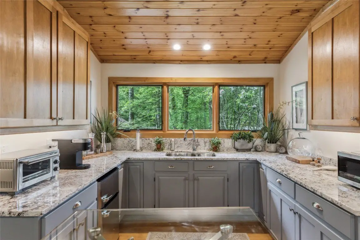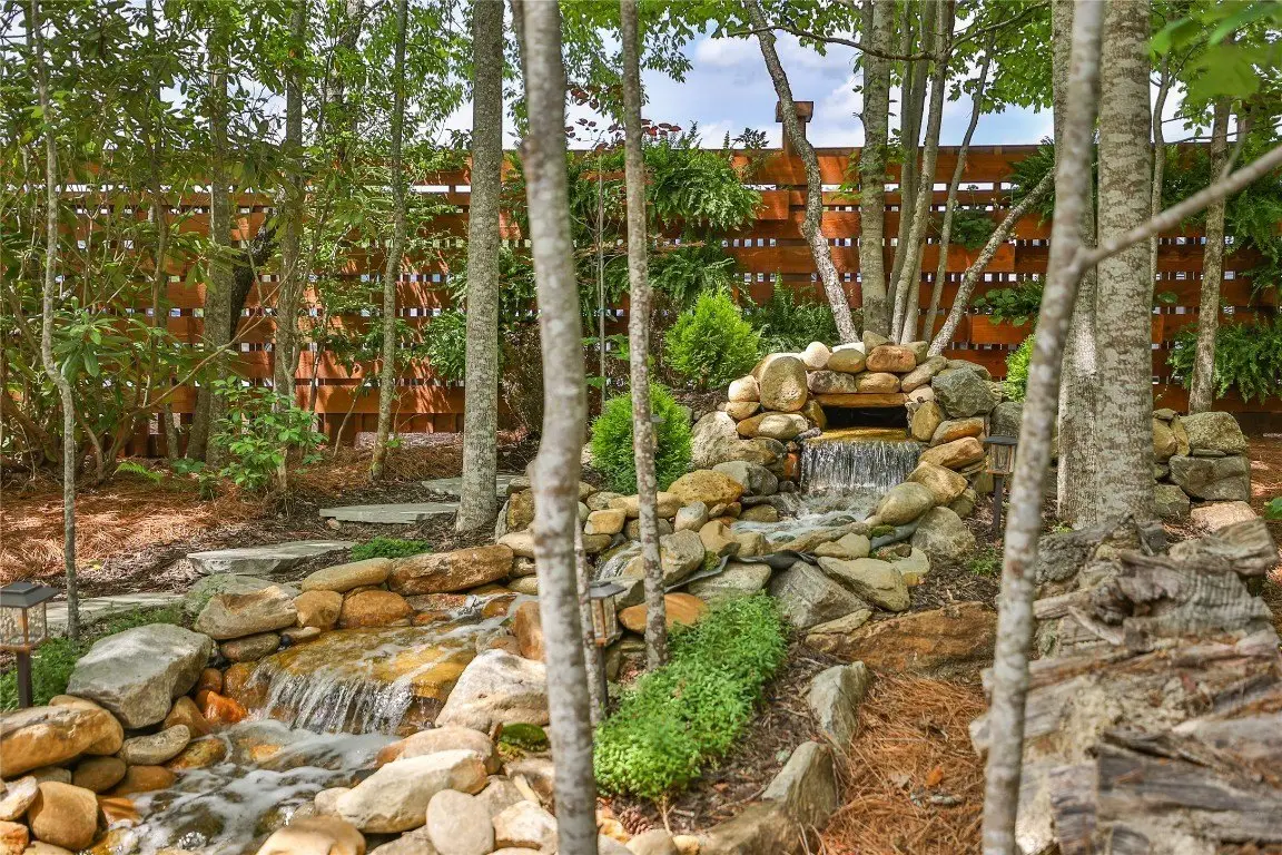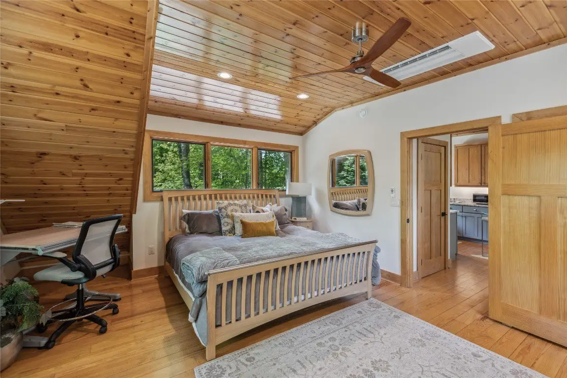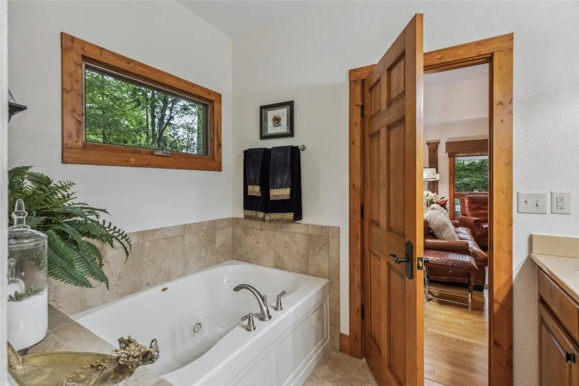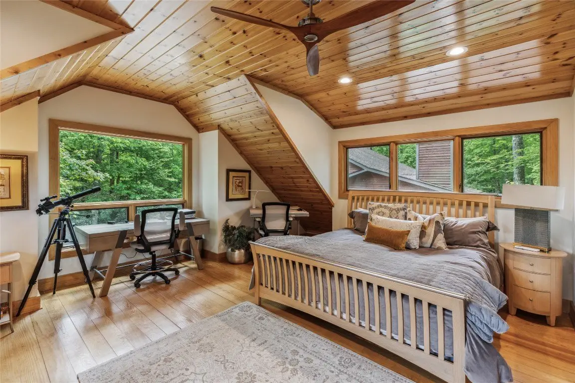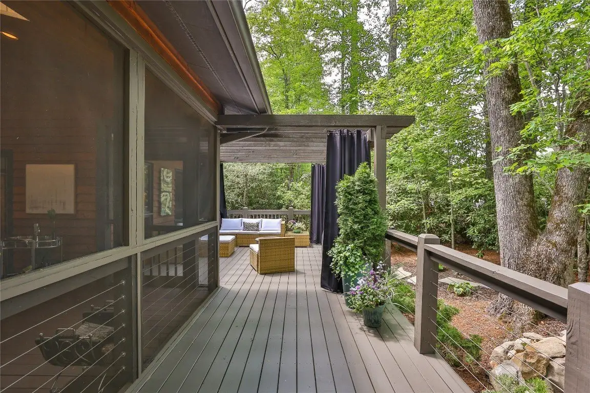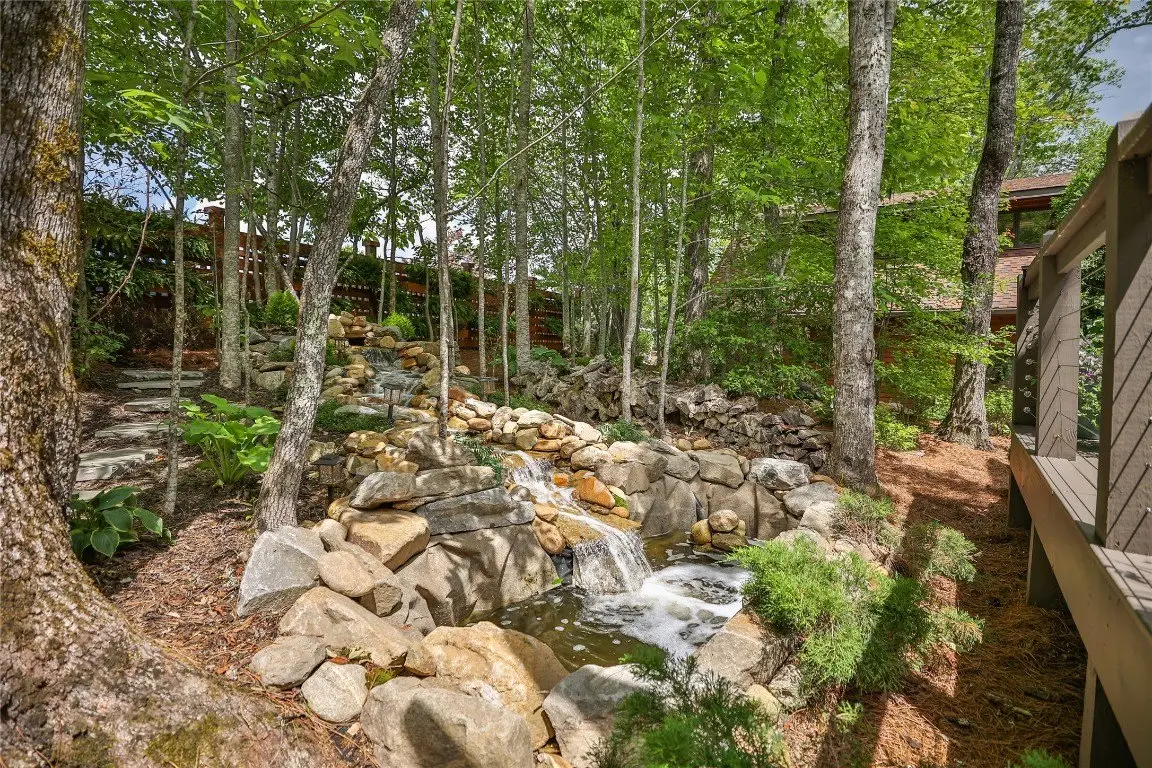 Located in the desirable heart of Sapphire Valley, this exceptional mountain retreat offers an ideal blend of comfort, elegance, and privacy. Set on a beautifully landscaped lot, the property features a level driveway with generous parking, stone walkways, ambient exterior lighting, a tranquil water feature, and privacy fencing. Inside the main residence, soaring vaulted ceilings and rich hardwood floors create an open and inviting ambiance. The great room is anchored by a striking stone fireplace with gas logs, while the adjacent chef’s kitchen is equipped with KitchenAid stainless steel appliances, custom cabinetry, and a charming herb garden window. The open-concept layout flows into the dining area and out to a screened Carolina room with skylights and a wood-burning fireplace—perfect for enjoying the seasons in comfort. The home offers two spacious primary suites, one on each level, each featuring spa-inspired bathrooms with dual vanities, jetted soaking tubs, and separate showers. A detached two-car garage with an additional golf cart bay includes a thoughtfully designed upstairs guest apartment, complete with a small kitchen, living area, bedroom, and full bath—ideal for visitors or a private home office. A 22kW generator ensures peace of mind year-round. Tucked away on a quiet lane with golf cart access to the nearby Country Club of Sapphire Valley (membership by invitation only), this refined property captures the essence of mountain living with unmatched access to the area’s best amenities.