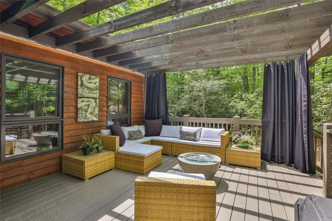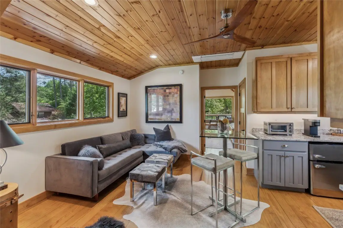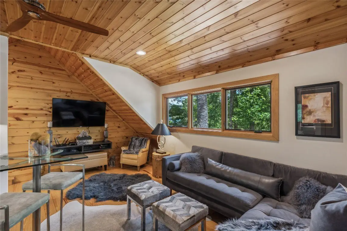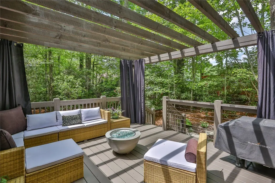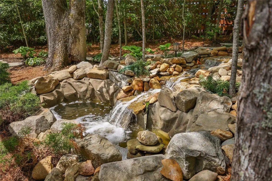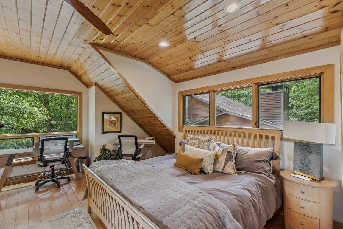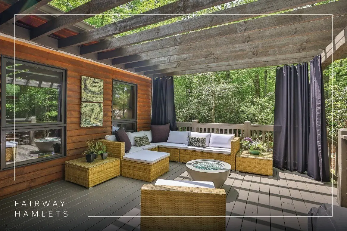 Located in the desirable heart of Sapphire Valley, this exceptional mountain retreat offers an ideal blend of comfort, elegance, and privacy. Set on a beautifully landscaped lot, the property features a level driveway with generous parking, stone walkways, ambient exterior lighting, a tranquil water feature, and privacy fencing. Inside the main residence, soaring vaulted ceilings and rich hardwood floors create an open and inviting ambiance. The great room is anchored by a striking stone fireplace with gas logs, while the adjacent chef’s kitchen is equipped with KitchenAid stainless steel appliances, custom cabinetry, and a charming herb garden window. The open-concept layout flows into the dining area and out to a screened Carolina room with skylights and a wood-burning fireplace—perfect for enjoying the seasons in comfort. The home offers two spacious primary suites, one on each level, each featuring spa-inspired bathrooms with dual vanities, jetted soaking tubs, and separate showers. A detached two-car garage with an additional golf cart bay includes a thoughtfully designed upstairs guest apartment, complete with a small kitchen, living area, bedroom, and full bath—ideal for visitors or a private home office. A 22kW generator ensures peace of mind year-round. Tucked away on a quiet lane with golf cart access to the nearby Country Club of Sapphire Valley (membership by invitation only), this refined property captures the essence of mountain living with unmatched access to the area’s best amenities.