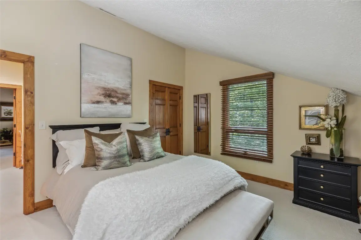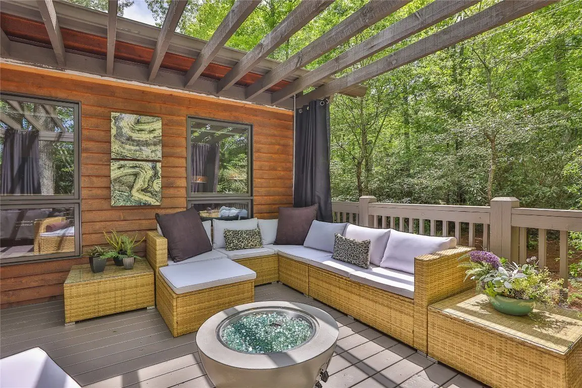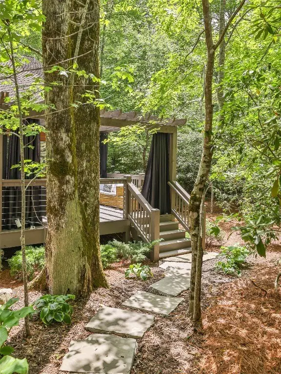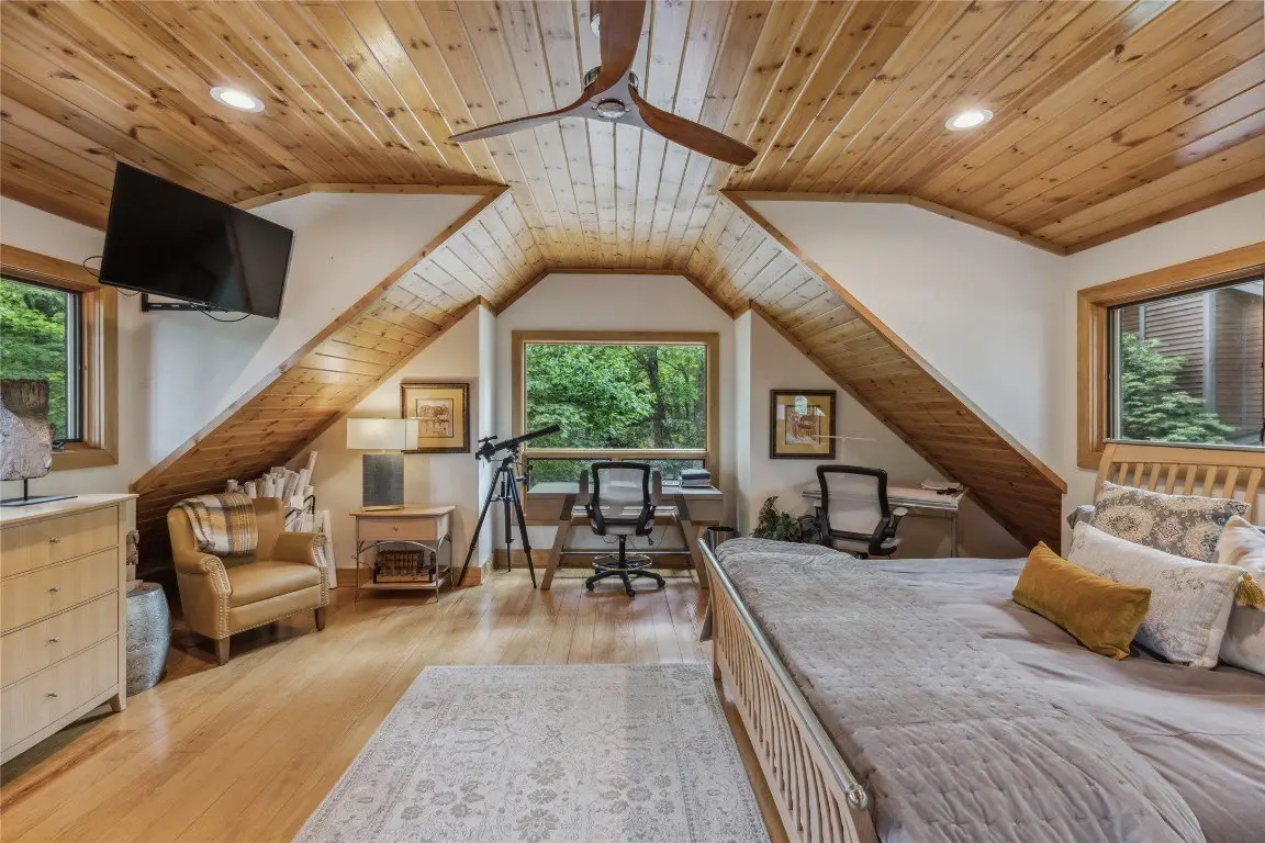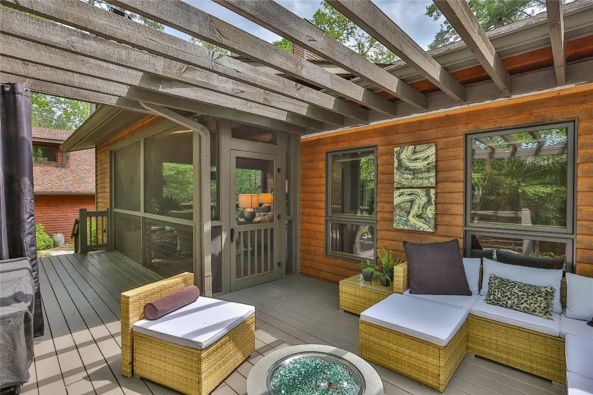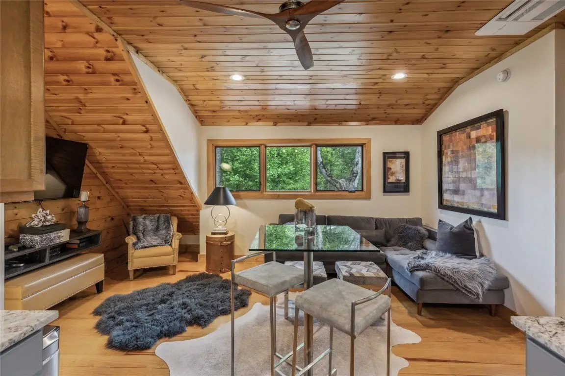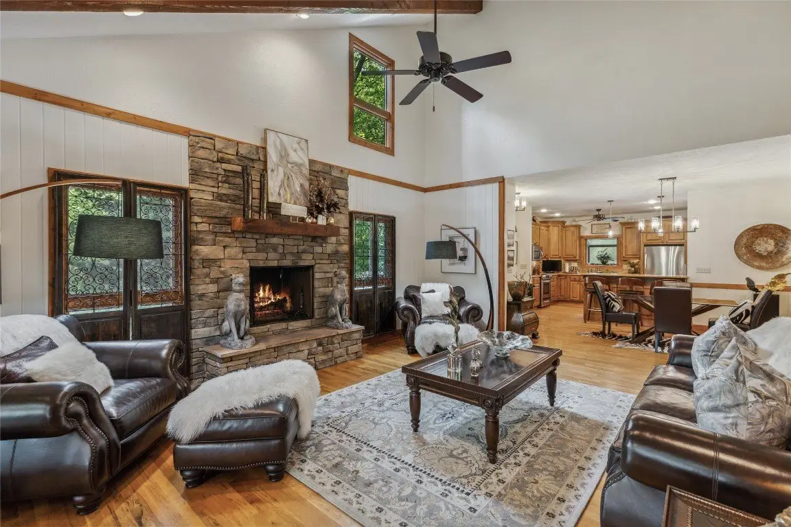 Located in the desirable heart of Sapphire Valley, this exceptional mountain retreat offers an ideal blend of comfort, elegance, and privacy. Set on a beautifully landscaped lot, the property features a level driveway with generous parking, stone walkways, ambient exterior lighting, a tranquil water feature, and privacy fencing. Inside the main residence, soaring vaulted ceilings and rich hardwood floors create an open and inviting ambiance. The great room is anchored by a striking stone fireplace with gas logs, while the adjacent chef’s kitchen is equipped with KitchenAid stainless steel appliances, custom cabinetry, and a charming herb garden window. The open-concept layout flows into the dining area and out to a screened Carolina room with skylights and a wood-burning fireplace—perfect for enjoying the seasons in comfort. The home offers two spacious primary suites, one on each level, each featuring spa-inspired bathrooms with dual vanities, jetted soaking tubs, and separate showers. A detached two-car garage with an additional golf cart bay includes a thoughtfully designed upstairs guest apartment, complete with a small kitchen, living area, bedroom, and full bath—ideal for visitors or a private home office. A 22kW generator ensures peace of mind year-round. Tucked away on a quiet lane with golf cart access to the nearby Country Club of Sapphire Valley (membership by invitation only), this refined property captures the essence of mountain living with unmatched access to the area’s best amenities.