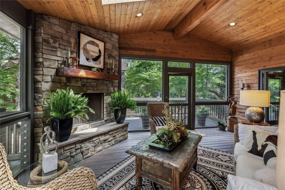 Screened Carolina room with wood-burning fireplace