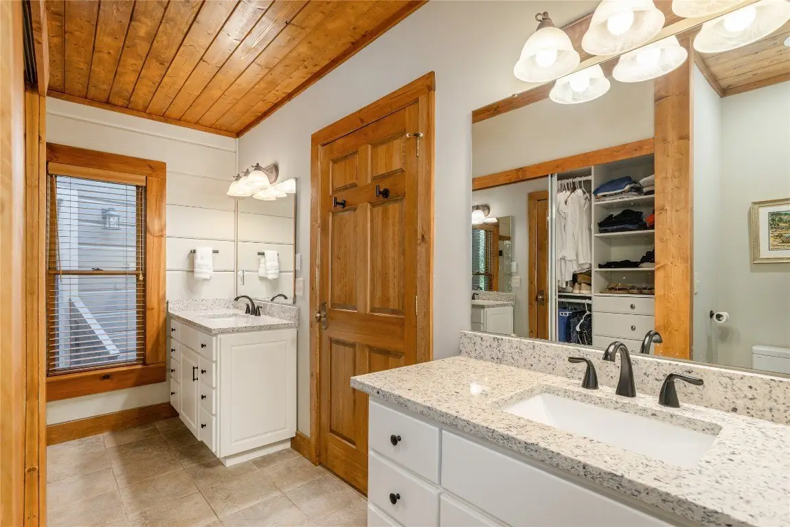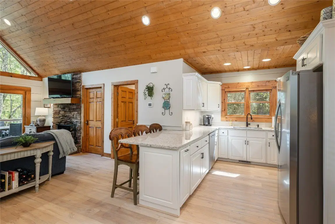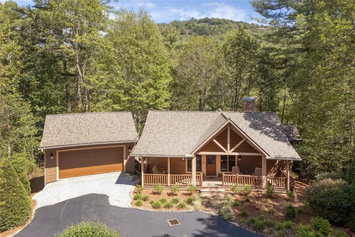 This impeccably maintained and move-in-ready cabin offers four bedrooms and three bathrooms, with one bedroom designed for flexible use as a guest room, office, or play space. Extensively renovated under current ownership, recent 2024–2025 updates include a 24 x 24 two-car garage, new HVAC, and a new roof. Adirondack rocking chairs on the front porch set the tone for this charming mountain retreat, which showcases log siding, a cathedral ceiling, and a stone wood-burning fireplace. The open floor plan creates a comfortable flow between the living and dining areas and the refreshed kitchen, which offers granite countertops, painted cabinetry with updated hardware, under-cabinet lighting, a built-in trash cabinet, electric range, dishwasher, and cookware. Two ensuite bedrooms are located on the main level, thoughtfully positioned on opposite sides of the living room for privacy. The lower level includes a queen ensuite bedroom, a living area, and a versatile flex room with bunk beds that can be used for guests, family, an office, or recreation space. Interior updates feature fresh paint, luxury vinyl plank flooring throughout, and updated bathrooms with granite vanity tops, sinks, faucets, hardware, Toto toilets, and in the primary suite, a custom closet and walk-in shower. The queen bedroom offers a sliding glass window treatment, updated bedding, and a TV, while the lower level provides additional living and entertaining space with direct patio access, a guest suite, a den, laundry, and an owner’s closet. 2024–2025 furnishings are available throughout the home, including recliners and a sofa, a dining table with a leaf and chairs, accent tables, and rugs in natural tones that complement the mountain setting. Additional upgrades include a whole-house dehumidifier, gutters, full exterior repaint, exterior lighting, asphalt driveway, and thoughtful landscaping with trimmed landscaping that enhances mountain views. Outdoor living areas include a rescreened porch, an open deck for grilling, a covered patio, and a level backyard. The property is conveniently located near Sapphire Valley Master Resort amenities, Lake Fairfield, dining options in both Sapphire and Cashiers, and is just an hour drive from Asheville airport. With extensive recent renovations, low-maintenance features, and flexible living spaces, this property offers an ideal mountain retreat for full-time residence, vacation use, rental income, or investment.