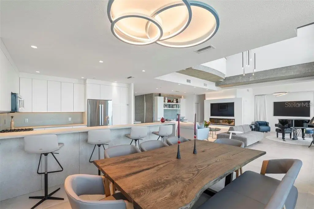 Perched high above Sarasota Bay with breathtaking bay views, this two-story luxury penthouse at Alinari feels like a private sanctuary in the sky where New York loft style meets the beauty and energy of Florida's most cultured coastal city. A perfect winter getaway or full-time home, this architectural masterpiece was completely redesigned and reimagined in 2020-2023 by leading architect Yehuda Inbar and custom builder Yoder Homes and fuses architectural drama with coastal ease. A soaring 20-foot atrium fills the open plan with natural light, framing dazzling and protected water views of the Bay, Bayfront Park and the Van Wezel Performing Arts Hall just across the street. Polished concrete, Caesarstone quartz, and fine Ceramiche D'Arte porcelain floors set a modern tone, softened by custom draperies and curated furnishings that invite lingering afternoons and golden sunsets. The 2500 square-foot, 2/3 bedroom, 3.5 bath floor plan features a chef's kitchen, statement staircase, and loft-style layout which recalls a Manhattan gallery, while the upper-level primary suite offers a serene retreat with spa-like bath. Smart-home features, cutting edge Integrity Sound audio system, Dimplex fireplace, electric shades, and turnkey interiors with premium furnishings from Clive Daniel, Natuzzi, Soft Square and Light Up Your Life complete a space made for effortless sophistication. Open the sliders to your private balcony and and savor gentle bay breezes while taking in the picturesque surroundings. Alinari's resort amenities elevate everyday living with a resort-length pool, heated spa, yoga and fitness studios, saunas, wine cellar, theater, social and billiards lounges, guest suites, 24/7concierge/security, and 2 spaces in the secure garage parking. Available separately, a private poolside cabana one of only ten adds an intimate escape with kitchenette and direct pool access, perfect for entertaining or quiet retreat. Set 16 feet above sea level in a protected X-flood zone and steps from the signature 53-acre Bayfront Park and Sarasota's vibrant dining arts, and cultural offerings, this penthouse embodies cultured coastal living at its most graceful, artful, uplifting, and one of a kind.