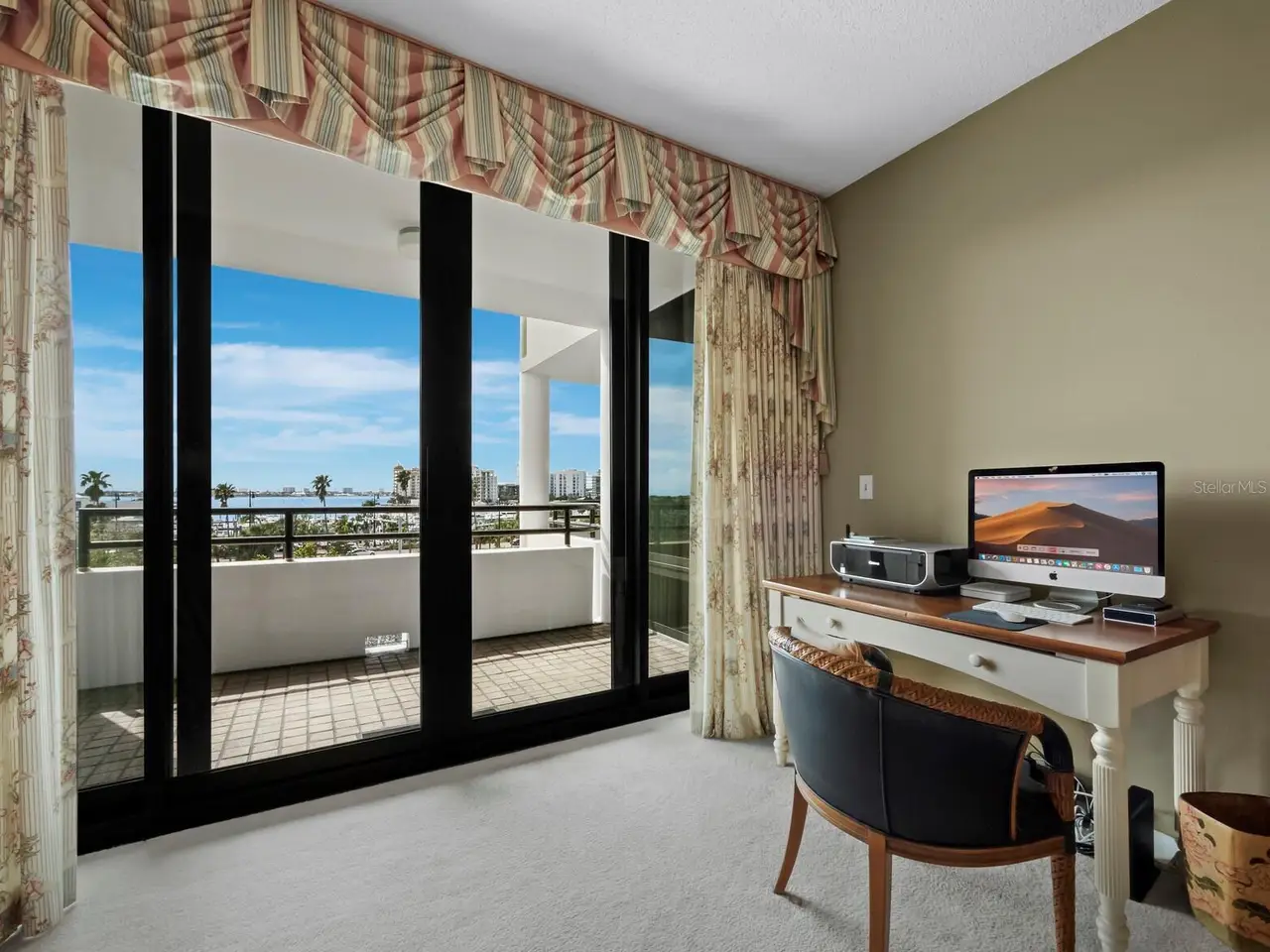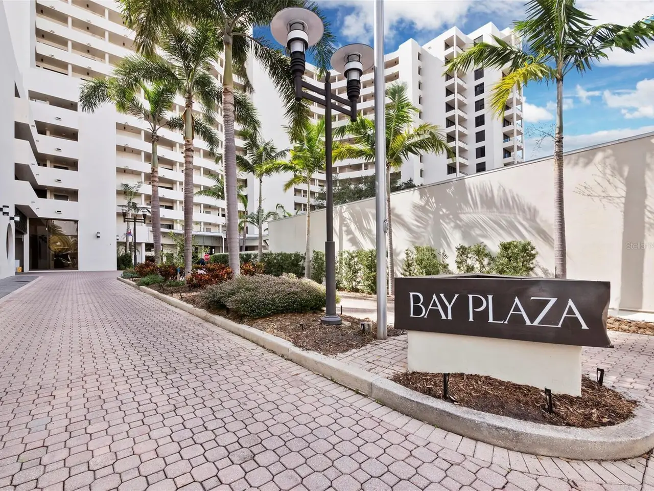 Welcome to Bay Plaza! Conveniently located in the center of downtown with full unparallel water views. This condominium boasts an exceptional living experience with great amenities that include a grand circular motor court with valet service, attendant garage parking, fine concierge service, and much more. Escape and unwind from everyday life in this condo within walking distance to a vibrant culinary, cultural, and art scene. This 4th-floor residence presents a spacious floor plan, with breathtaking western views of the bay and city skyline. Spanning 1,629 square feet, the home features two generously sized bedrooms, two bathrooms, separate dining room, and a private terrace. As you enter, you're welcomed by a large airy living space illuminated by floor-to-ceiling newly hurricane impact-rated sliding doors and windows. The seamless flow continues to an expansive, tiled terrace that provides sweeping views of Sarasota Bay, Marina Jack, the iconic Ringling Bridge, and the sparkling city lights in the distance. It's the perfect setting for entertaining. The extended galley kitchen offers solid counter tops, stainless steel appliances, wood cabinets, extra storage, and space for a desk. The kitchen, with its adjacent dining area, is ideal for hosting family and friends. The generously-sized owner's suite offers direct access to the private terrace, along with a large walk-in closet, dual vanities, a soaking tub, and a walk-in shower. The thoughtfully designed split floor plan also includes a guest room and bath, offering a peaceful retreat for visitors. Bay Plaza offers a lifestyle enhanced by legendary services and amenities including 24-hour valet parking, front desk attendants, on-site property management, and a beautiful lounge and library area. The fully equipped fitness center, complete with a sauna and steam room, provides ultimate relaxation. The heated pool and spa, combined with a community recreation area and covered grilling station, ensure that every day feels like a vacation. Convenience is key at Bay Plaza, with assigned parking, extra storage, bicycle storage, and EV charging stations available for residents. The condominium boasts exceptional walkability, with easy access to the waterfront boardwalk, diverse dining options, and the rich cultural events of downtown Sarasota. This ideal location simply elevates the entire appeal of Bay Plaza waterfront living. It truly stands as both a destination and a place to call home.
