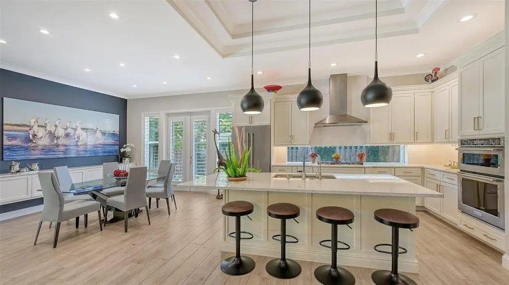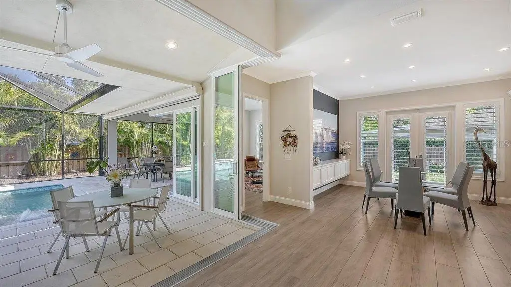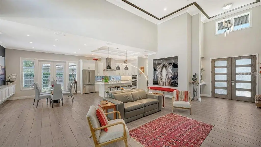 An exceptional single-story Allegra home in Sarasota's coveted West of Trail Flower Streets, perfectly positioned within the Southside School district and just steps from the charming Southside Village restaurants, shops, and Morton's Gourmet Market. This impeccably designed 3-bedroom + office + bonus room, 2.5-bathroom home epitomizes modern coastal living and showcases the esteemed Kristi Ann single story floor plan, offering a seamless blend of sophisticated design and everyday functionality, making it an ideal primary or seasonal residence. From the moment you step through the double doors, you'll be captivated by the open and inviting main living space. The soaring 18-foot ceiling and wall of expansive 10-foot pocketing sliders draw you towards the resort-like outdoor retreat, perfect for relaxing or entertaining. The living room is a true architectural masterpiece, featuring a dramatic floating tray ceiling with Halo-LED lighting and a focal wall complete with a remote-controlled electric fireplace. The chef's kitchen is as functional as it is stylish, equipped with stainless steel appliances, a 5-burner gas range, Quartz island and countertops, and a generous walk-in pantry. The dining area, both intimate and elegant, includes a built-in Quartz-topped buffet, creating a serene space for family meals or hosting guests. The primary suite offers a tranquil escape, with vaulted ceiling accented by charming wood beams. The spacious custom walk-in closet ensures ample storage, while the spa-like en-suite bathroom, featuring glass-enclosed shower and designer tile, is the perfect respite after a long day. Two additional large guest bedrooms, along with a well-appointed guest bathroom and powder room, offer comfort and privacy for family or visitors. This award-winning floorplan also boasts a dedicated office, versatile bonus room, laundry room, and a 2-car garage with added storage, meeting the needs of modern living. Step outside and discover an expansive lanai with a resort-style heated pool, spa, and impressive summer kitchen, all surrounded by lush landscaping and illuminated by custom lighting. The disappearing corner sliders seamlessly blend indoor and outdoor spaces, offering the quintessential Sarasota lifestyle. This home is packed with custom features, including designer lighting and built-ins, PGT impact windows, solid-core interior doors, and spray foam insulation for optimal energy efficiency. Recent upgrades include remote-controlled Kevlar shades for additional hurricane protection/storage for outside furnishings/sunshade, new AC unit with UV lights, 2023 mini split AC unit in the garage, and a whole-home in-duct air purifier, ensuring comfort and peace of mind. This impeccably crafted residence captures the essence of Southside Village living, offering a single-level floor plan that balances everyday comfort with refined style. Ideally positioned near Southside School, Sarasota Memorial Hospital, Downtown Sarasota, and Siesta Key Beach, it delivers the ultimate blend of location, luxury, and lifestyle. Built to the latest hurricane codes and outside the flood zone, the home provides peace of mind along with timeless design. Every detail has been thoughtfully curated, creating an exceptional opportunity for discerning buyers to experience the best of Sarasota living in a true single-story gem.