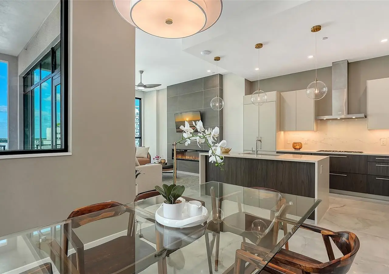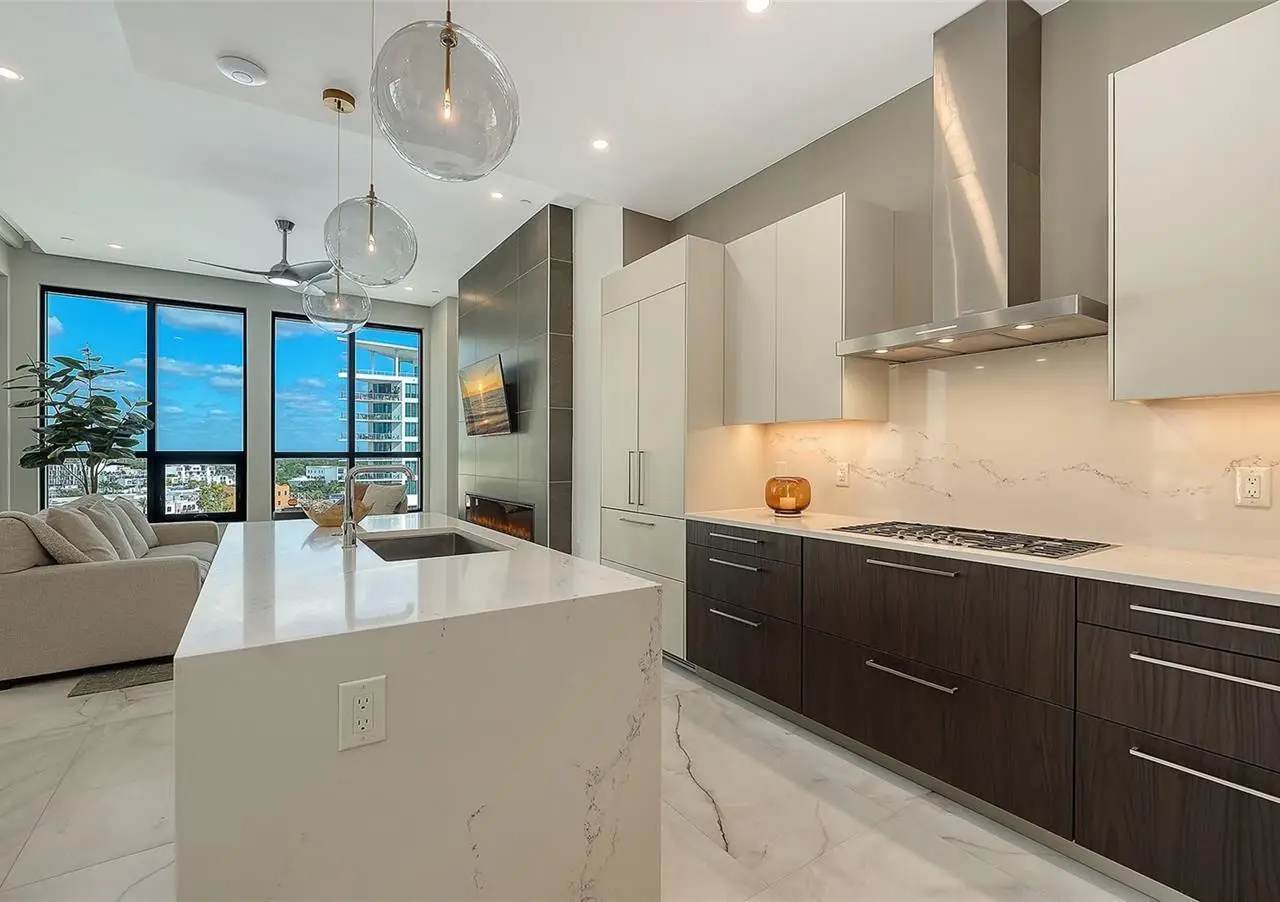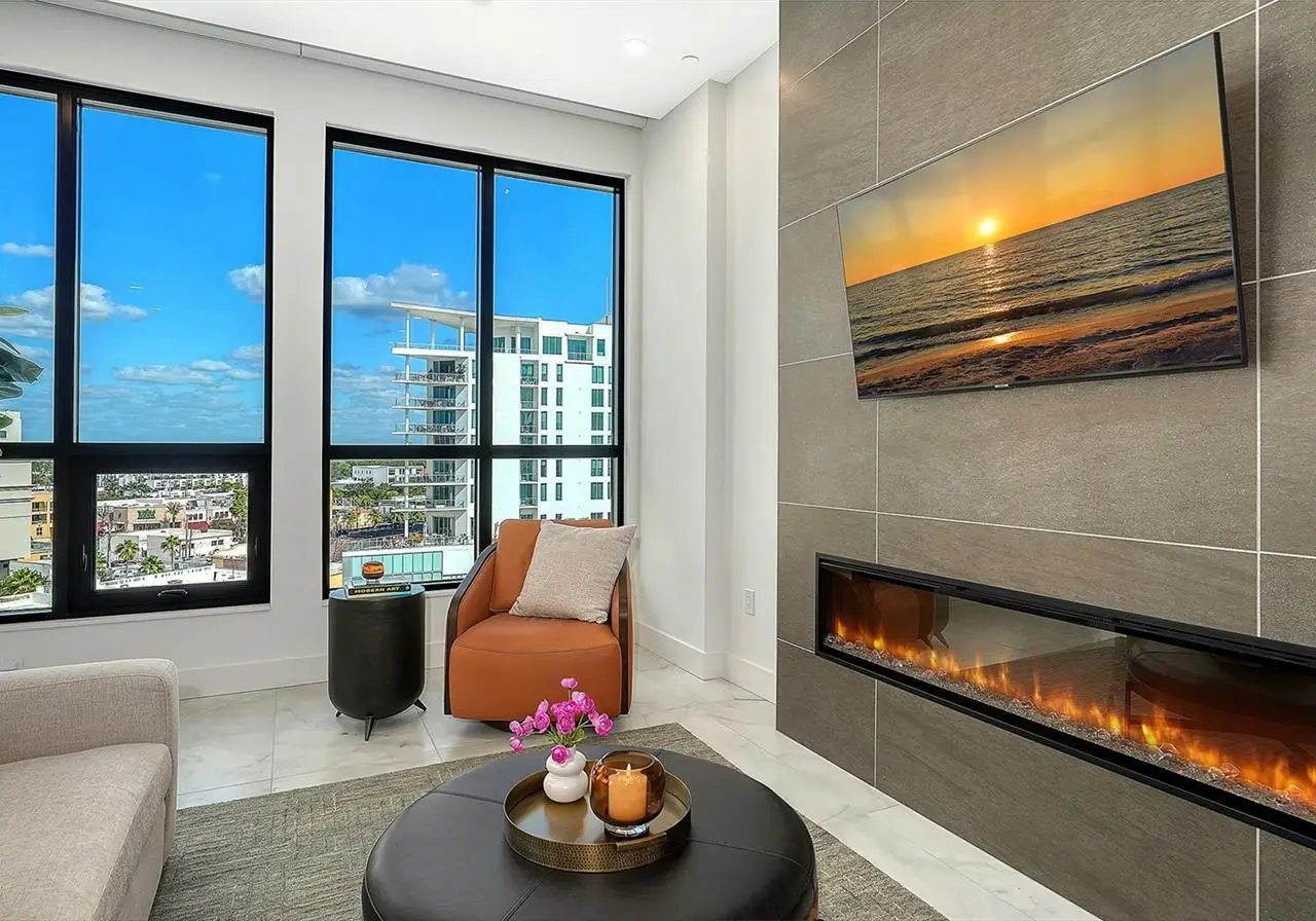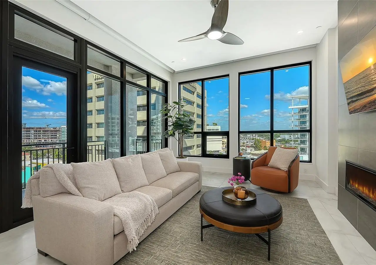 Impeccably maintained and exquisitely appointed, this corner residence embodies modern chic in Sarasota's most sought-after downtown location. Built in 2024 and defining contemporary urban living, this impeccably maintained 2-bedroom, 2-bath, 1,337 sq. ft. home reflects curated luxury. The open floorplan showcases Italian custom cabinetry, Miele appliances with a gas cooktop, and upgraded quartz countertops with a full backsplash and waterfall island. Sleek porcelain tile flooring flows throughout, while custom lighting, designer paint, and a striking fireplace with feature wall create an ambiance of understated glamour. Both bedrooms offer custom-built closets, with a Murphy bed in the second for versatile use. Automated electric blinds and custom drapery pockets enhance the clean, contemporary aesthetic. Home is complete with a temperature-controlled storage locker and a terrace that is wired for an electric barbecue. Residents of this exclusive boutique building enjoy 24-hour staffed service and access to a spectacular rooftop amenity level, featuring an elegant club room, fitness center, and saltwater pool - all framed by sweeping views of the city skyline and Sarasota Bay. The result is a tranquil retreat above the vibrant downtown scene, offering the perfect balance of sophistication, comfort, and cosmopolitan energy.