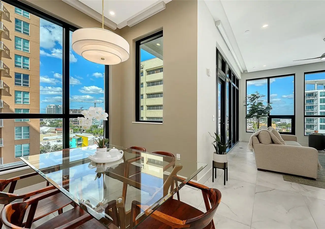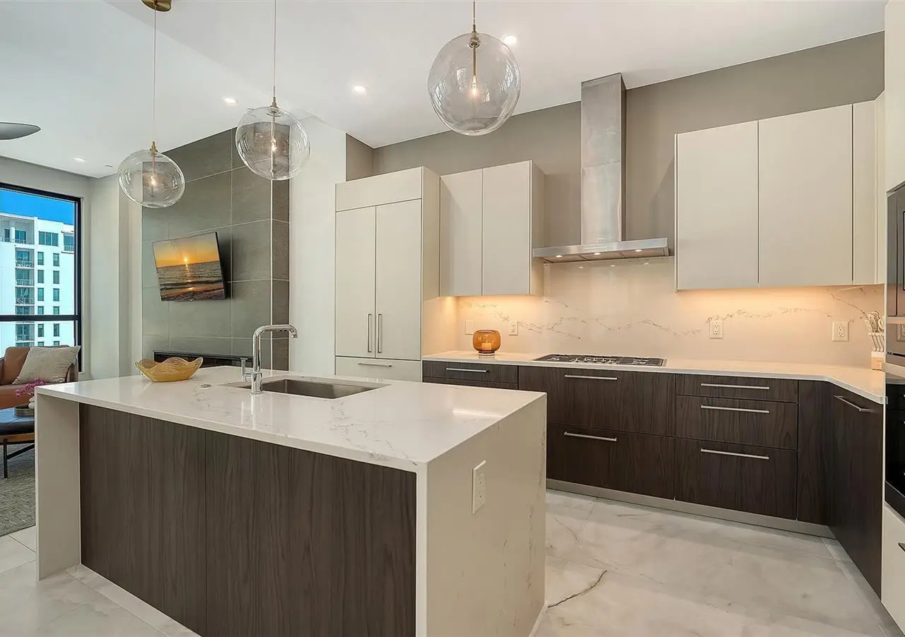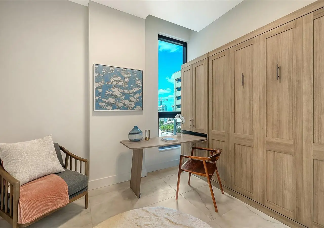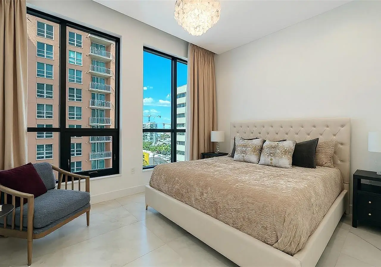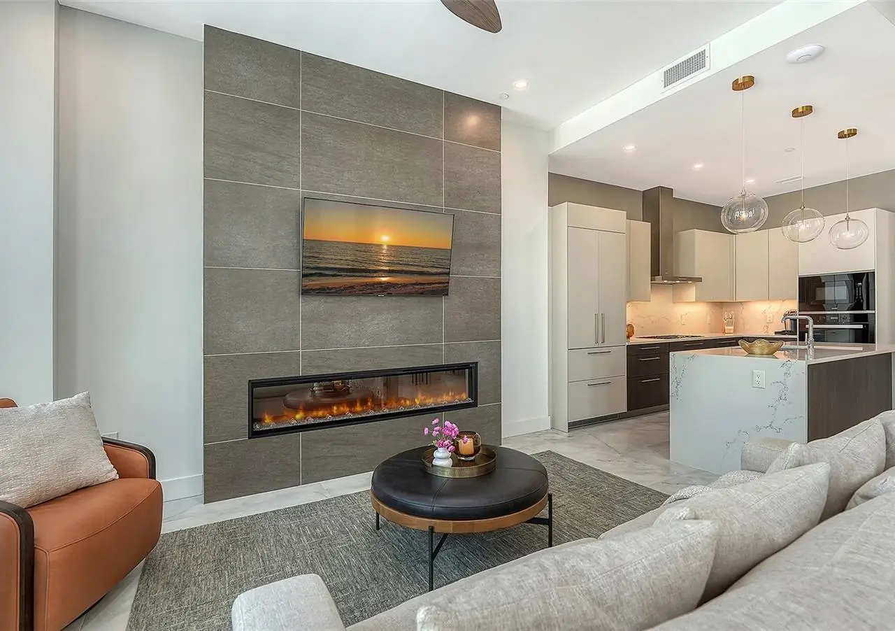 Impeccably maintained and exquisitely appointed, this corner residence embodies modern chic in Sarasota's most sought-after downtown location. Built in 2024 and defining contemporary urban living, this impeccably maintained 2-bedroom, 2-bath, 1,337 sq. ft. home reflects curated luxury. The open floorplan showcases Italian custom cabinetry, Miele appliances with a gas cooktop, and upgraded quartz countertops with a full backsplash and waterfall island. Sleek porcelain tile flooring flows throughout, while custom lighting, designer paint, and a striking fireplace with feature wall create an ambiance of understated glamour. Both bedrooms offer custom-built closets, with a Murphy bed in the second for versatile use. Automated electric blinds and custom drapery pockets enhance the clean, contemporary aesthetic. Home is complete with a temperature-controlled storage locker and a terrace that is wired for an electric barbecue. Residents of this exclusive boutique building enjoy 24-hour staffed service and access to a spectacular rooftop amenity level, featuring an elegant club room, fitness center, and saltwater pool - all framed by sweeping views of the city skyline and Sarasota Bay. The result is a tranquil retreat above the vibrant downtown scene, offering the perfect balance of sophistication, comfort, and cosmopolitan energy.