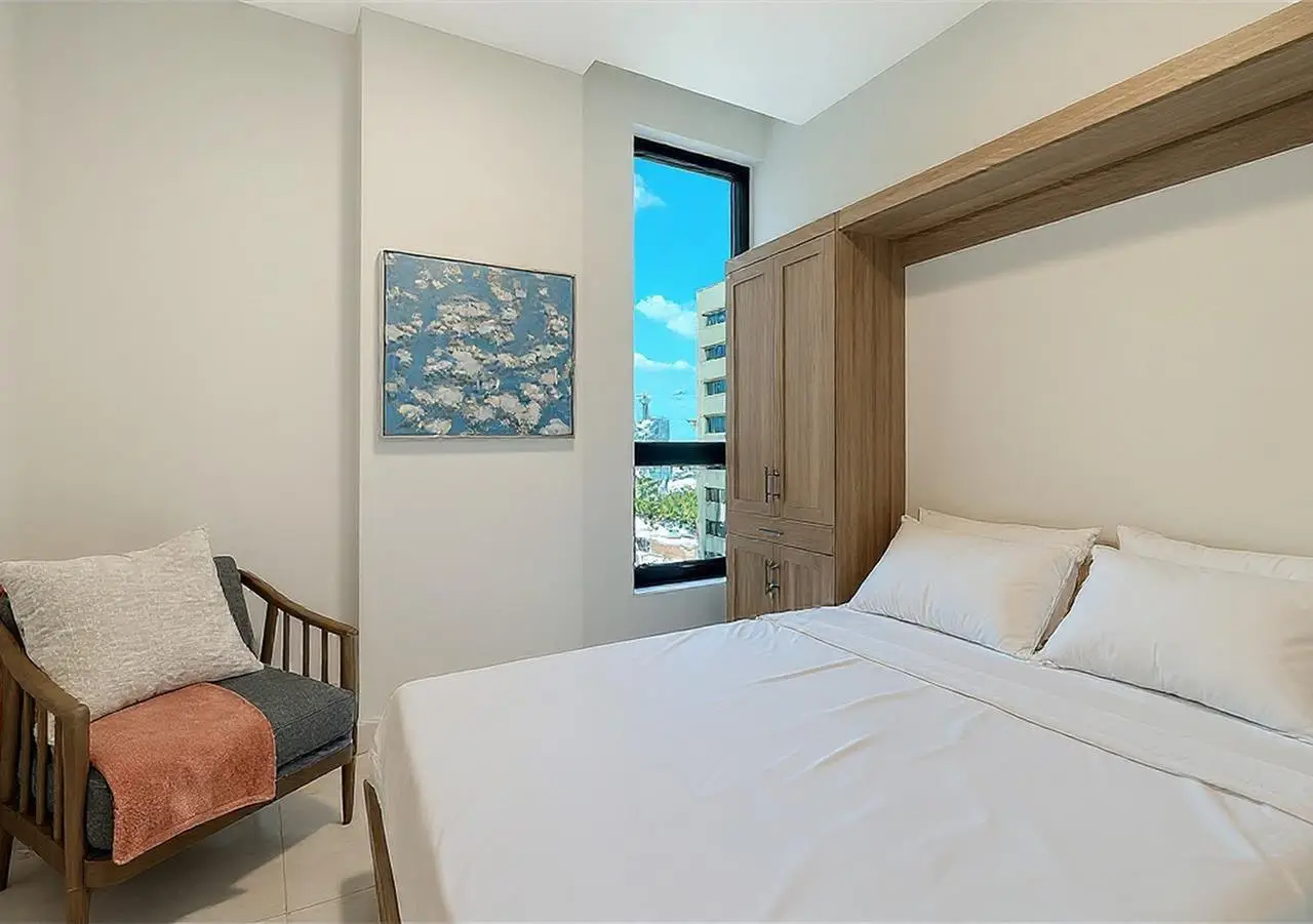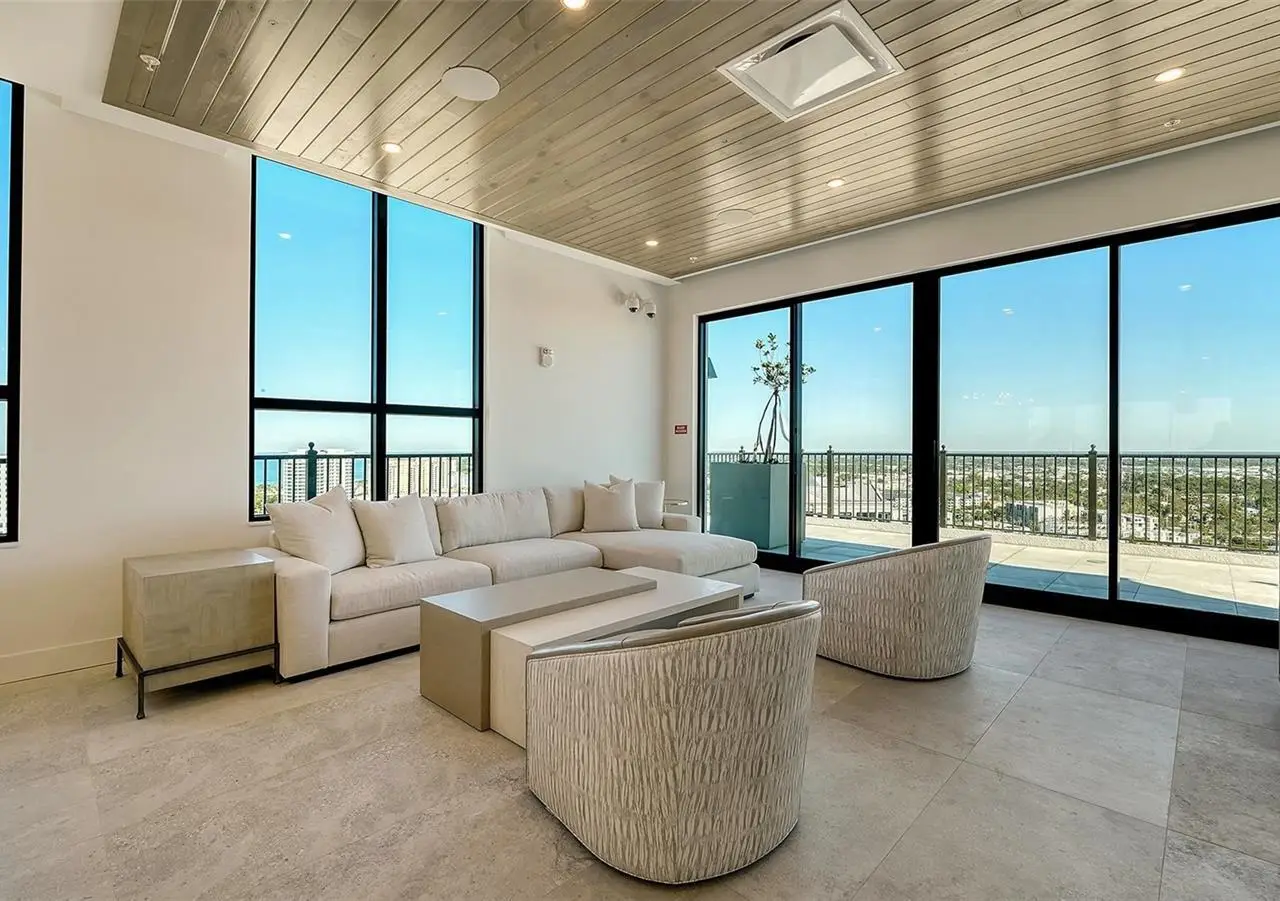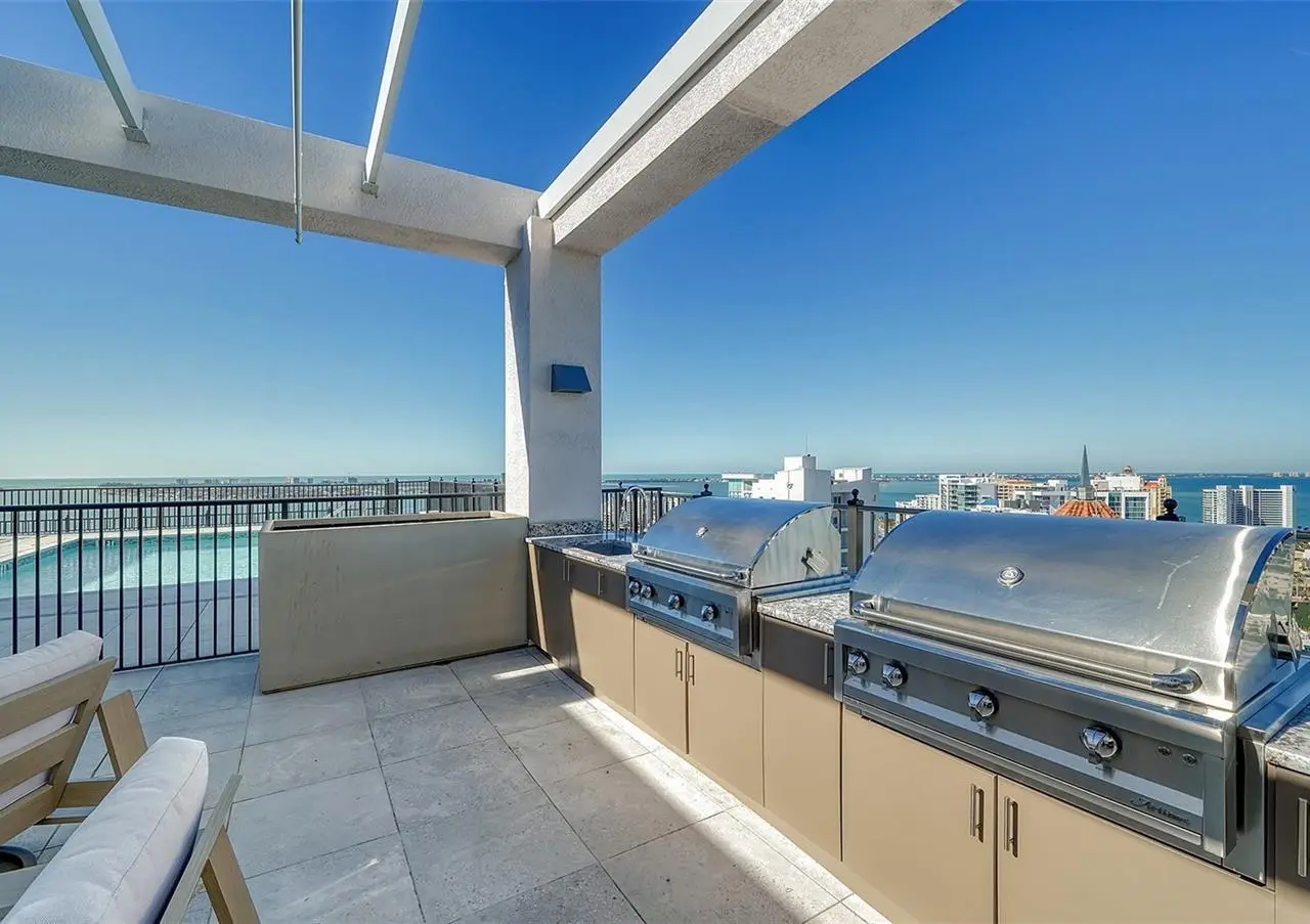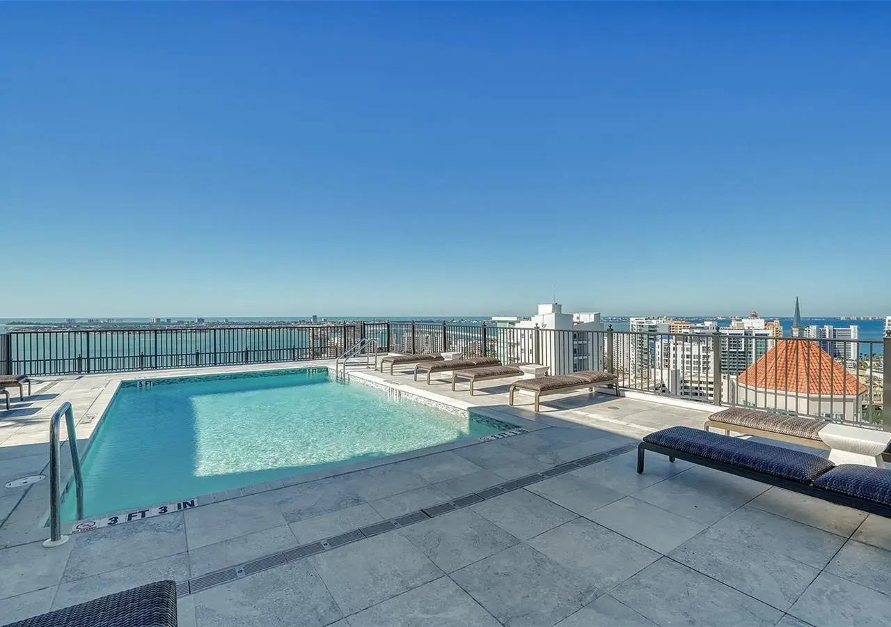 Impeccably maintained and exquisitely appointed, this corner residence embodies modern chic in Sarasota's most sought-after downtown location. Built in 2024 and defining contemporary urban living, this impeccably maintained 2-bedroom, 2-bath, 1,337 sq. ft. home reflects curated luxury. The open floorplan showcases Italian custom cabinetry, Miele appliances with a gas cooktop, and upgraded quartz countertops with a full backsplash and waterfall island. Sleek porcelain tile flooring flows throughout, while custom lighting, designer paint, and a striking fireplace with feature wall create an ambiance of understated glamour. Both bedrooms offer custom-built closets, with a Murphy bed in the second for versatile use. Automated electric blinds and custom drapery pockets enhance the clean, contemporary aesthetic. Home is complete with a temperature-controlled storage locker and a terrace that is wired for an electric barbecue. Residents of this exclusive boutique building enjoy 24-hour staffed service and access to a spectacular rooftop amenity level, featuring an elegant club room, fitness center, and saltwater pool - all framed by sweeping views of the city skyline and Sarasota Bay. The result is a tranquil retreat above the vibrant downtown scene, offering the perfect balance of sophistication, comfort, and cosmopolitan energy.