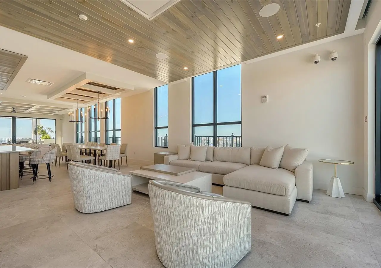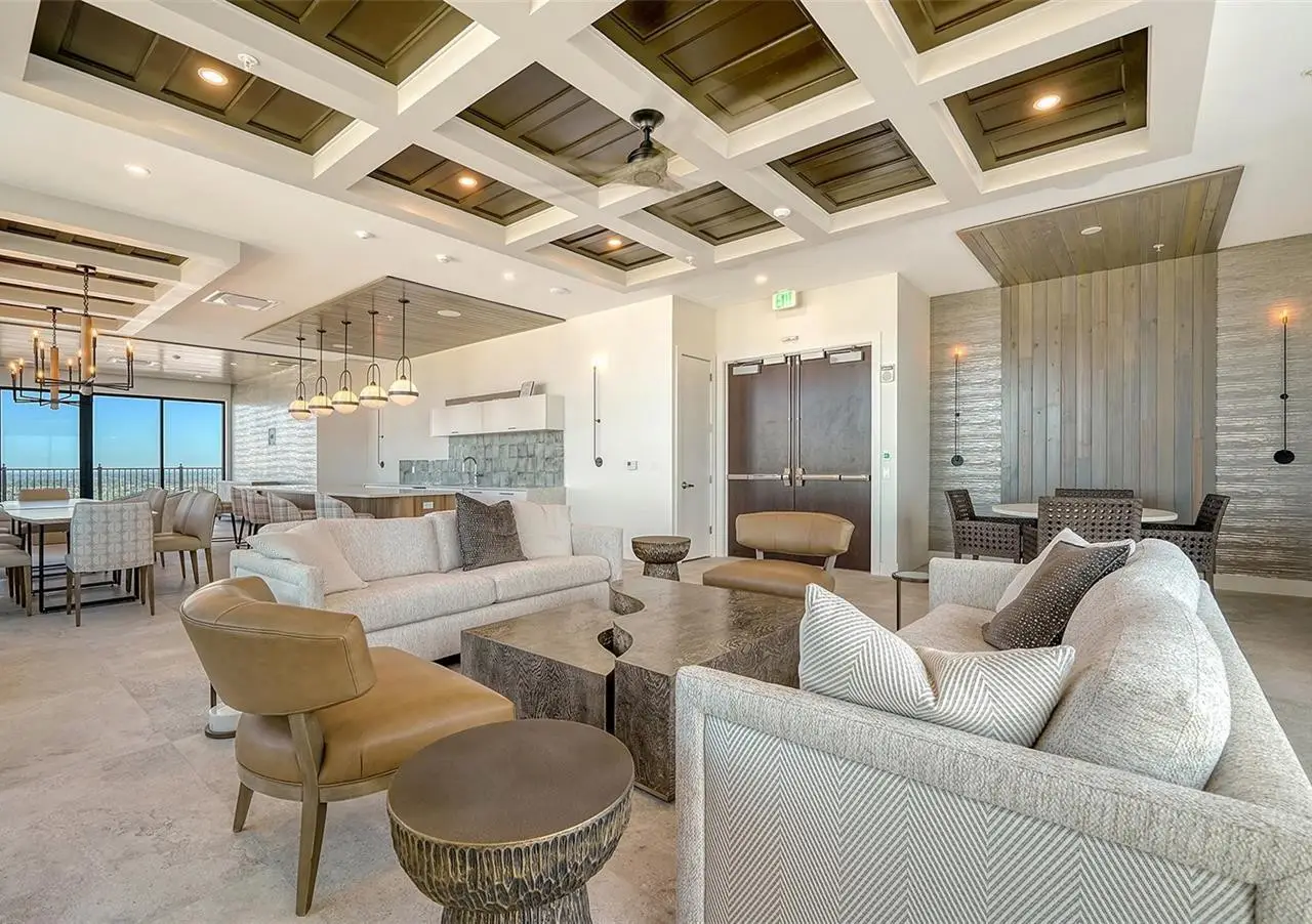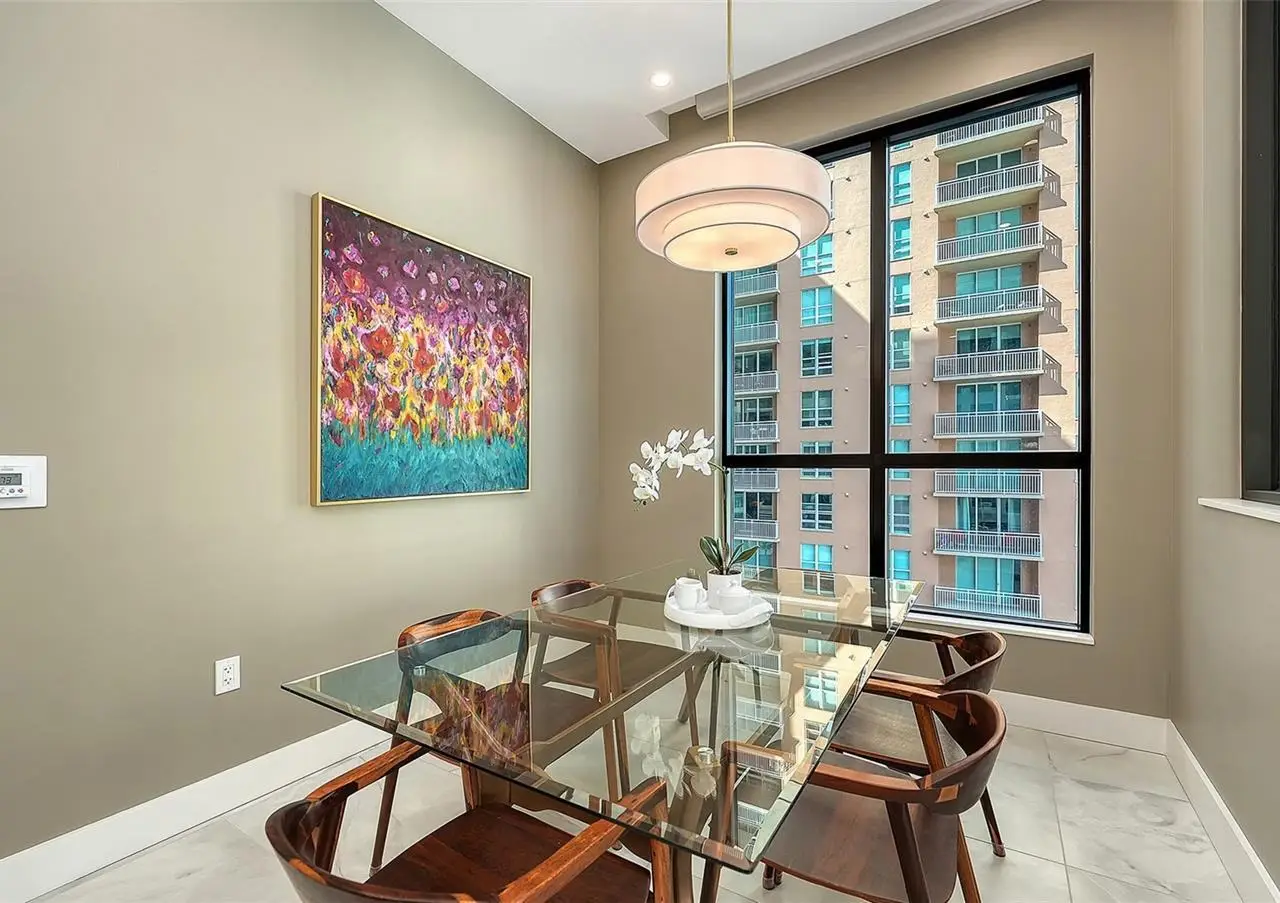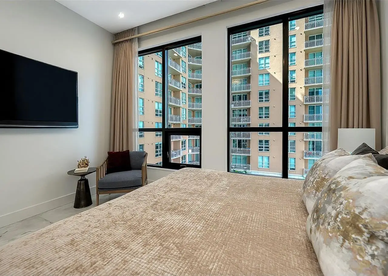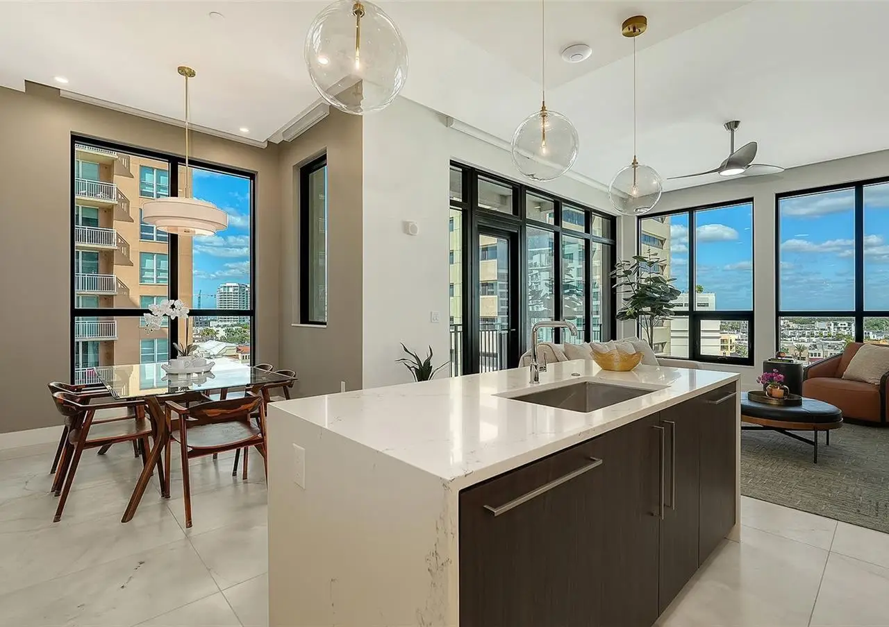 Impeccably maintained and exquisitely appointed, this corner residence embodies modern chic in Sarasota's most sought-after downtown location. Built in 2024 and defining contemporary urban living, this impeccably maintained 2-bedroom, 2-bath, 1,337 sq. ft. home reflects curated luxury. The open floorplan showcases Italian custom cabinetry, Miele appliances with a gas cooktop, and upgraded quartz countertops with a full backsplash and waterfall island. Sleek porcelain tile flooring flows throughout, while custom lighting, designer paint, and a striking fireplace with feature wall create an ambiance of understated glamour. Both bedrooms offer custom-built closets, with a Murphy bed in the second for versatile use. Automated electric blinds and custom drapery pockets enhance the clean, contemporary aesthetic. Home is complete with a temperature-controlled storage locker and a terrace that is wired for an electric barbecue. Residents of this exclusive boutique building enjoy 24-hour staffed service and access to a spectacular rooftop amenity level, featuring an elegant club room, fitness center, and saltwater pool - all framed by sweeping views of the city skyline and Sarasota Bay. The result is a tranquil retreat above the vibrant downtown scene, offering the perfect balance of sophistication, comfort, and cosmopolitan energy.