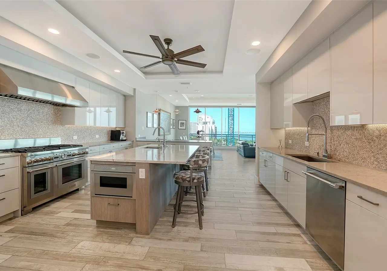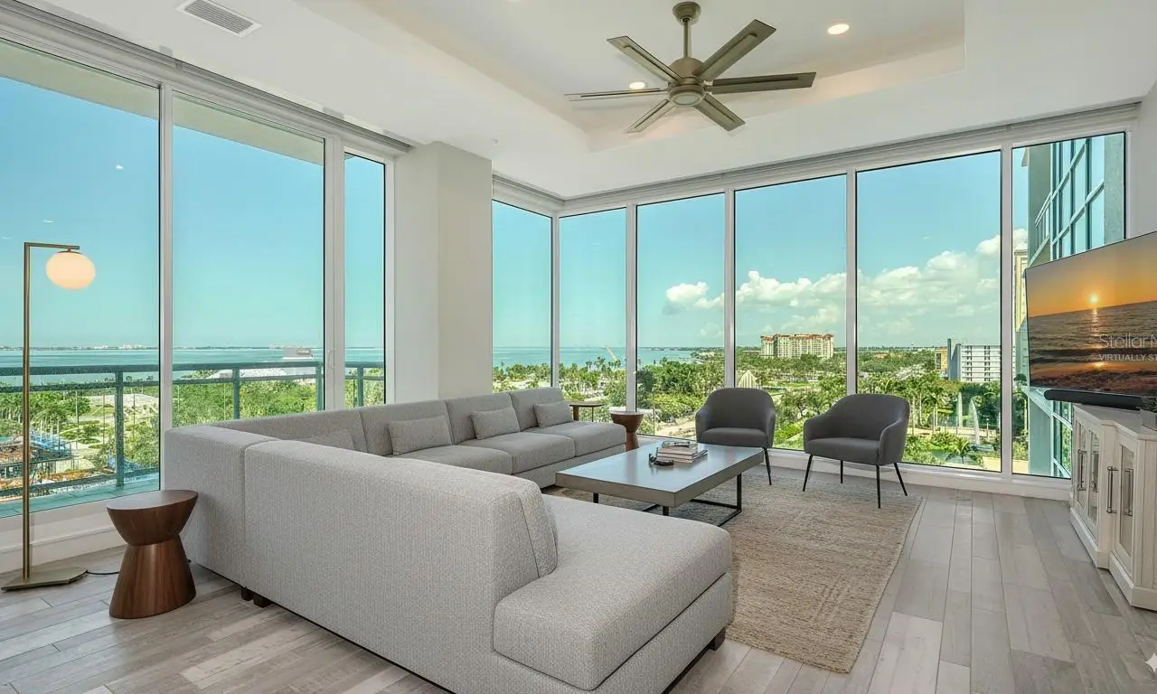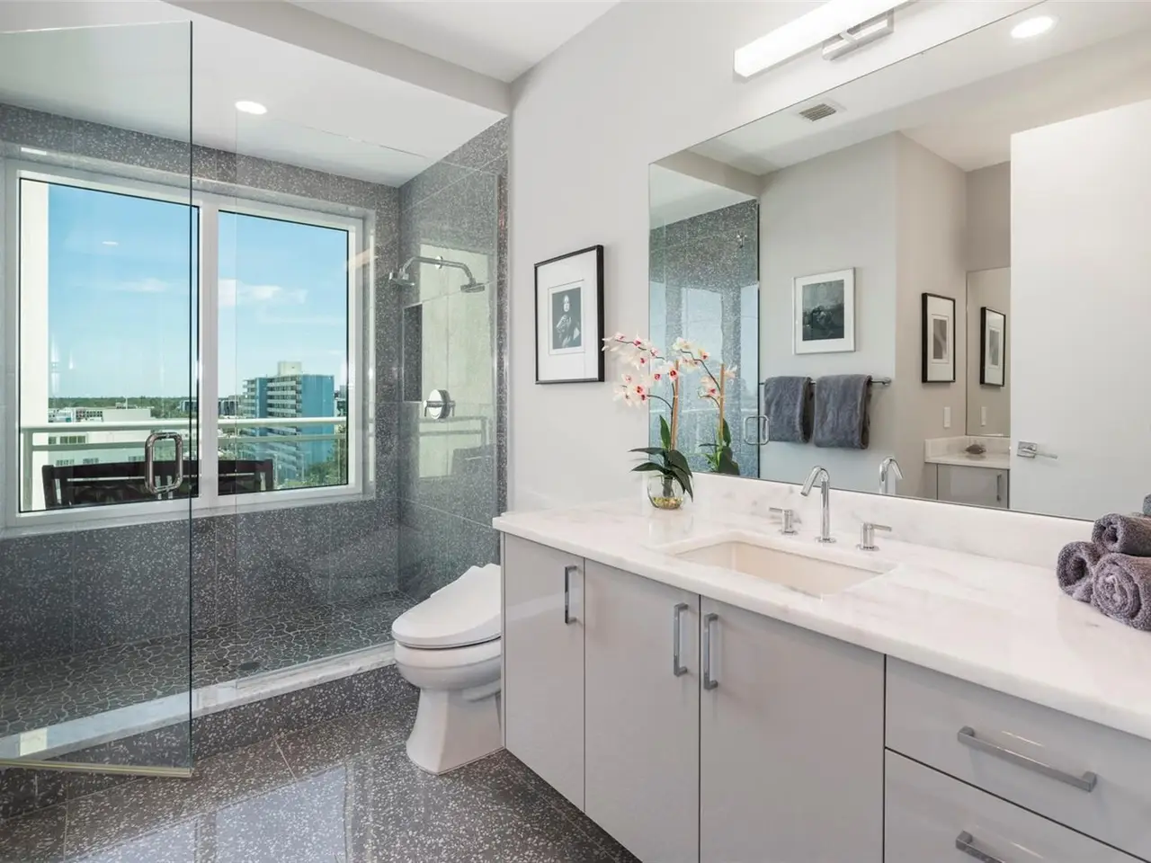 Welcome to your magnificent home in the sky at the sought-after & highly amenitized BLVD Sarasota which boasts some of the most breathtaking panoramic Bayfront and City views in all of Sarasota with second-to-none vistas, sunrises, & sunsets encapsulated by vast floor-to-ceiling impact windows and a 12' impact sliding door. This 8th floor condo in the desired 02 stack features 3 sprawling open-air terraces w/ glass railings & tile flooring, & boasts 3962 sf, 3 bedrooms, 3.5 baths & luxurious finishes & countless one-of-a-kind updates where no expense has been spared in design, material, finish, technology, or resident experience. A private access-controlled elevator opens directly into your foyer where the expansive open-concept great room & dining area & those stunning views meet the state-of-the-art Chef's kitchen. The beautiful open space includes a large working/social Caesarstone Quartz waterfall island & countertops, custom wet bar w/ Scotsman ice machine, 46 bottle Subzero wine fridge and Elkay martini-glass shaped bar sink, and chic Italian tile backsplash. High-quality stainless Thermador kitchen appliances featuring 3' refrigerator and 18" freezer, natural gas 6 burner with griddle range/dual oven, oversized hood, slide-out microwave, & upgraded dishwasher. Premium custom cabinetry w/ soft-close doors/drawers, under cabinet task lighting, & spacious pantry, complete the design forward space. 3 lavish & spacious bedroom suites each w/ private terrace access and luxurious en-suite baths w/ lighted mirrors. The primary is complete w/ spacious custom built-in with refrigerator, dual walk-in California closets & primary bath including glass/tile oversized shower w/ dual showerheads, walk-in soaking tub, floating dual sink vanities & premium cabinetry w/Caesarstone Quartz counters. A lovely powder room & separate laundry room w/ cabinetry, sink & Electrolux high-capacity front load washer/dryer with pedestals are conveniently located. Enhanced by Wicked Smart Homes, the state-of-the-art smart home system features Lutron lighting & motorized black-out & privacy shades, Sonos surround sound system w/ 6 amplifiers, in-wall subwoofer & other advanced automation, ensuring ultimate comfort/convenience. Other noteworthy residence features: Cove lighting, 8-foot-tall entry doors, solid-core interior doors many w/ custom glass, designer recessed light fixtures throughout. This unit is 1 of just a few w/ private 2-car garage (available under a separate contract) & 2 additional secure premium parking spaces & air conditioned private storage locker. BLVD, centrally located in the Rosemary District, w/ only 49 residences & its unique amenities set it apart from all other luxury condominiums on the Suncoast. Amenities include: Full building water softener, Rooftop infinity-edge pool & outdoor kitchen, fully staffed reception lobby & controlled building access, Wine Cellar w/ private lockers & wine tasting table, Pet Lawn & Grooming Station, Indoor Golf Driving Range, Owners Lounge, Conference Center & state-of-the-art Fitness Center. BLVD residents are only an elevator ride away from 1000 North, a members-only dining Club opening in 2025. Minutes to #1 rated Siesta Key Beach, retail shopping at St Armand's & all that downtown Sarasota has to offer. Rarely does a home of this caliber become available - don't miss the chance to own a piece of Sarasota's most coveted address.