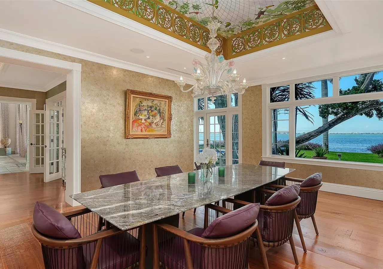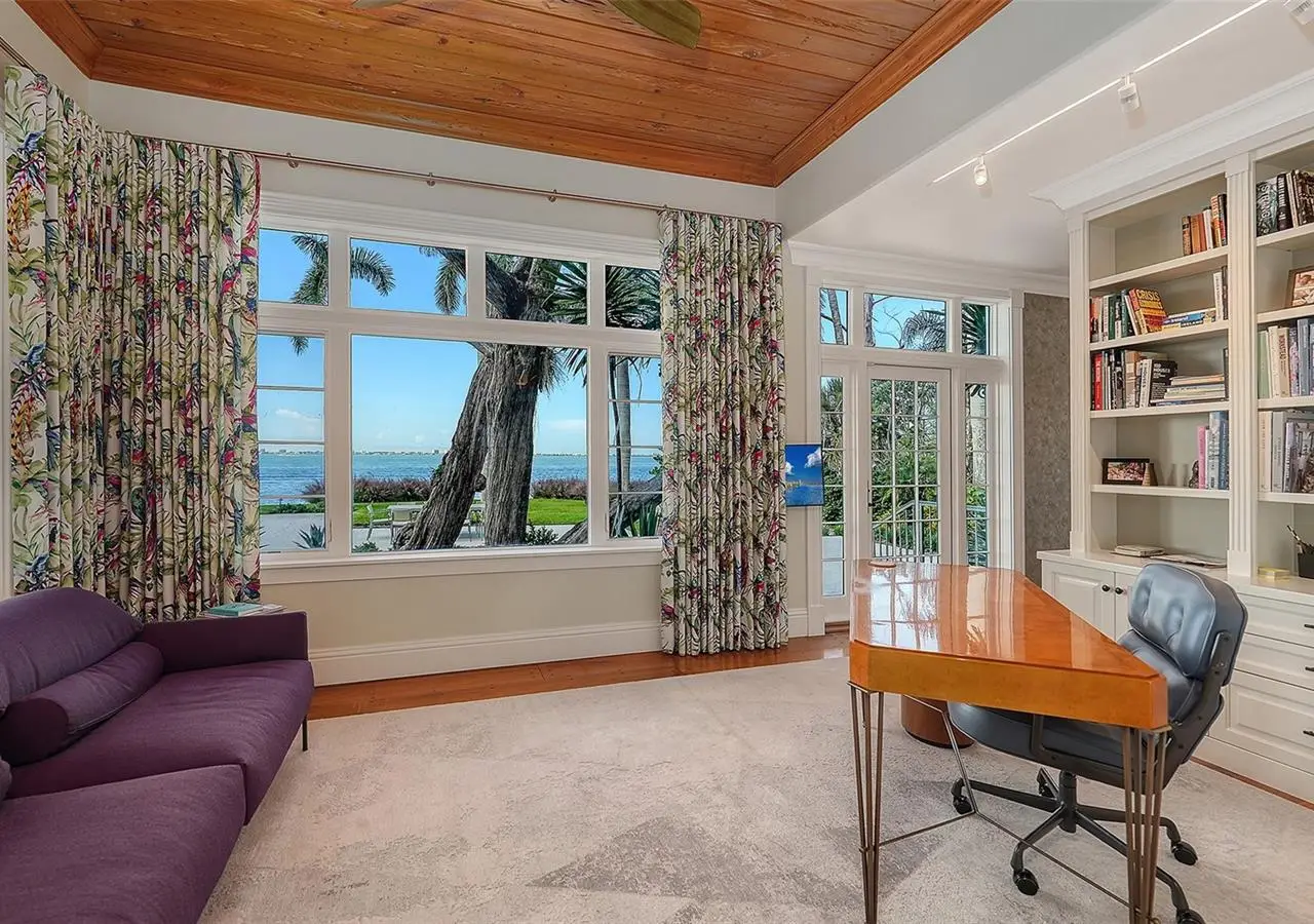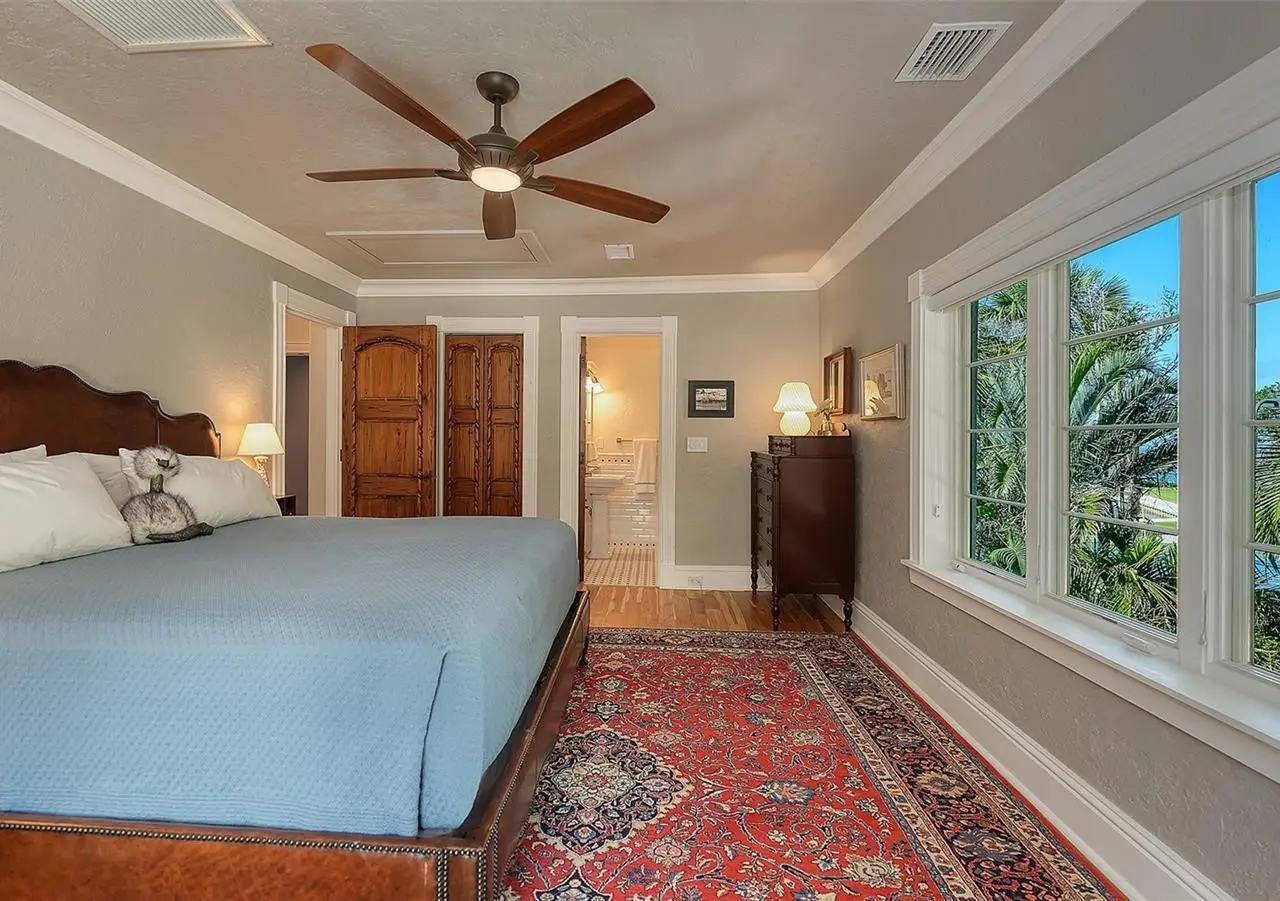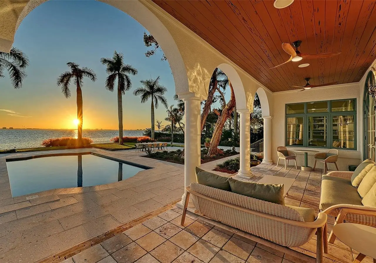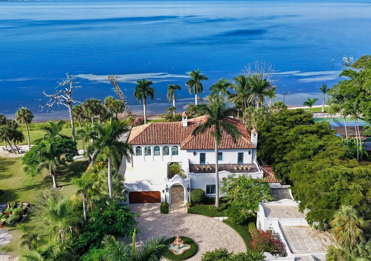 STUNNING BAYFRONT ESTATE at an incredible price. Located in the Indian Beach–Sapphire Shores neighborhood, this 1925 Mediterranean estate sits on nearly three-quarters of an acre with sweeping views of Sarasota Bay—from the downtown skyline and Ringling Bridge to the northern tip of Longboat Key. Meticulously updated while maintaining its original character, the home blends historic craftsmanship with modern comfort. Behind the gated entry, a koi pond and circular drive with a central fountain lead to a welcoming courtyard featuring four garage spaces. The main living areas are defined by high ceilings, detailed millwork, and generous natural light. The formal living room features a coffered ceiling and marble fireplace, while the adjoining dining room offers bay views, custom built-ins, and a hand-painted recessed ceiling. The newly renovated kitchen includes a Sub-Zero refrigerator, AGA induction range, dolomite countertops, and breakfast area. The den/office overlooks the pool and bay, and the grand salon—with its soaring ceilings, stately fireplace, and 10-foot arched doors—opens to a large covered terrace ideal for entertaining or enjoying the spectacular sunsets. Upstairs are three ensuite bedrooms, each with access to a private terrace. The primary suite, fully redesigned in 2021, includes a spacious walk-in closet, and a luxurious bath with soaking tub, and walk-in shower. Landscape architect Michael Gilkey transformed the grounds into multiple outdoor spaces featuring a lush tropical garden, bocce court, tiled heated pool, and ample patio space. A separate guesthouse offers two rooms, 2 baths, and a kitchenette, easily configured as two ensuite bedrooms. Additional updates include new HVAC systems, air-conditioned garages, new seawall (2022), upgraded electrical and lighting, and impact-rated windows and doors. A rare blend of history, privacy, and waterfront elegance. Book your private showing today.