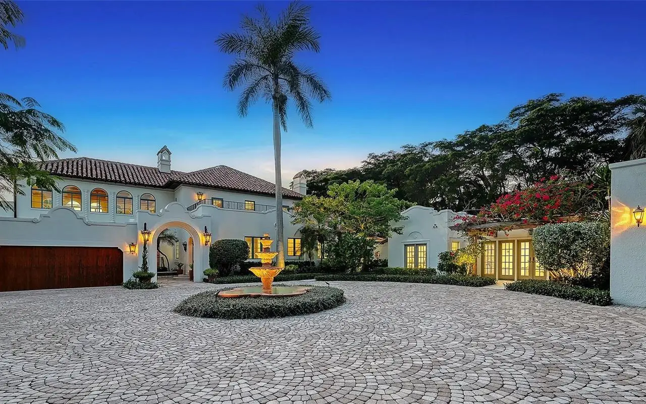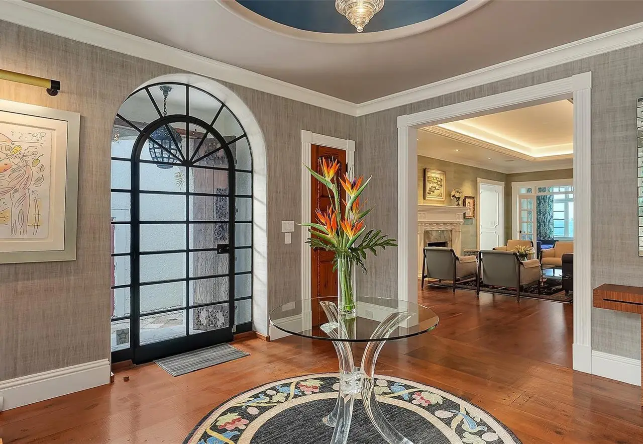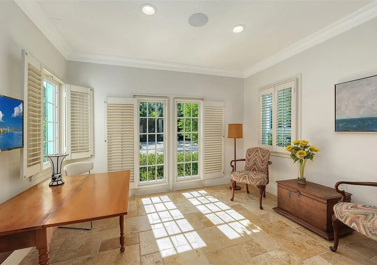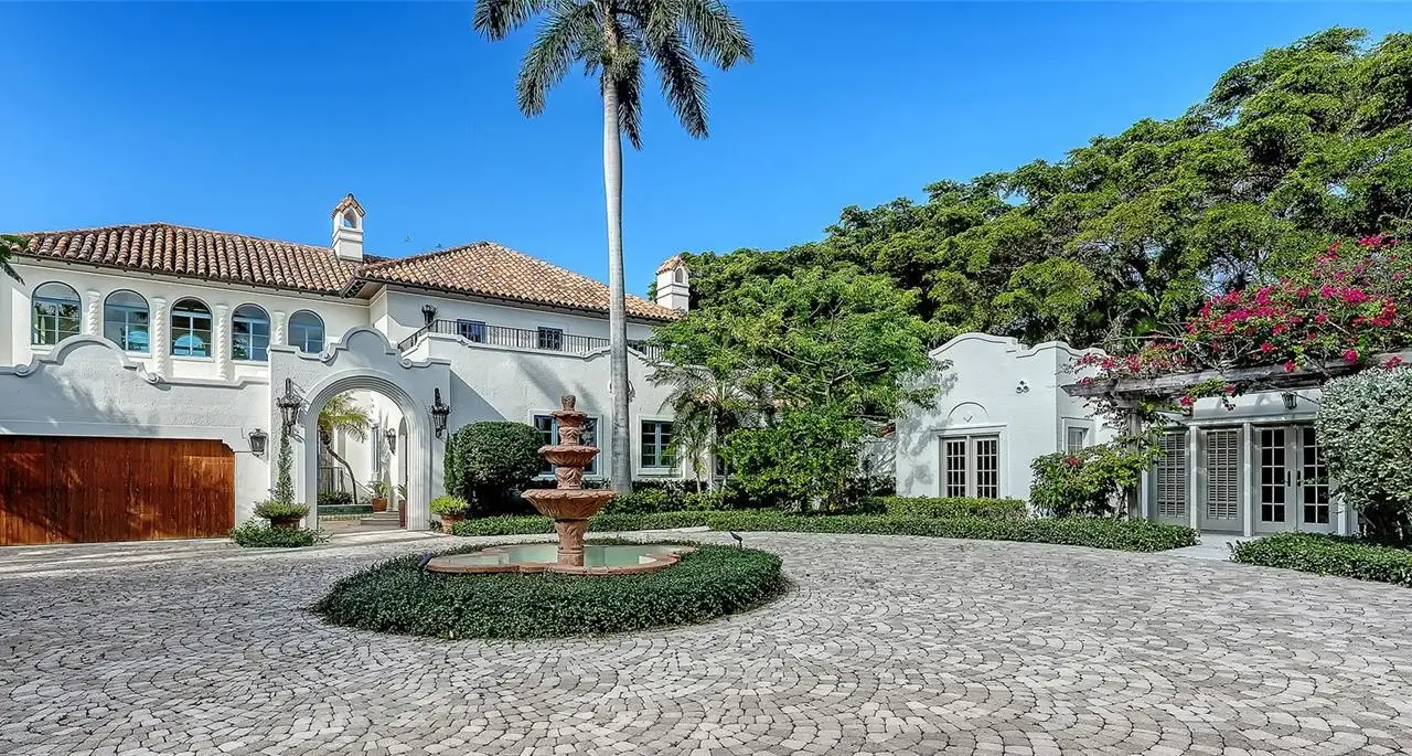 STUNNING BAYFRONT ESTATE at an incredible price. Located in the Indian Beach–Sapphire Shores neighborhood, this 1925 Mediterranean estate sits on nearly three-quarters of an acre with sweeping views of Sarasota Bay—from the downtown skyline and Ringling Bridge to the northern tip of Longboat Key. Meticulously updated while maintaining its original character, the home blends historic craftsmanship with modern comfort. Behind the gated entry, a koi pond and circular drive with a central fountain lead to a welcoming courtyard featuring four garage spaces. The main living areas are defined by high ceilings, detailed millwork, and generous natural light. The formal living room features a coffered ceiling and marble fireplace, while the adjoining dining room offers bay views, custom built-ins, and a hand-painted recessed ceiling. The newly renovated kitchen includes a Sub-Zero refrigerator, AGA induction range, dolomite countertops, and breakfast area. The den/office overlooks the pool and bay, and the grand salon—with its soaring ceilings, stately fireplace, and 10-foot arched doors—opens to a large covered terrace ideal for entertaining or enjoying the spectacular sunsets. Upstairs are three ensuite bedrooms, each with access to a private terrace. The primary suite, fully redesigned in 2021, includes a spacious walk-in closet, and a luxurious bath with soaking tub, and walk-in shower. Landscape architect Michael Gilkey transformed the grounds into multiple outdoor spaces featuring a lush tropical garden, bocce court, tiled heated pool, and ample patio space. A separate guesthouse offers two rooms, 2 baths, and a kitchenette, easily configured as two ensuite bedrooms. Additional updates include new HVAC systems, air-conditioned garages, new seawall (2022), upgraded electrical and lighting, and impact-rated windows and doors. A rare blend of history, privacy, and waterfront elegance. Book your private showing today.