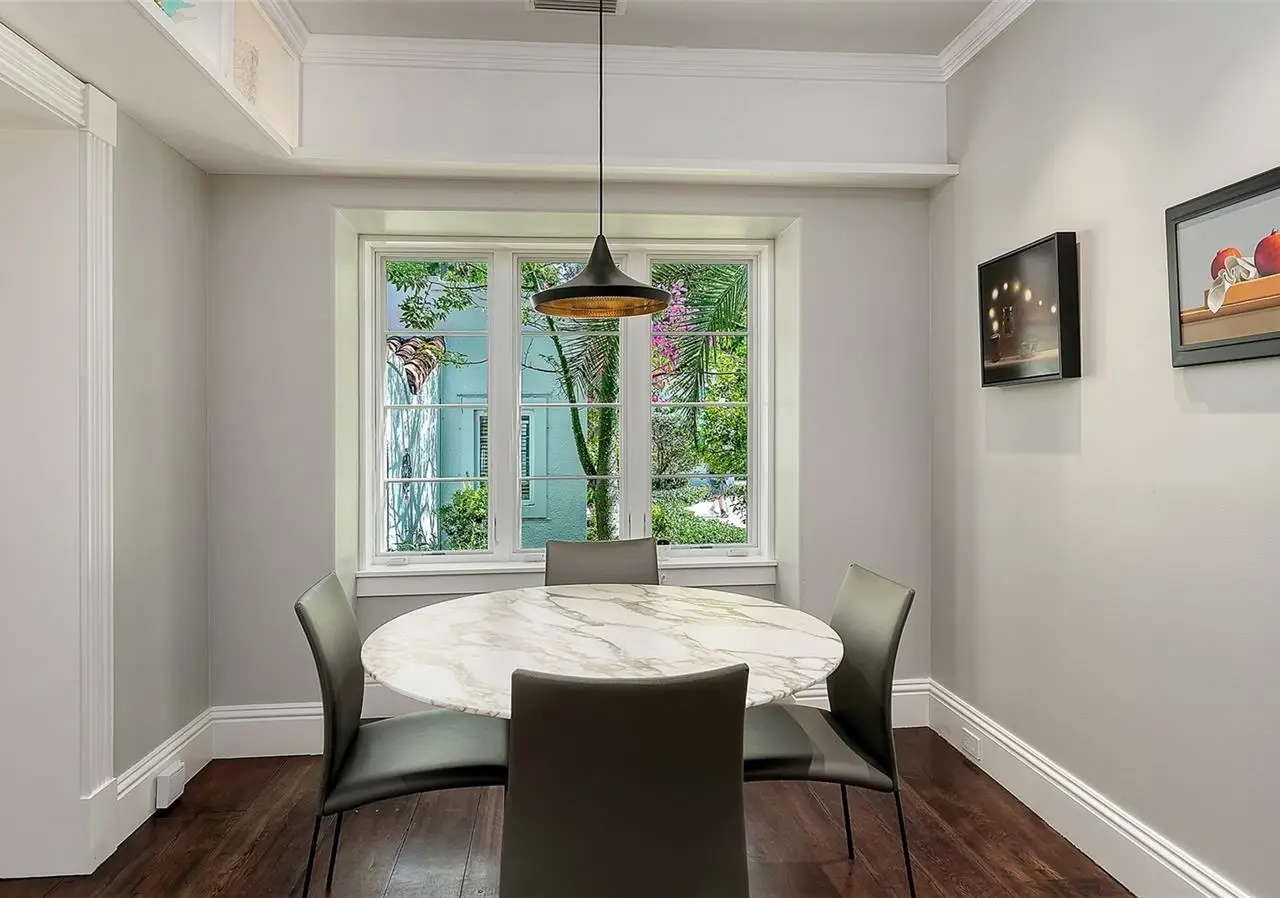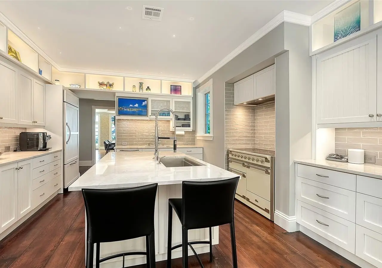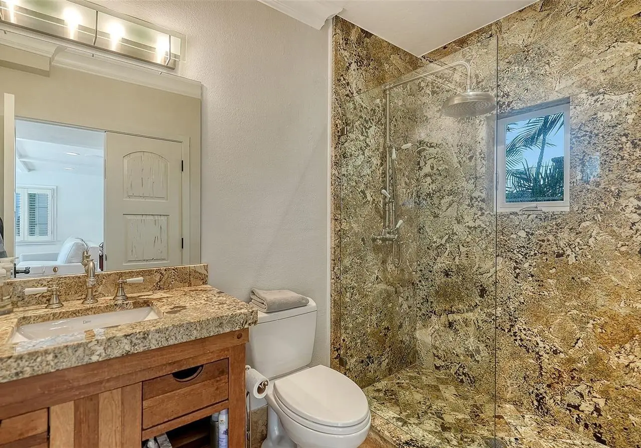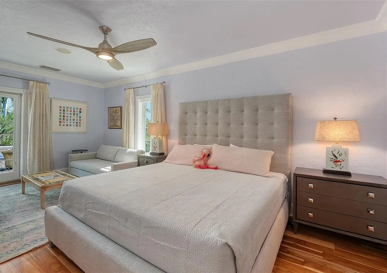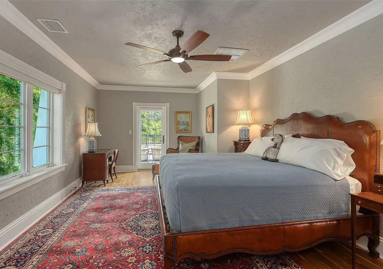STUNNING BAYFRONT ESTATE at an incredible price. Located in the Indian Beach–Sapphire Shores neighborhood, this 1925 Mediterranean estate sits on nearly three-quarters of an acre with sweeping views of Sarasota Bay—from the downtown skyline and Ringling Bridge to the northern tip of Longboat Key. Meticulously updated while maintaining its original character, the home blends historic craftsmanship with modern comfort. Behind the gated entry, a koi pond and circular drive with a central fountain lead to a welcoming courtyard featuring four garage spaces. The main living areas are defined by high ceilings, detailed millwork, and generous natural light. The formal living room features a coffered ceiling and marble fireplace, while the adjoining dining room offers bay views, custom built-ins, and a hand-painted recessed ceiling. The newly renovated kitchen includes a Sub-Zero refrigerator, AGA induction range, dolomite countertops, and breakfast area. The den/office overlooks the pool and bay, and the grand salon—with its soaring ceilings, stately fireplace, and 10-foot arched doors—opens to a large covered terrace ideal for entertaining or enjoying the spectacular sunsets. Upstairs are three ensuite bedrooms, each with access to a private terrace. The primary suite, fully redesigned in 2021, includes a spacious walk-in closet, and a luxurious bath with soaking tub, and walk-in shower. Landscape architect Michael Gilkey transformed the grounds into multiple outdoor spaces featuring a lush tropical garden, bocce court, tiled heated pool, and ample patio space. A separate guesthouse offers two rooms, 2 baths, and a kitchenette, easily configured as two ensuite bedrooms. Additional updates include new HVAC systems, air-conditioned garages, new seawall (2022), upgraded electrical and lighting, and impact-rated windows and doors. A rare blend of history, privacy, and waterfront elegance. Book your private showing today.
