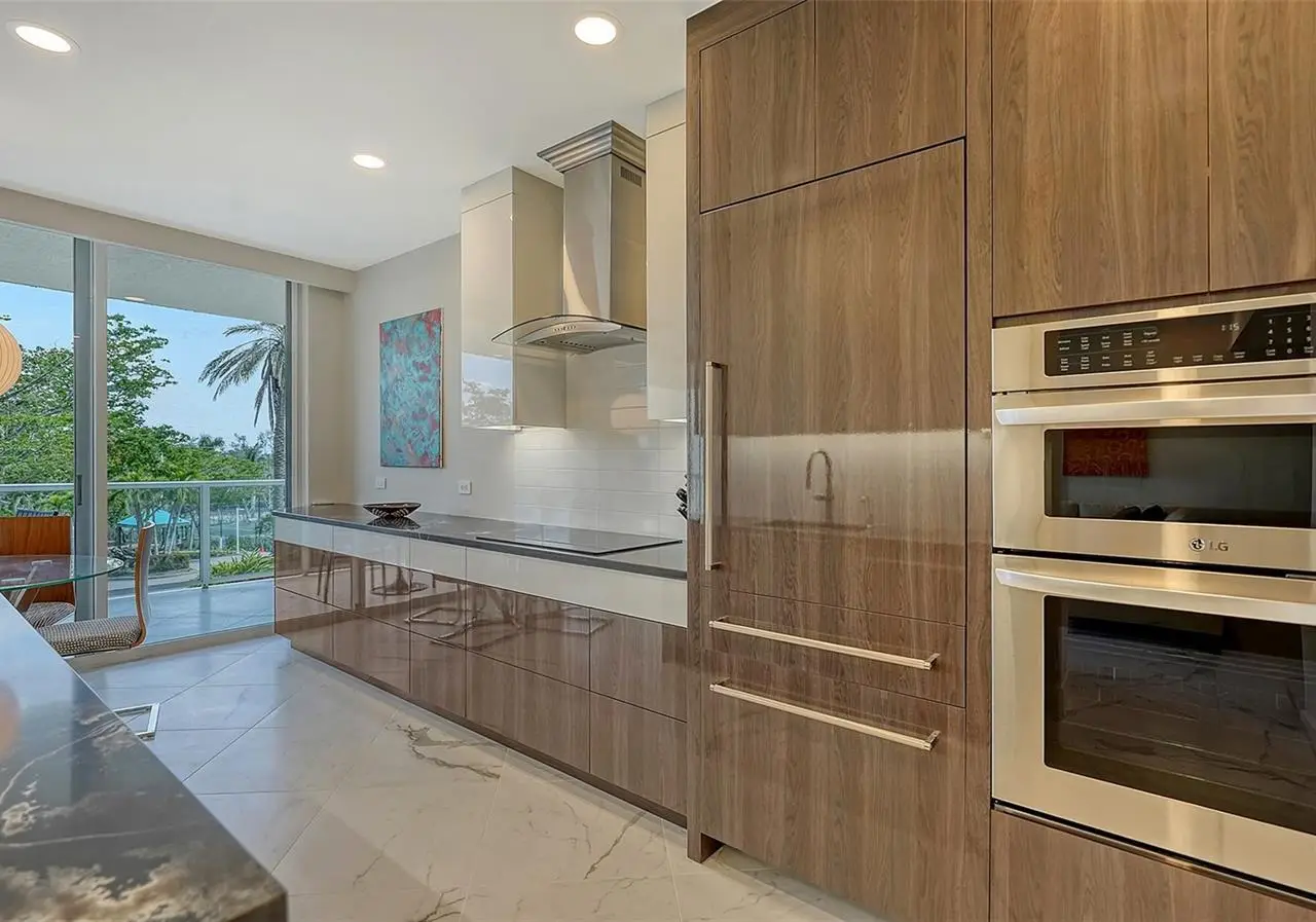 Sleek European cabinetry and high-end appliances
