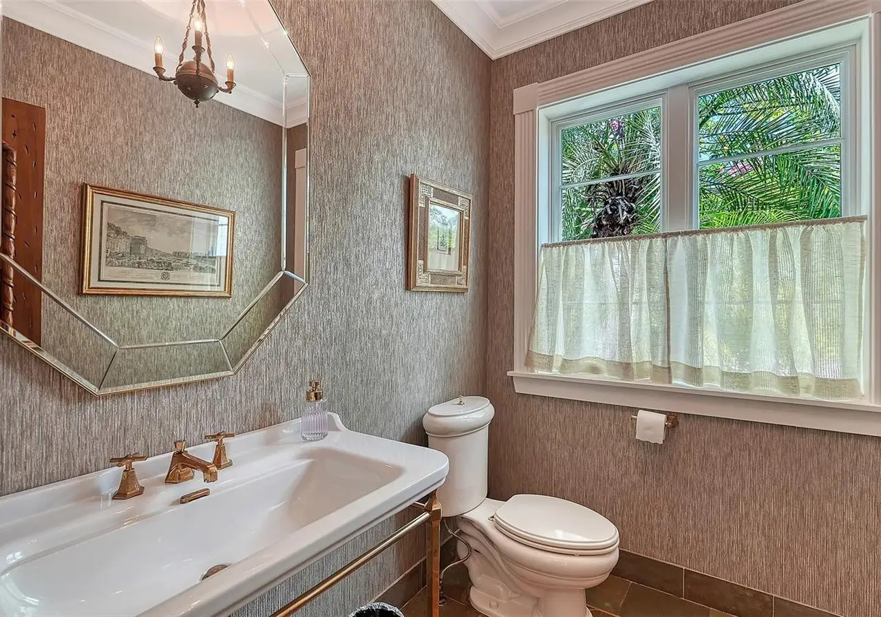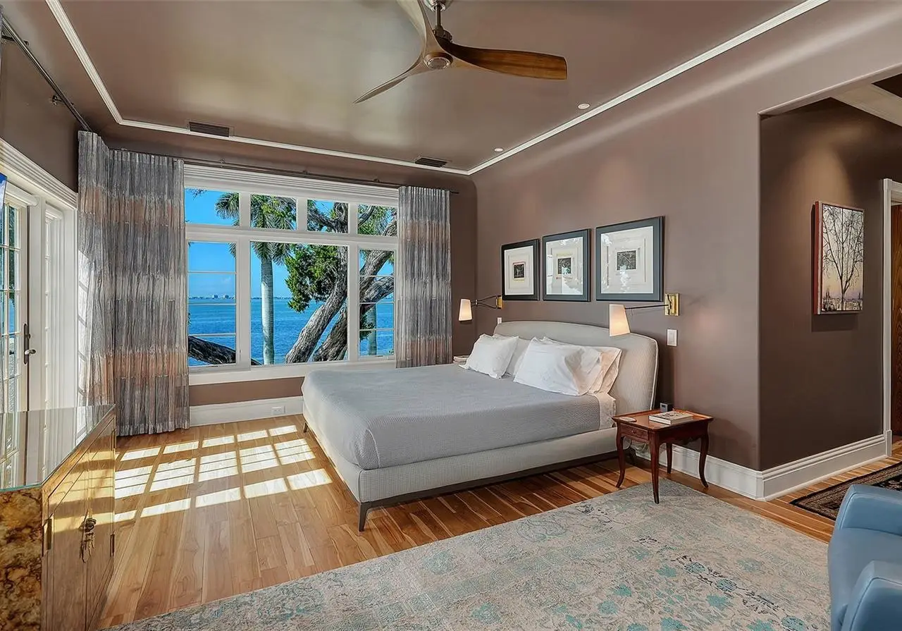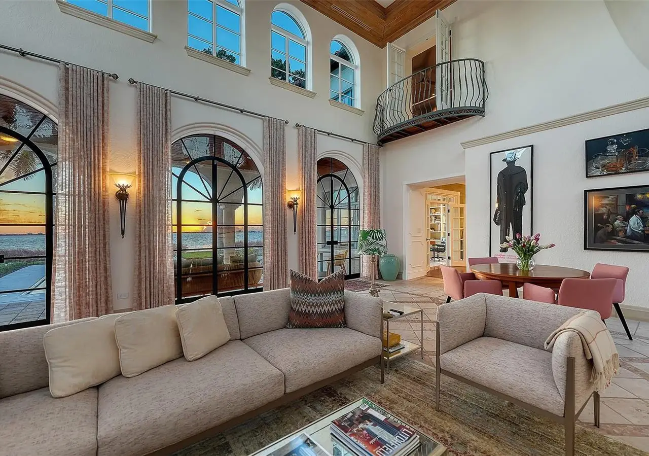 STUNNING BAYFRONT ESTATE at an incredible price. Located in the Indian Beach–Sapphire Shores neighborhood, this 1925 Mediterranean estate sits on nearly three-quarters of an acre with sweeping views of Sarasota Bay—from the downtown skyline and Ringling Bridge to the northern tip of Longboat Key. Meticulously updated while maintaining its original character, the home blends historic craftsmanship with modern comfort. Behind the gated entry, a koi pond and circular drive with a central fountain lead to a welcoming courtyard featuring four garage spaces. The main living areas are defined by high ceilings, detailed millwork, and generous natural light. The formal living room features a coffered ceiling and marble fireplace, while the adjoining dining room offers bay views, custom built-ins, and a hand-painted recessed ceiling. The newly renovated kitchen includes a Sub-Zero refrigerator, AGA induction range, dolomite countertops, and breakfast area. The den/office overlooks the pool and bay, and the grand salon—with its soaring ceilings, stately fireplace, and 10-foot arched doors—opens to a large covered terrace ideal for entertaining or enjoying the spectacular sunsets. Upstairs are three ensuite bedrooms, each with access to a private terrace. The primary suite, fully redesigned in 2021, includes a spacious walk-in closet, and a luxurious bath with soaking tub, and walk-in shower. Landscape architect Michael Gilkey transformed the grounds into multiple outdoor spaces featuring a lush tropical garden, bocce court, tiled heated pool, and ample patio space. A separate guesthouse offers two rooms, 2 baths, and a kitchenette, easily configured as two ensuite bedrooms. Additional updates include new HVAC systems, air-conditioned garages, new seawall (2022), upgraded electrical and lighting, and impact-rated windows and doors. A rare blend of history, privacy, and waterfront elegance. Book your private showing today.